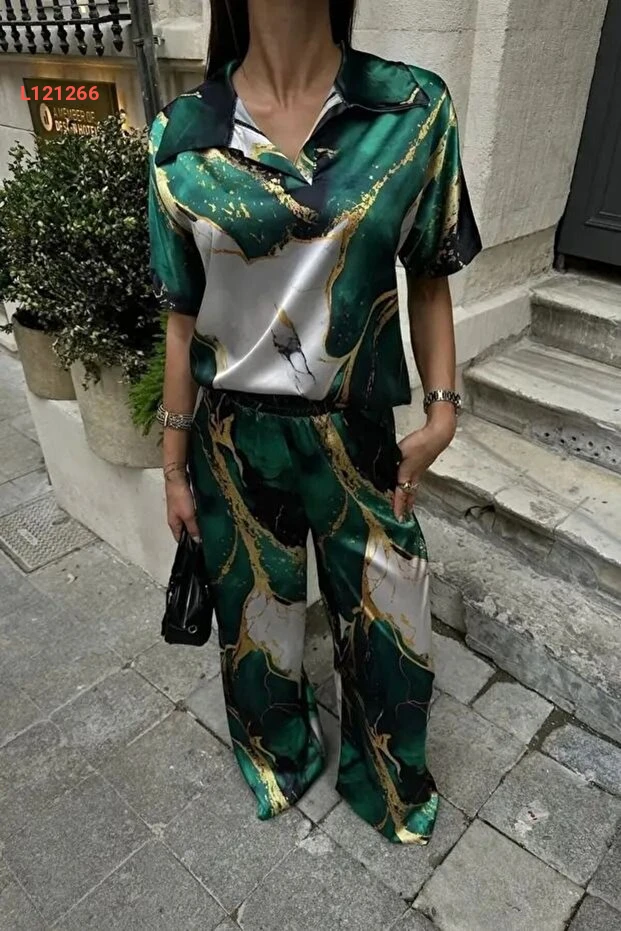 مجموعة بلوزة وسروال واسع من القماش الساتان المزخرف للنساء