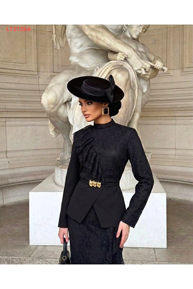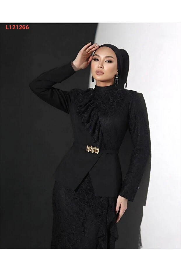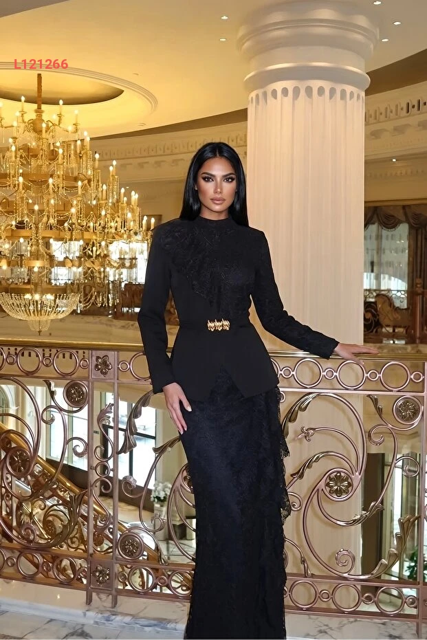 استمتع بأناقة لا مثيل لها مع مجموعة 1Moda1Tarz، التي تضم سترة وتنانير مصنوعة من قماش الكريب والدانتيل الفاخر. يأتي التصميم الفريد مع ياقة مرتفعة وحزام يبرز الخصر، مما يضفي لمسة عصرية وجذابة على إطلالتك. مثالية للمناسبات الخاصة، هذه المجموعة تجمع بين الراحة والأناقة لتجعلك دائماً في قمة التألق.