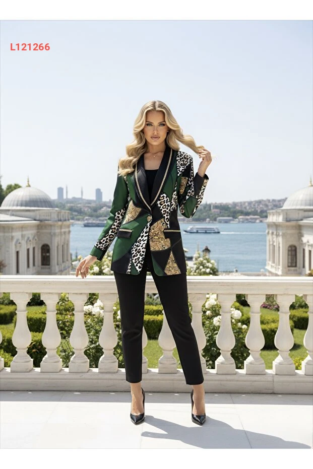 سروال وست بليزر بموديل فخم من قماش النمر ذهبي التفاصيل مع بطانة تصميم خاص