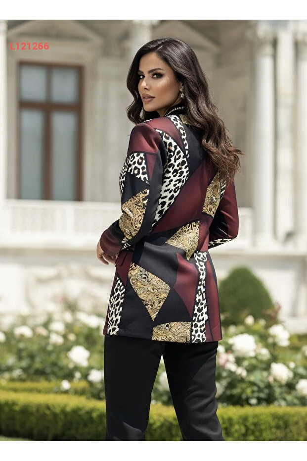 طقم جاكيت وسروال أنيق بتصميم خاص من قماش الجلود الفاخر بنقشة الفهد وزخارف ذهبية