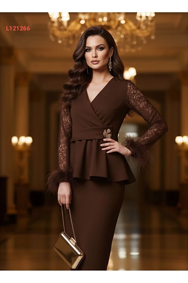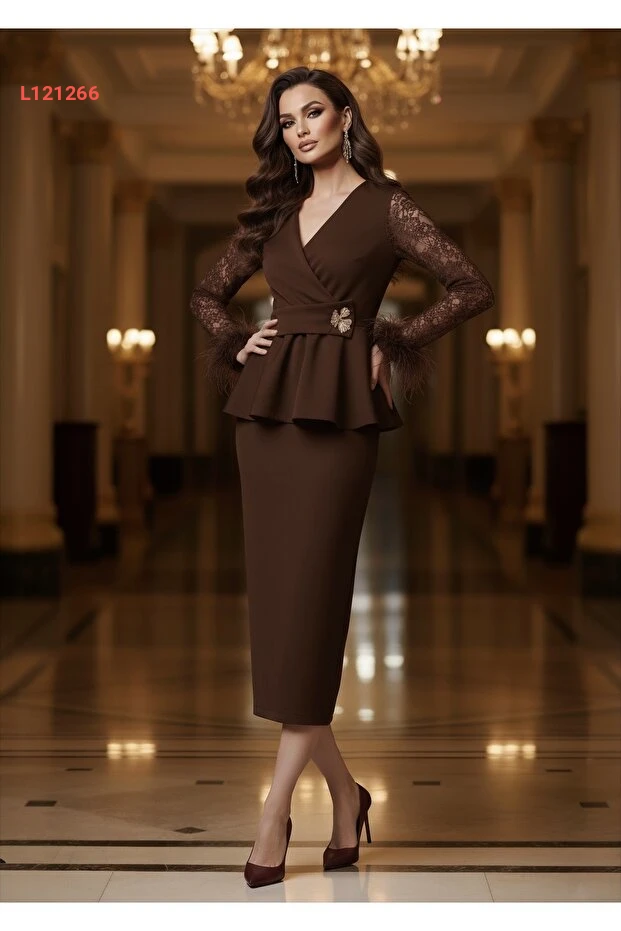 طقم مصمم خاص مع تفاصيل كشكش من قماش دانتيل وثمانين مع بطانة وأكسسوار مرفق