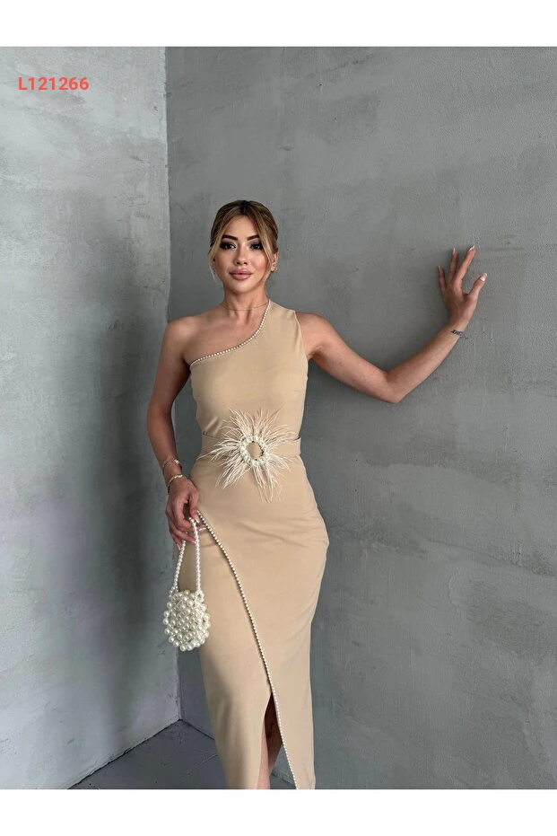 فستان نسائي بتصميم عصري، كتف واحد، مزين بالخرز وتفاصيل الريش، قماش مستورد مع بطانة