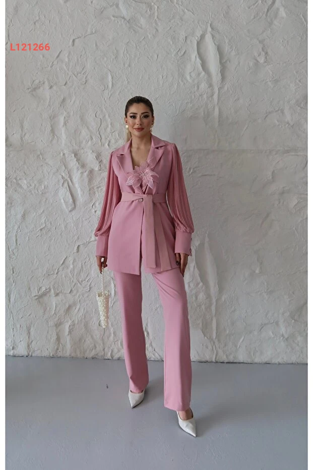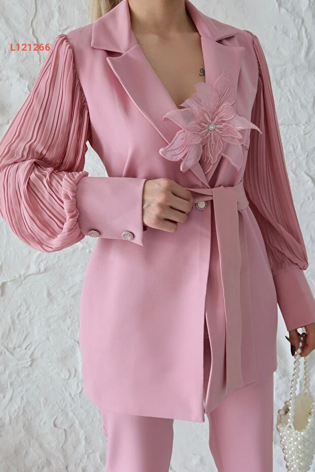 طقم نسائي خاص بتصميم مميز من قماش الأطلنطي المستورد بأكمام شيفون وورود بارزة