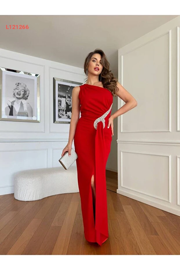 فستان بتصميم خاص مزين بتفاصيل إكسسوار من قماش مستورد باللون الأحمر مع بطانة وفتحات أنيقة للنساء
