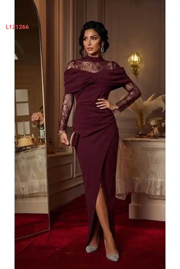 فستان بتصميم خاص مع دانتيل وخرز من القماش سكوبا وكمامة للعنق