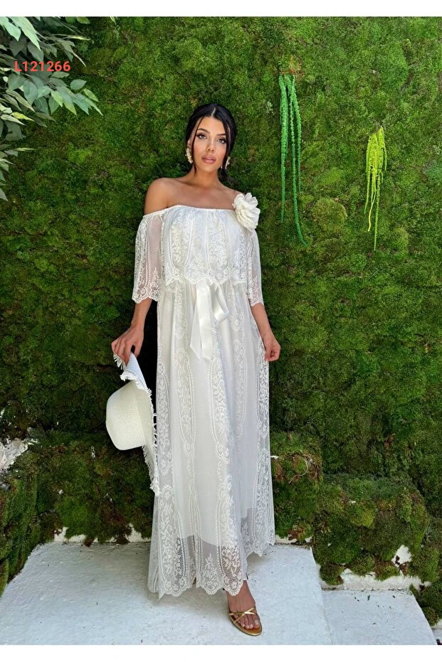 تألقي مع فستان 1Moda1Tarz الأبيض الفاتن، المصنوع من الدانتيل الفاخر وقماش الجيبور المتميز، والذي يضفي لمسة من الأناقة والأنوثة على إطلالتك. يتميز بتفاصيل الورد الرقيقة وحزامه الجذاب، كما يأتي مع بطانة لراحة مثالية، مما يجعله الخيار المثالي للمناسبات الخاصة أو الخروجات اليومية. اجعلي كل لحظة مميزة مع هذا التصميم الأنيق!