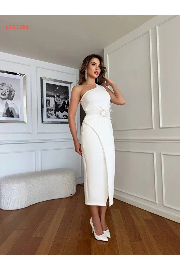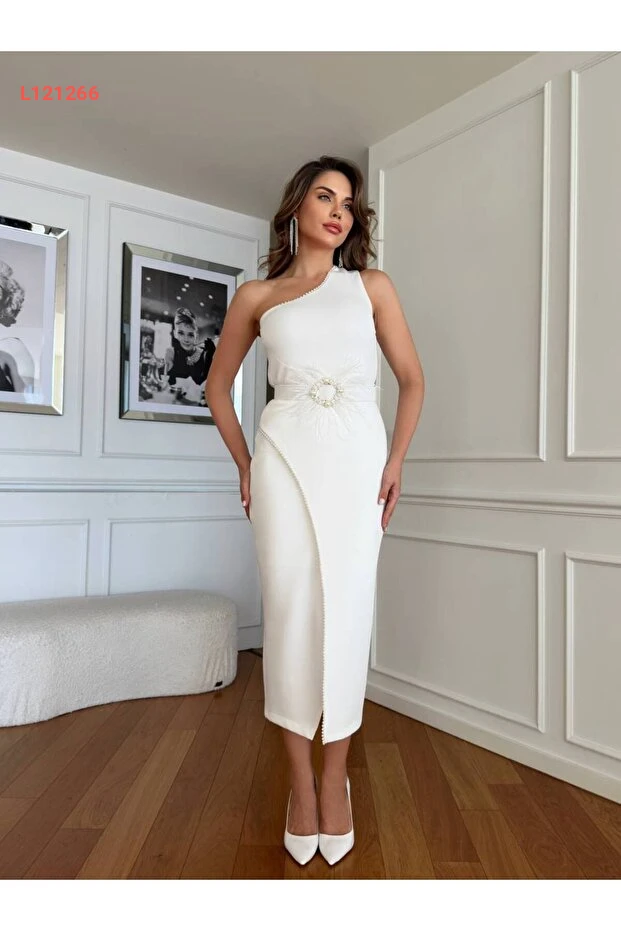 فستان تصميم أنيق للنساء بلون أبيض بتفاصيل كيمر وخرز من قماش مستورد وكتف واحد