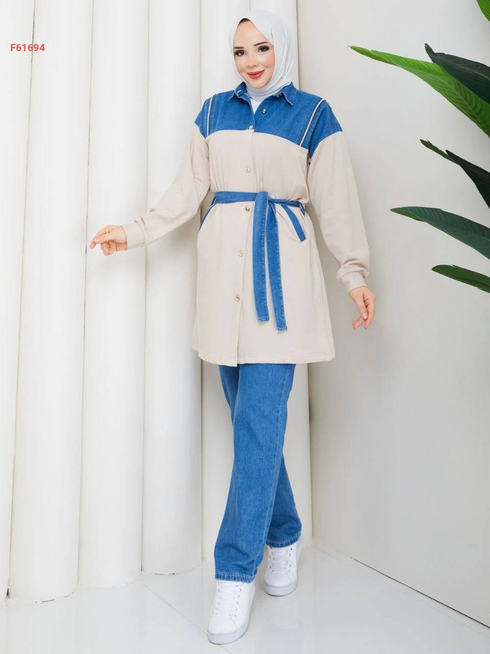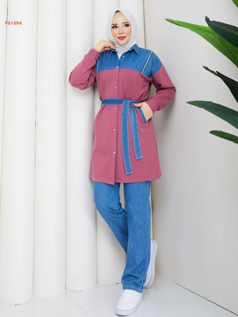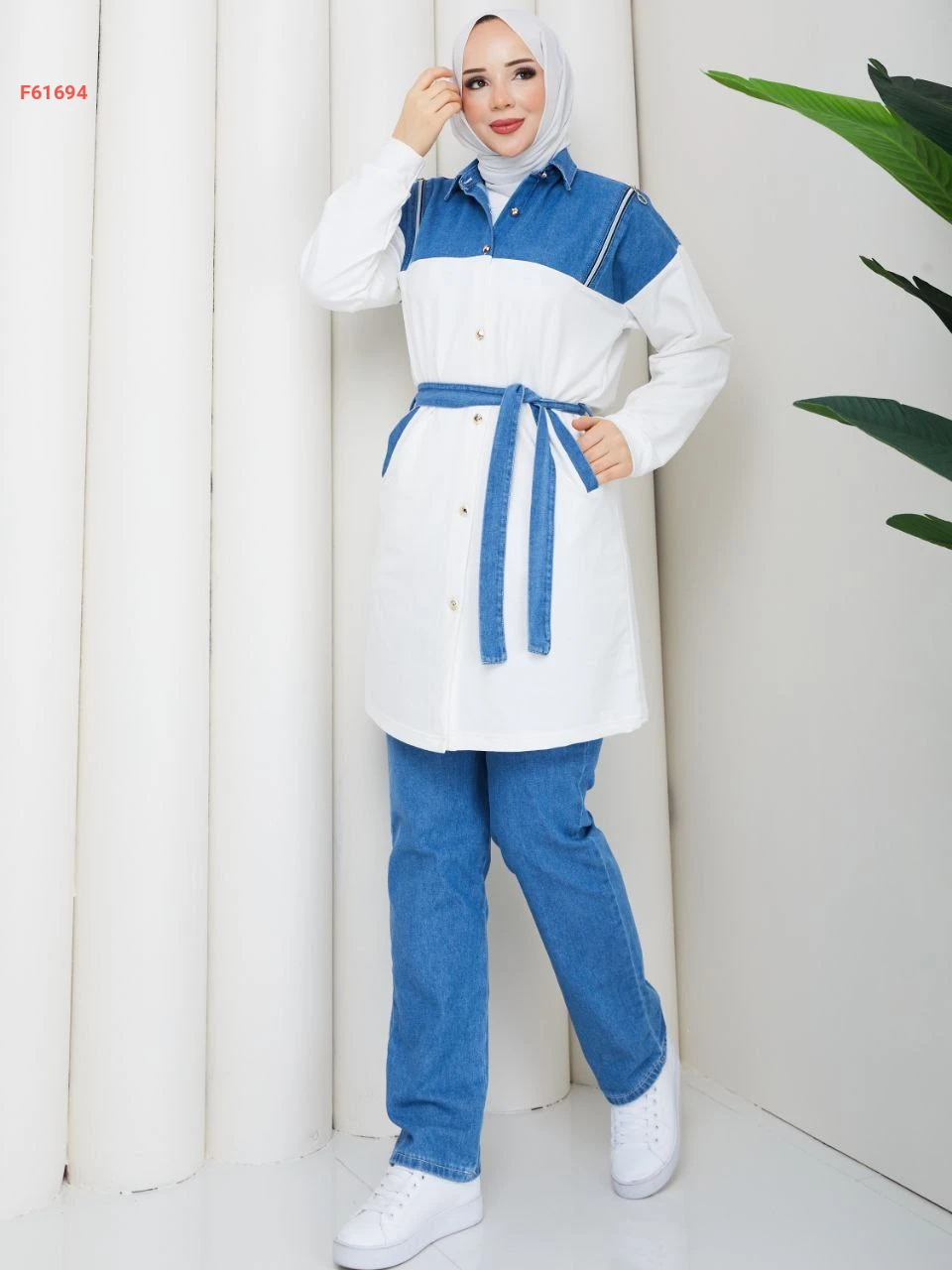 طقم جينز 3 قطع بأزرار مع حزام وجيب
