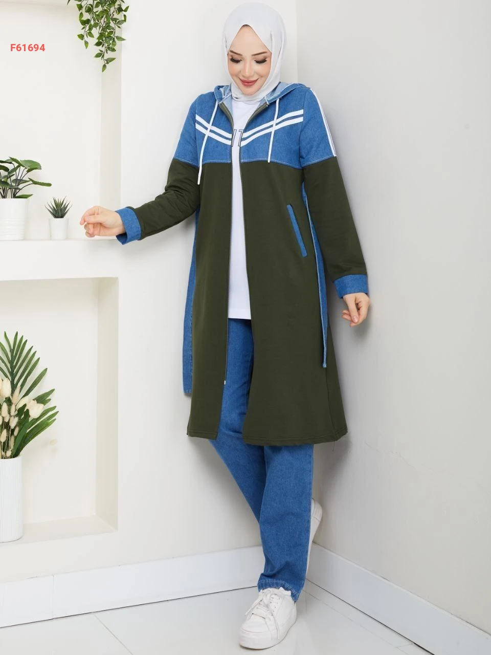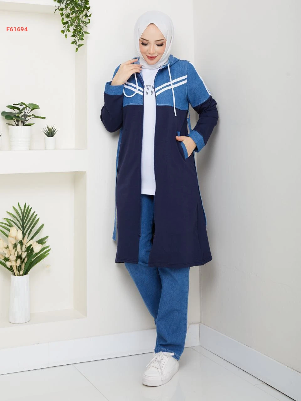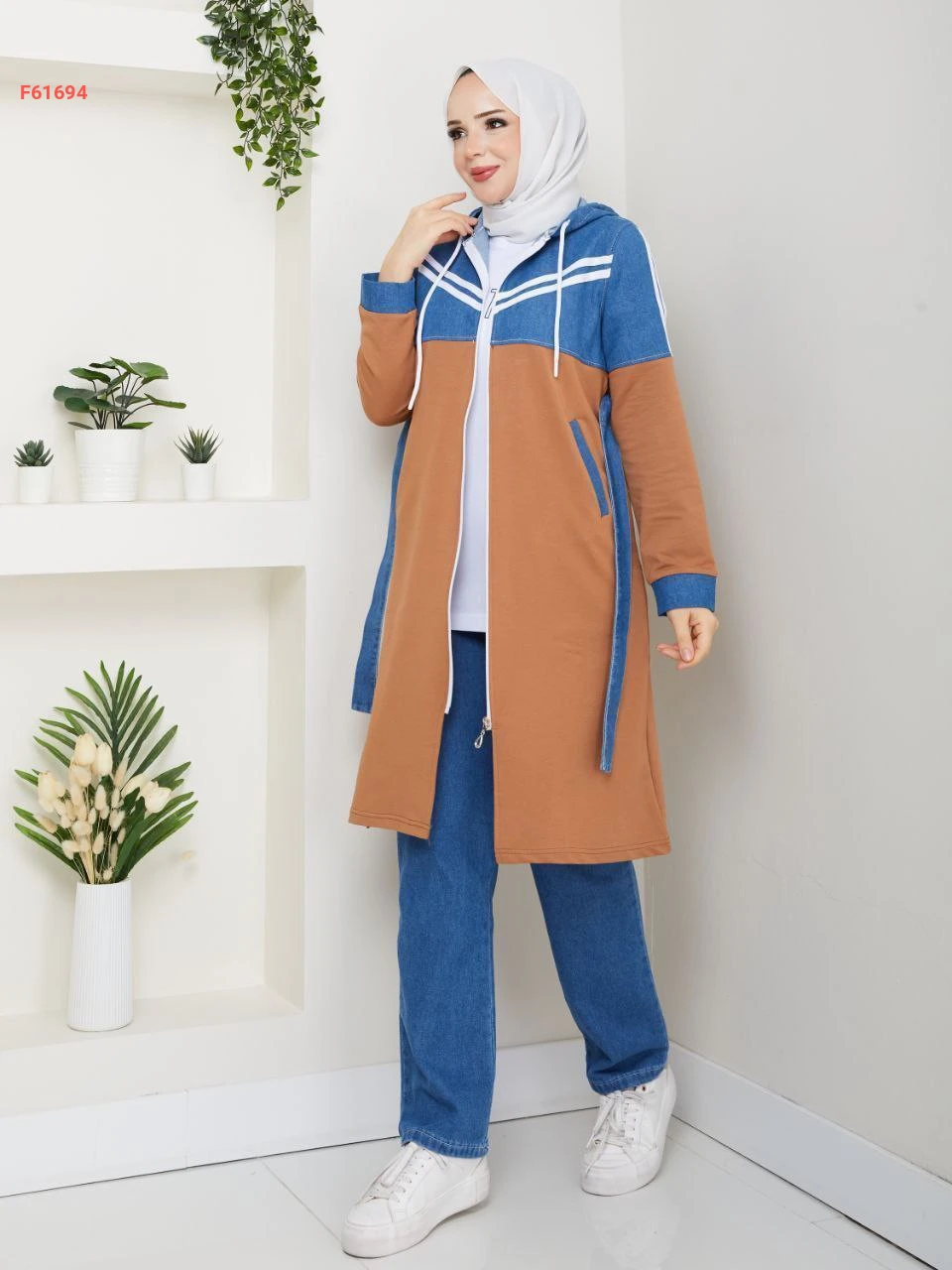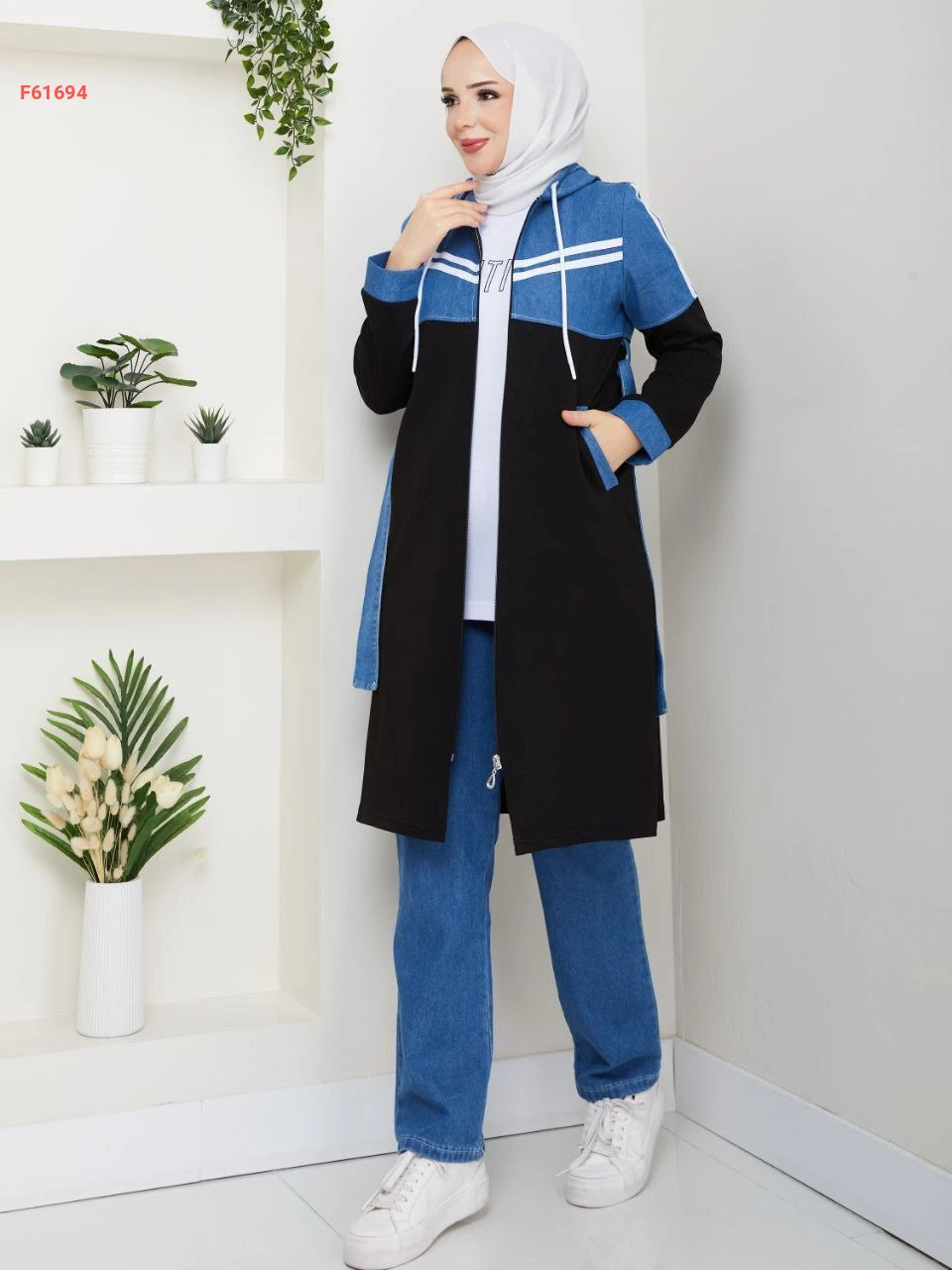طقم جينز 3 قطع بسحاب مع حزام بغطاء رأس وجيب