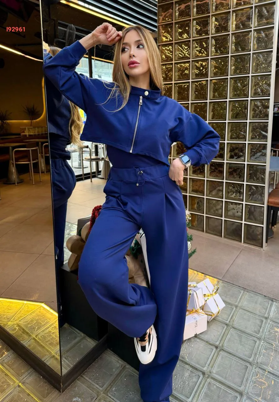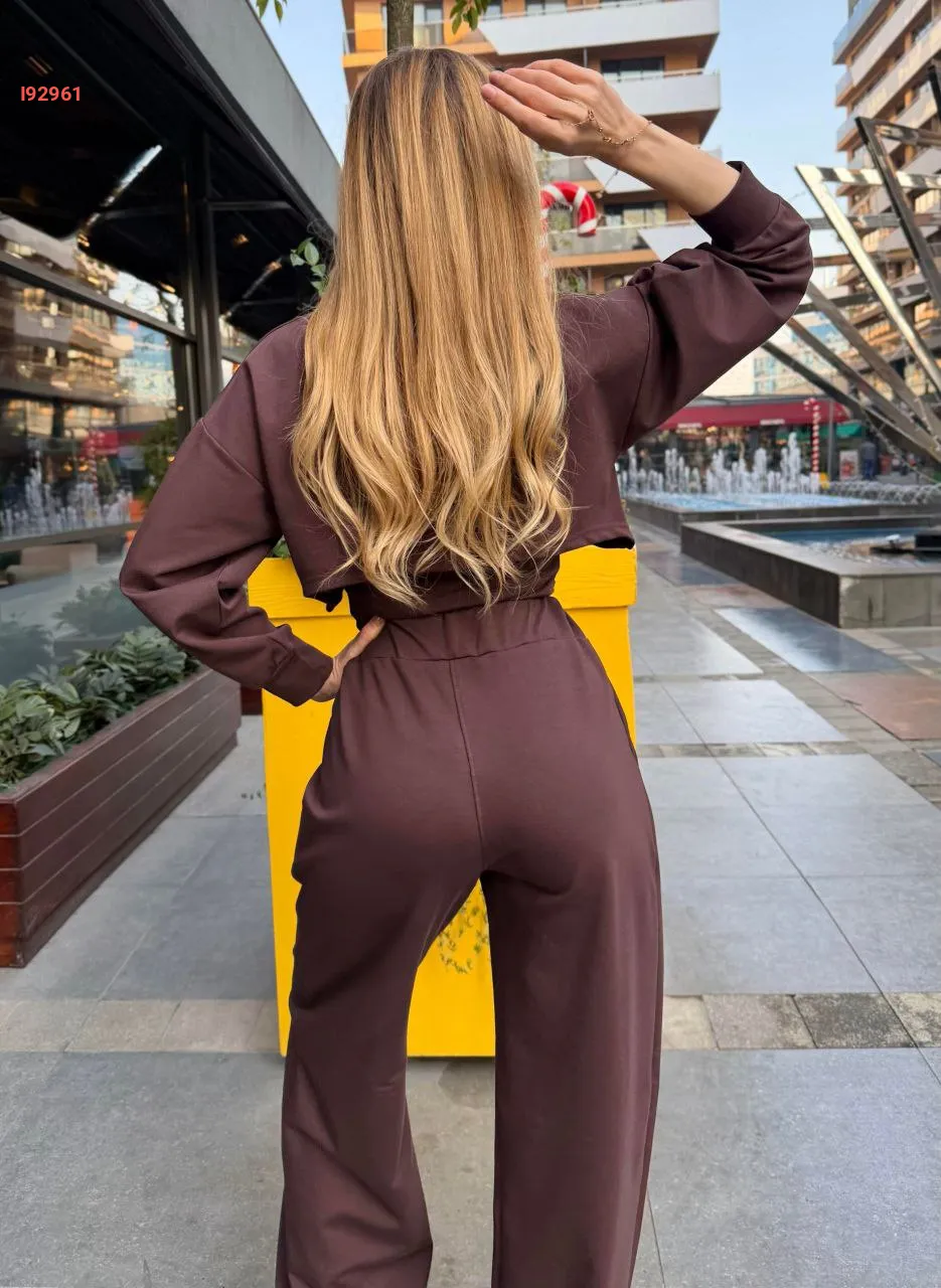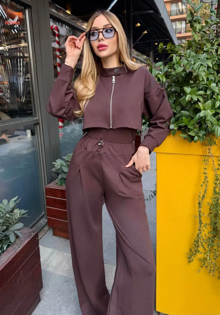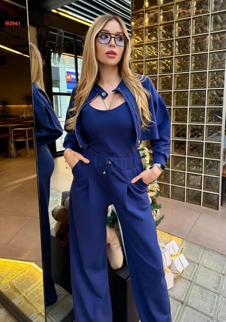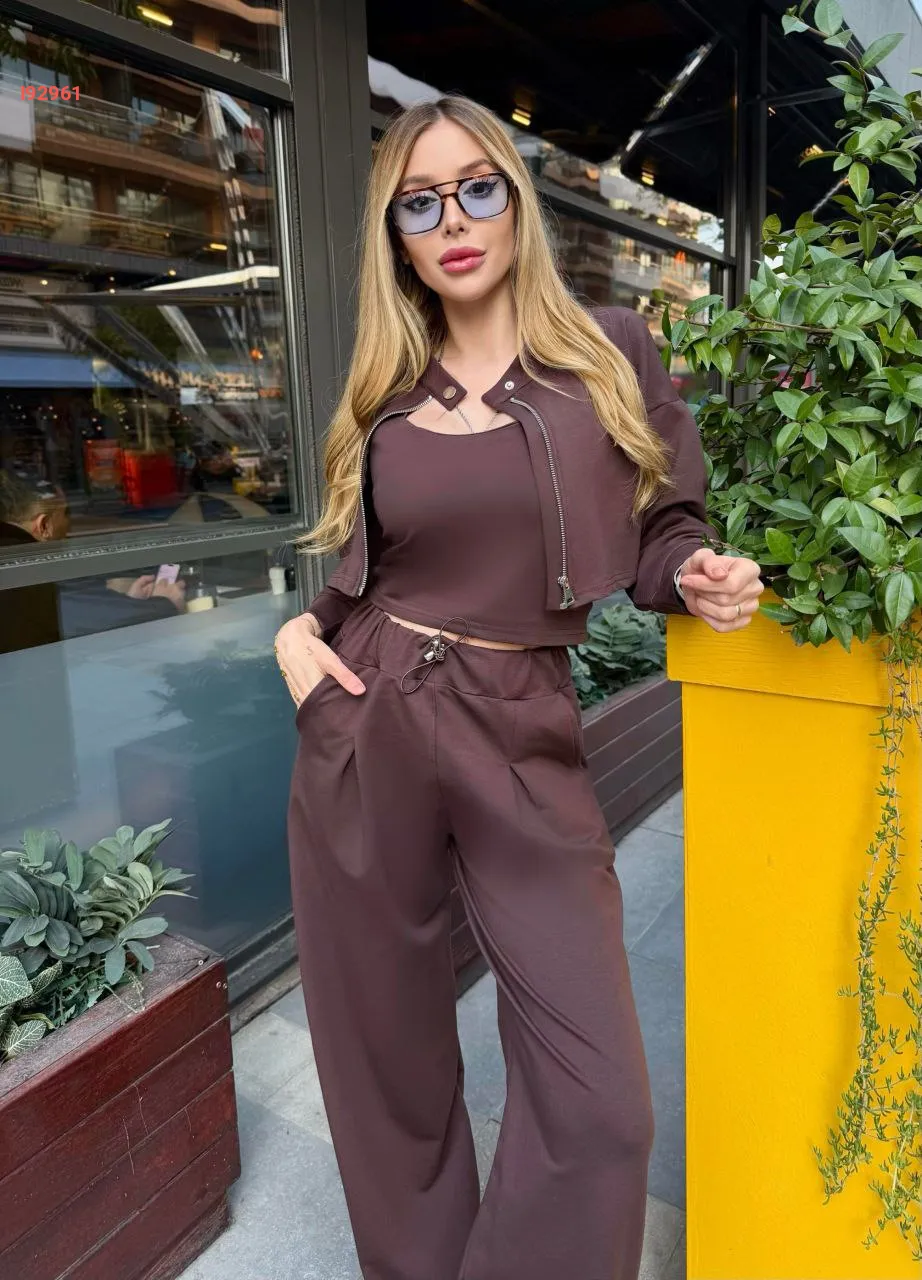 طقم بيجامة 3قطع سادة جاكيت قصير بسحاب مع زمة خصر عند البنطال