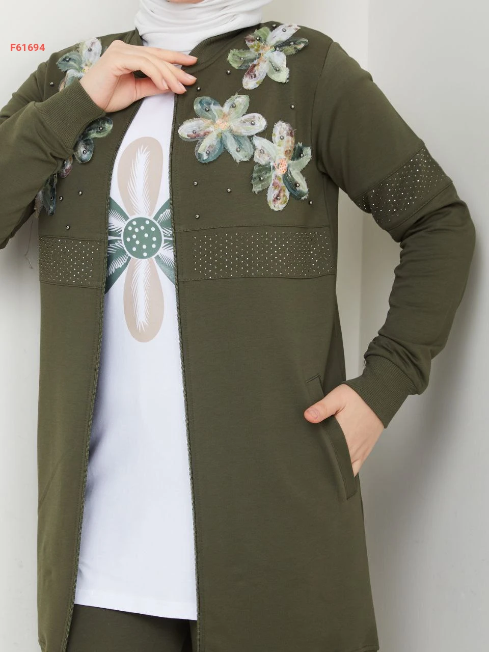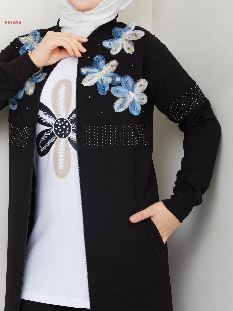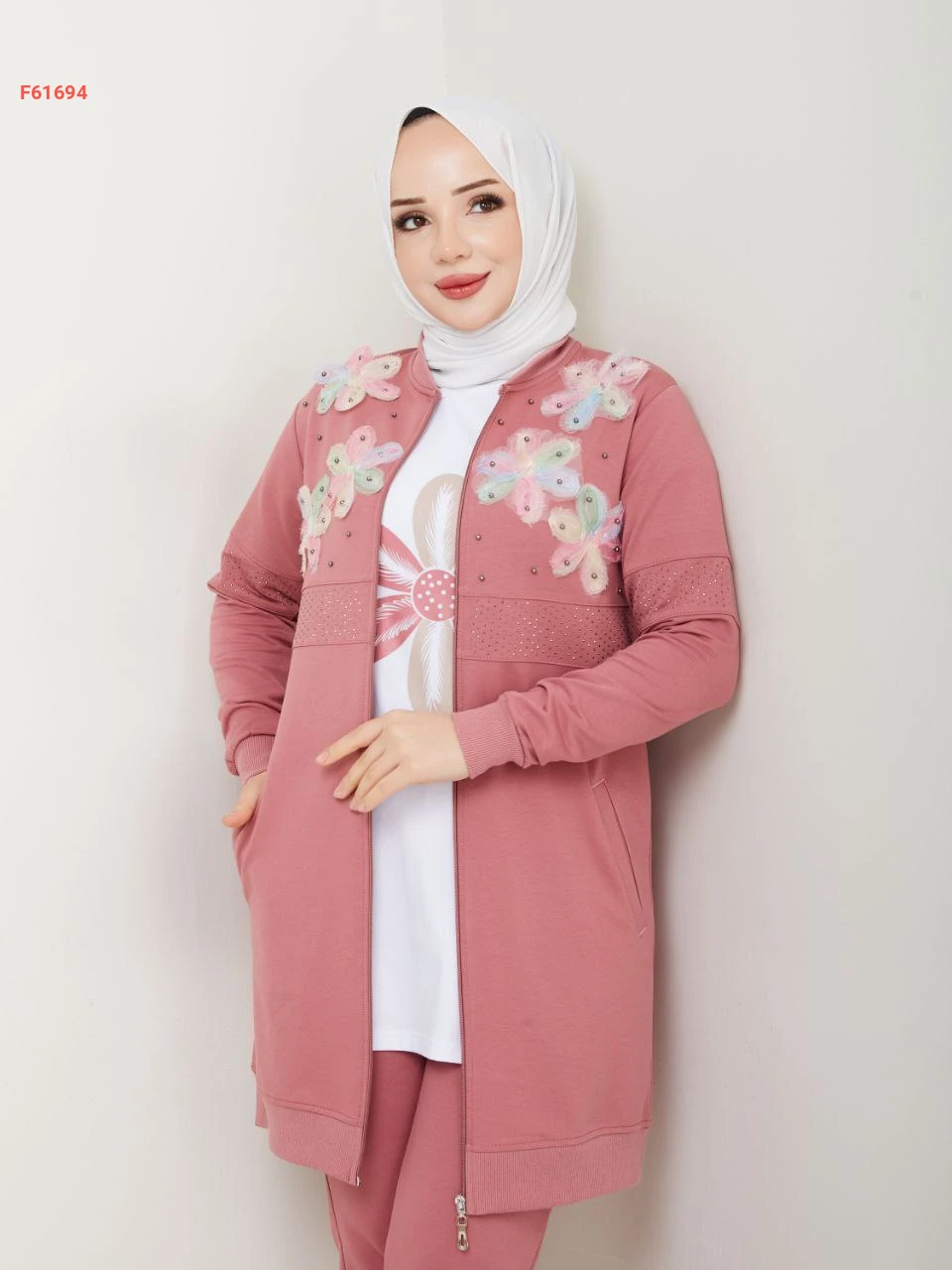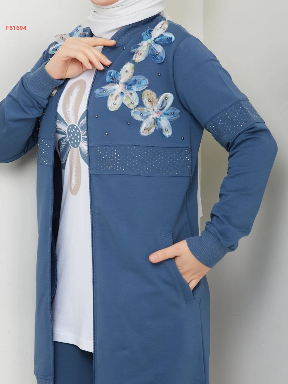 بيجامة 3 قطع بسحاب مزينة ورد مطرز مع الستراس
