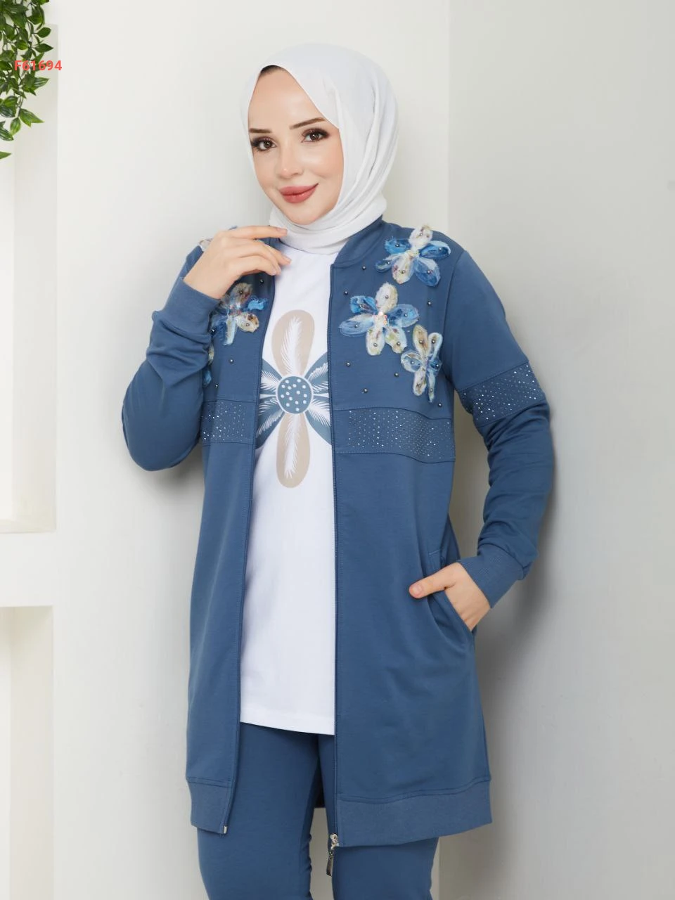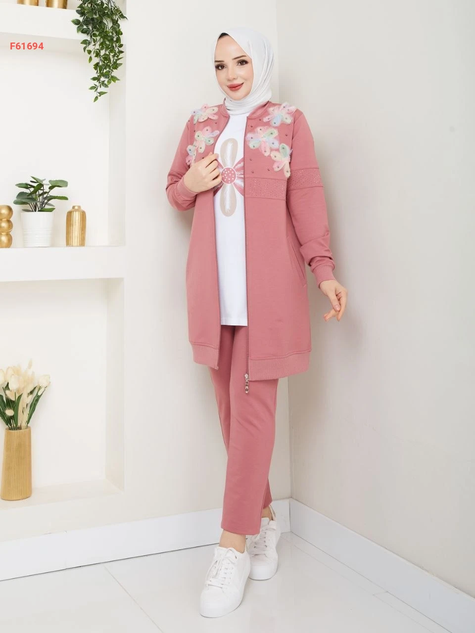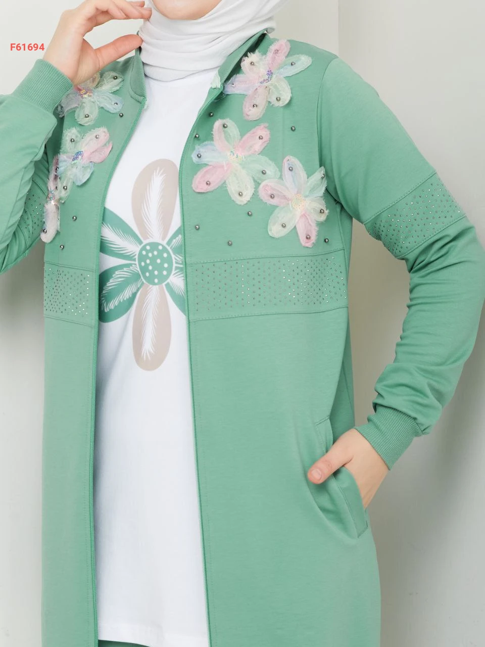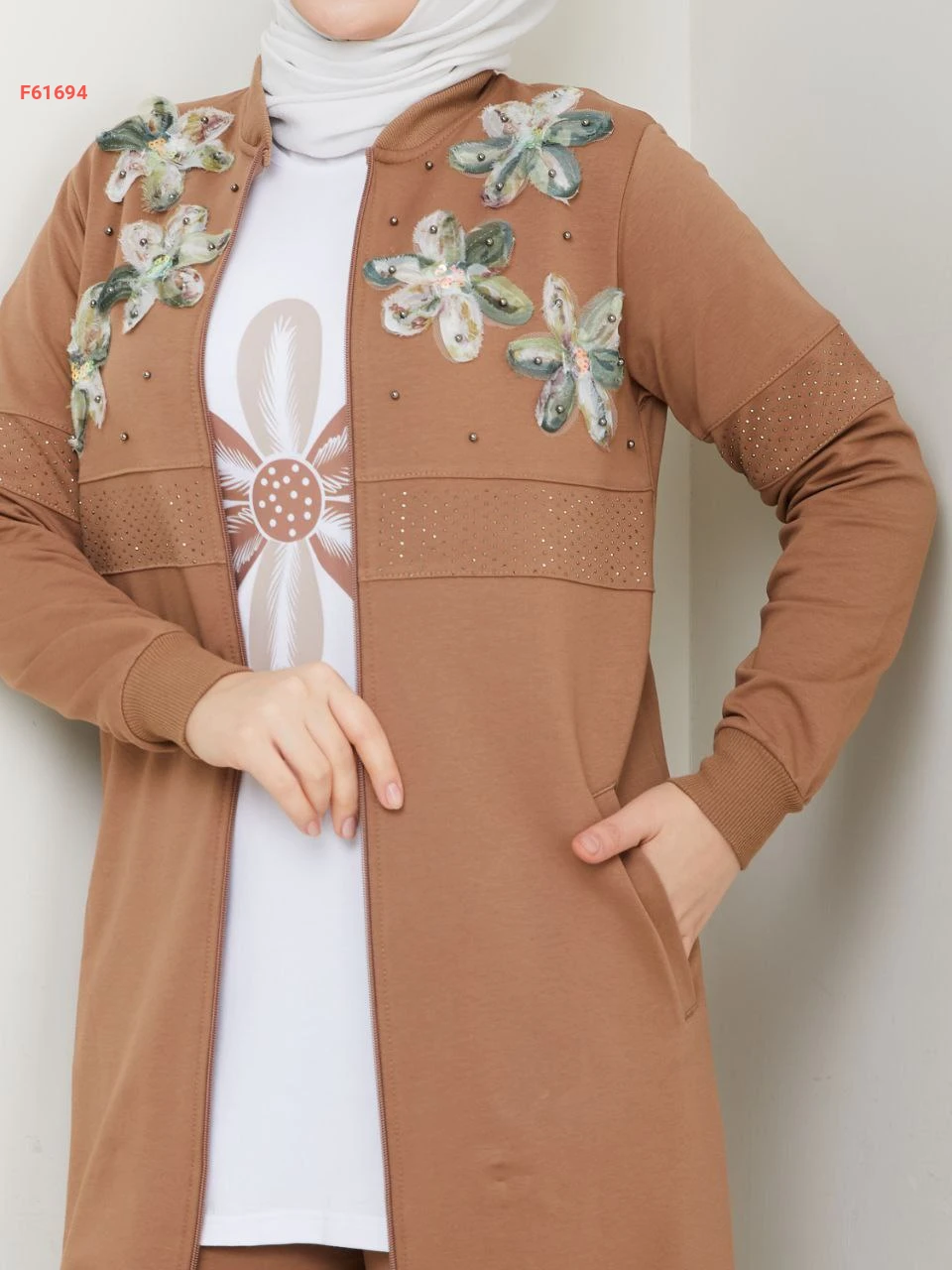 بيجامة 3 قطع بسحاب مزينة ورد مطرز مع الستراس