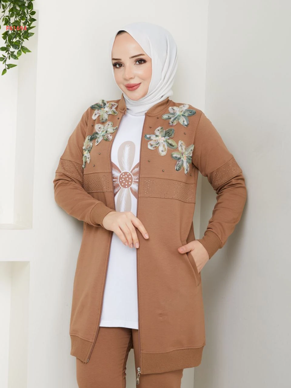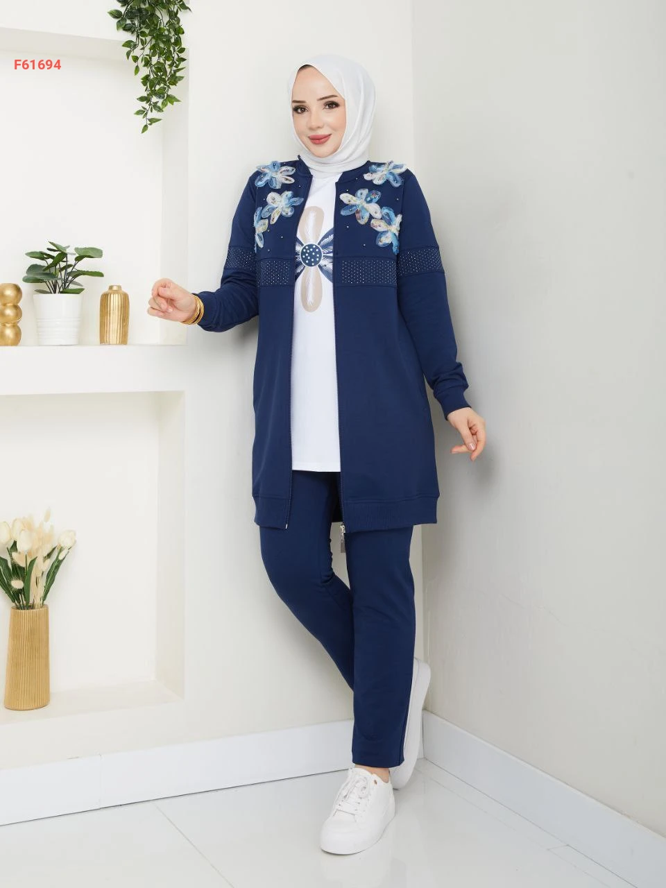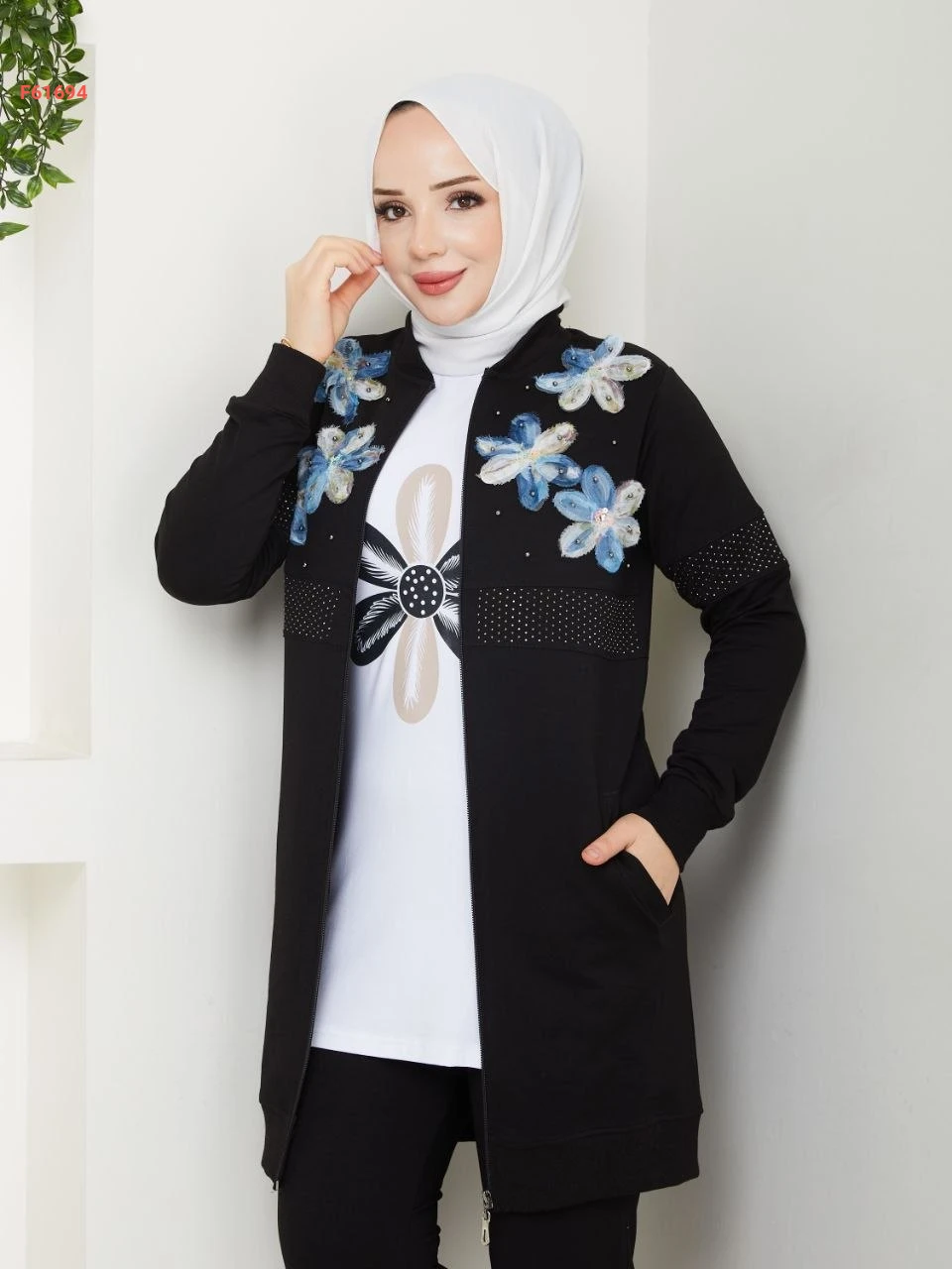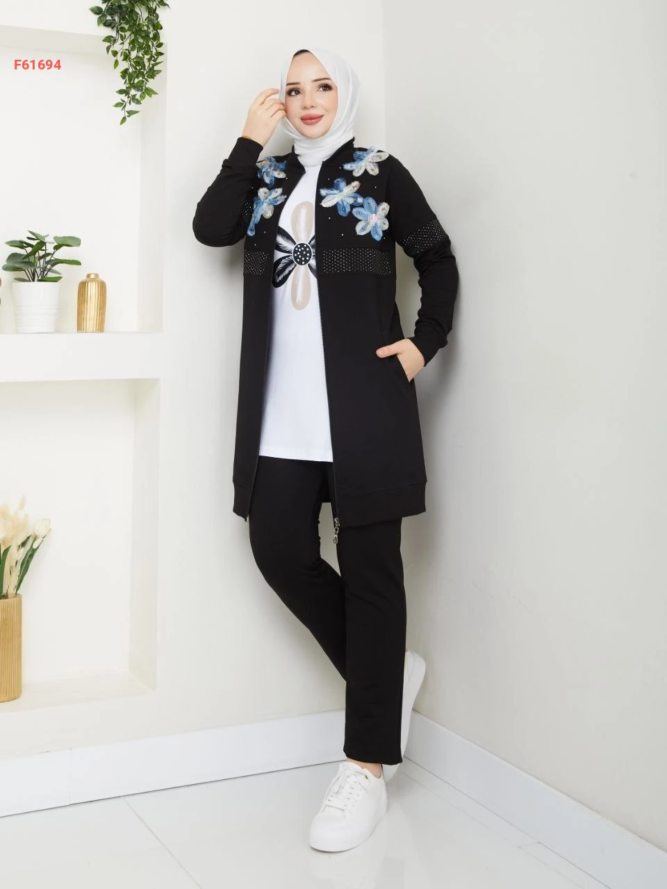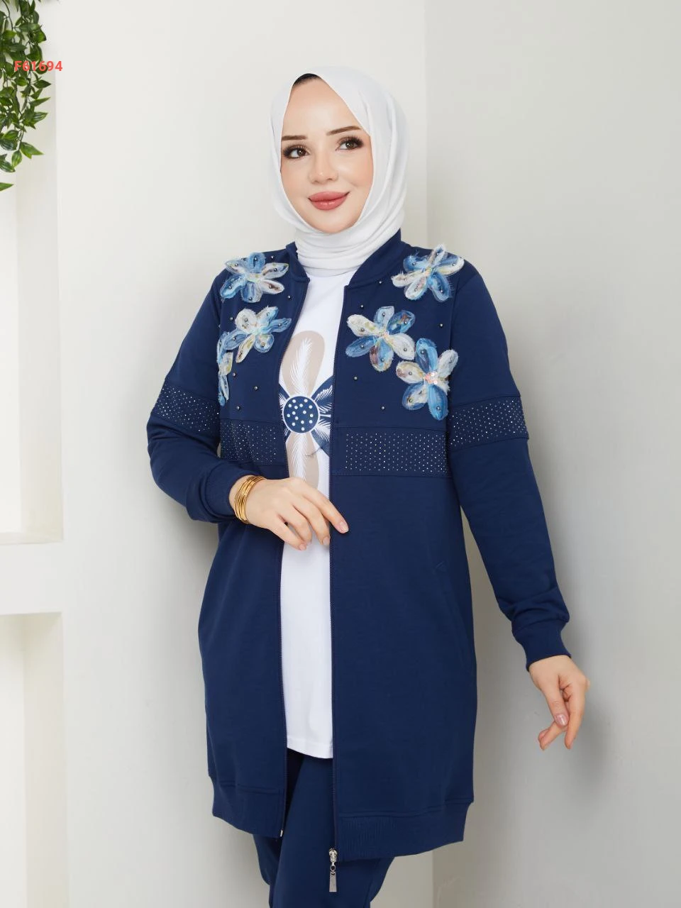 بيجامة 3 قطع بسحاب مزينة ورد مطرز مع الستراس