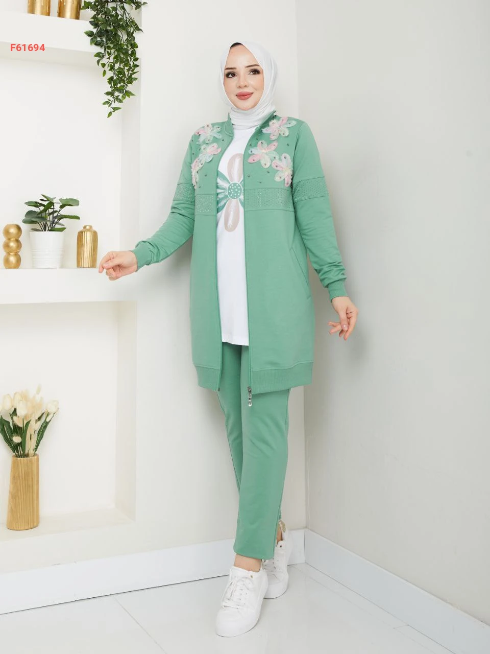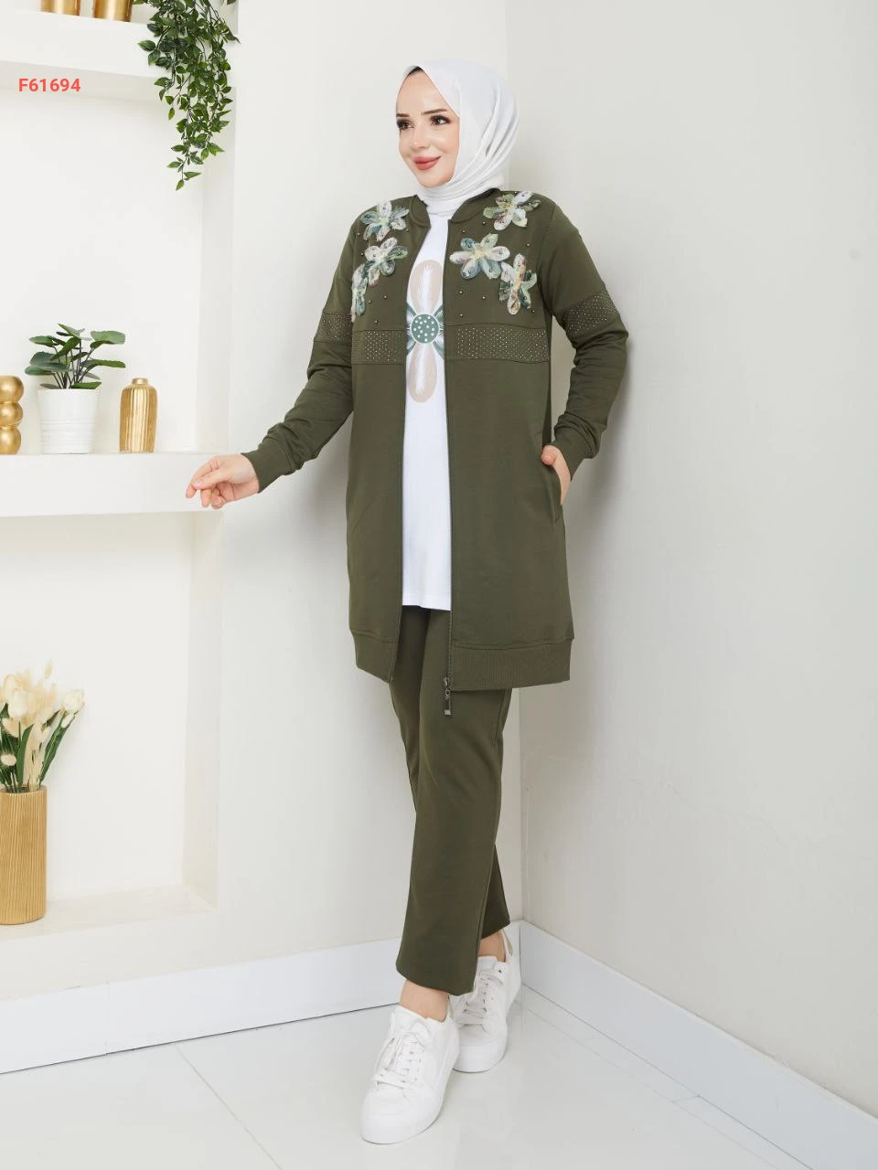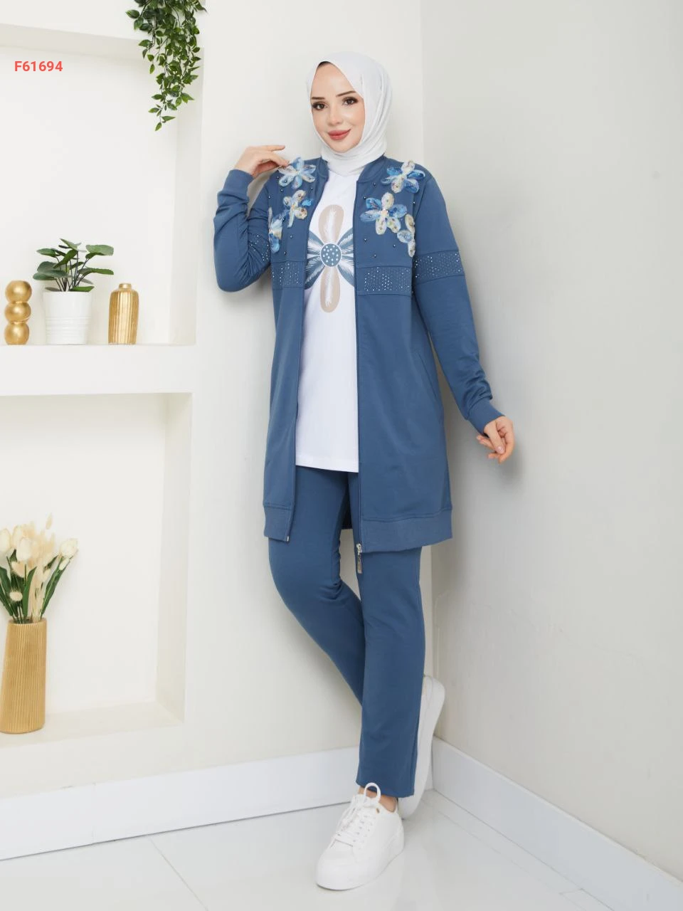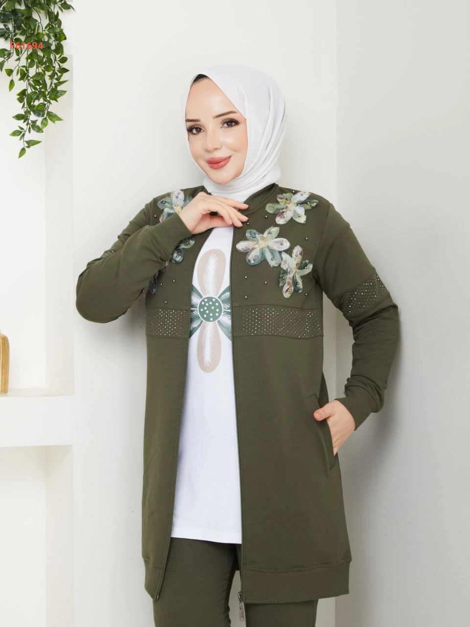 بيجامة 3 قطع بسحاب مزينة ورد مطرز مع الستراس