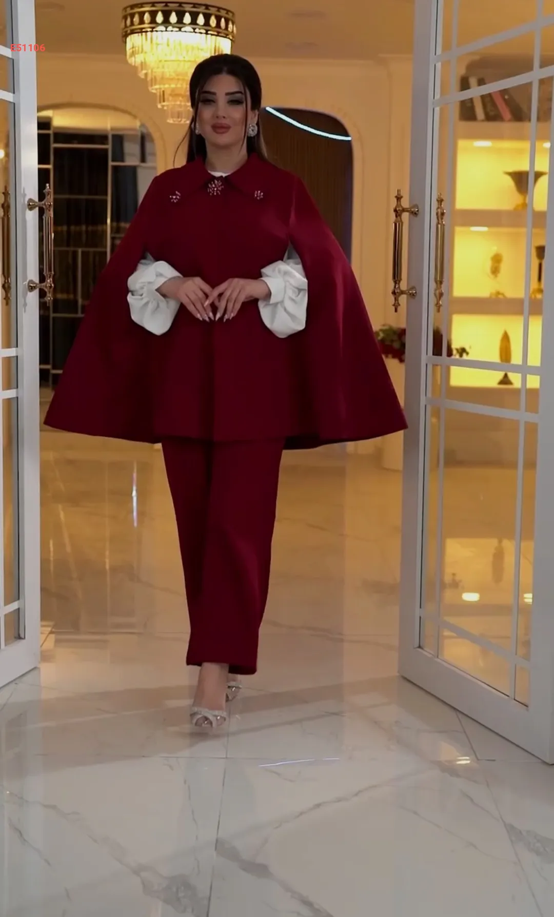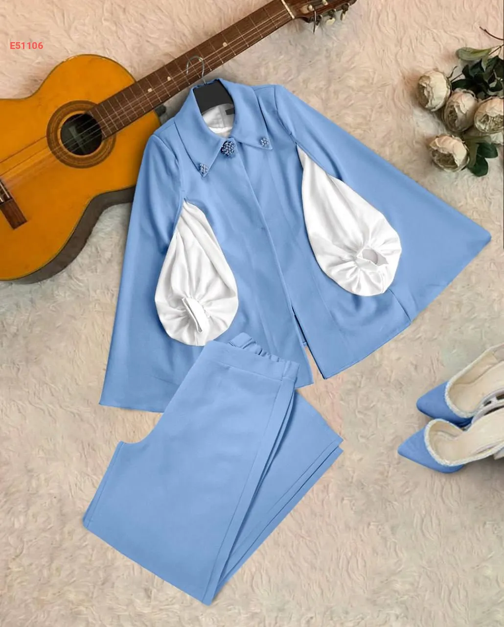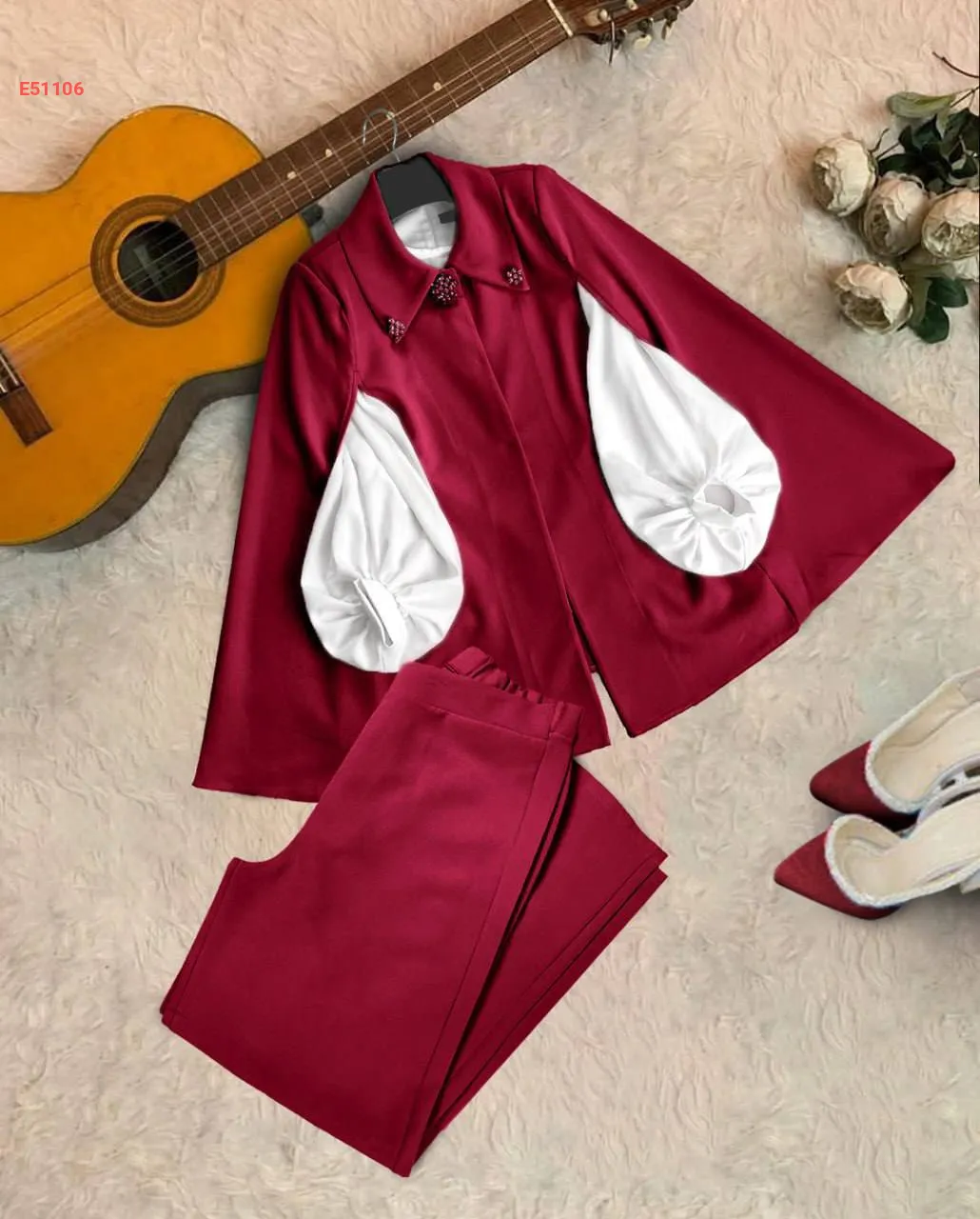 طقم بنطال 3قطع كاب بياقة مزينة باللؤلؤ والألماس