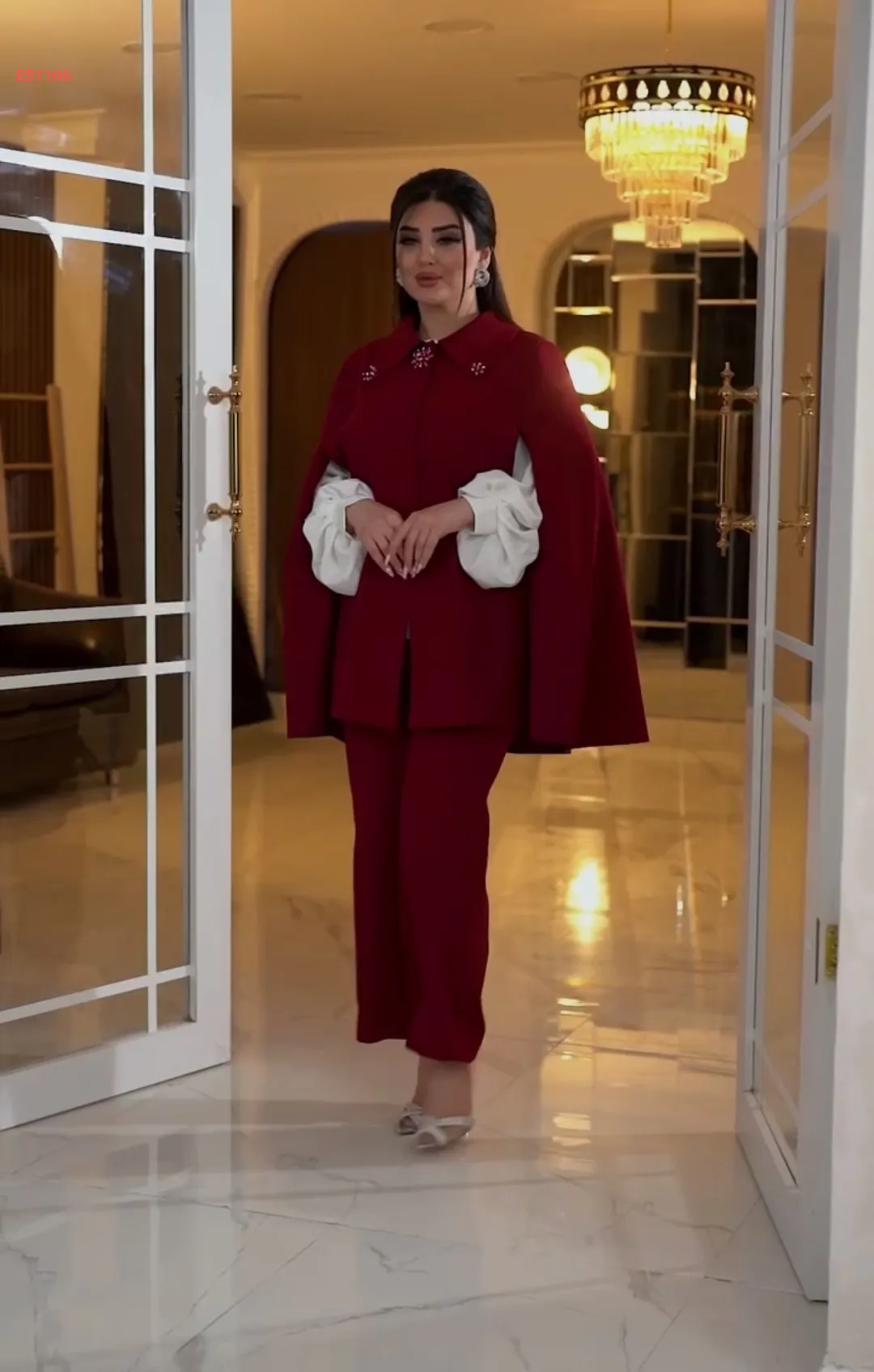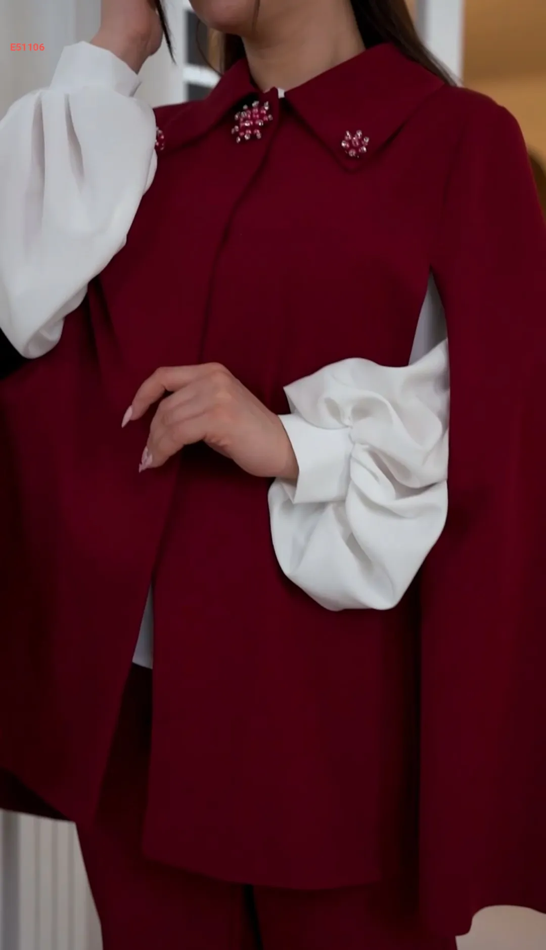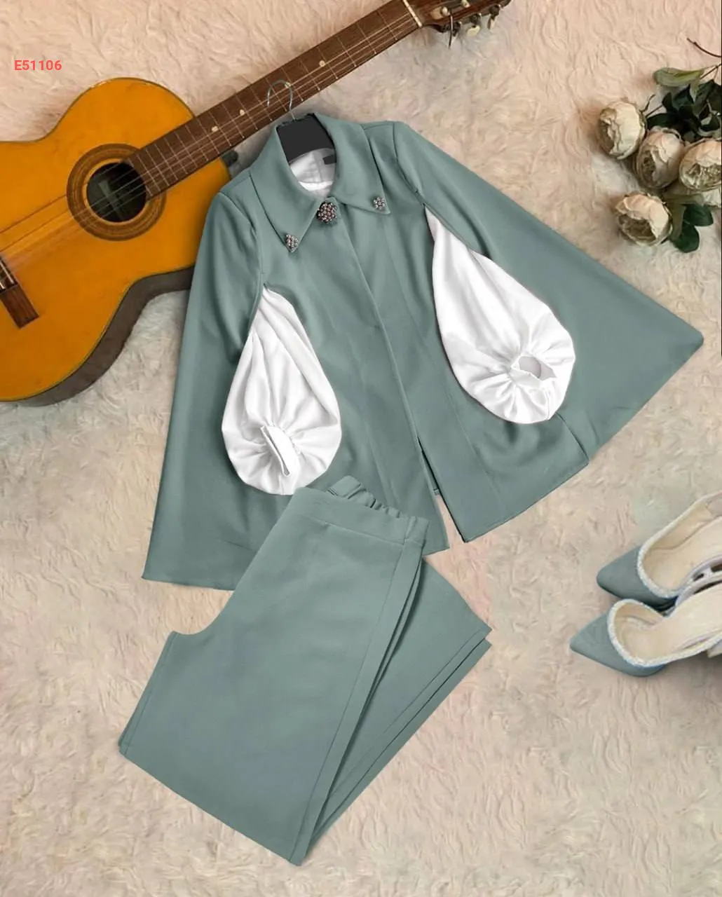 طقم بنطال 3قطع كاب بياقة مزينة باللؤلؤ والألماس