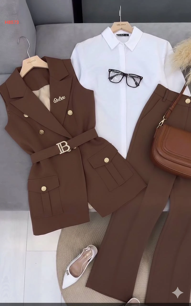 طقم بنطال 3 قطع يلك حفر بأزرار مزدوجة مع حزام وبروش وقميص أبيض