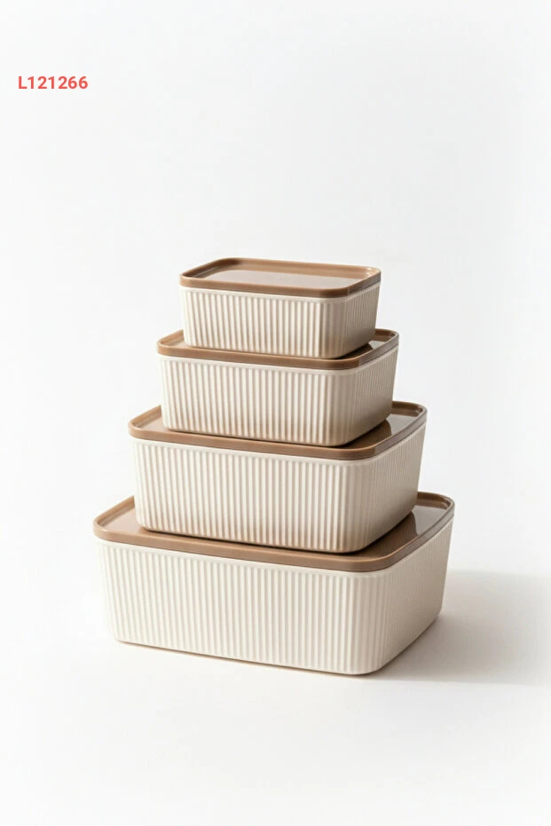 مجموعة تخزين مستطيلة 4 قطع بخطوط بيج | مناسبة للميكروويف والفريزر