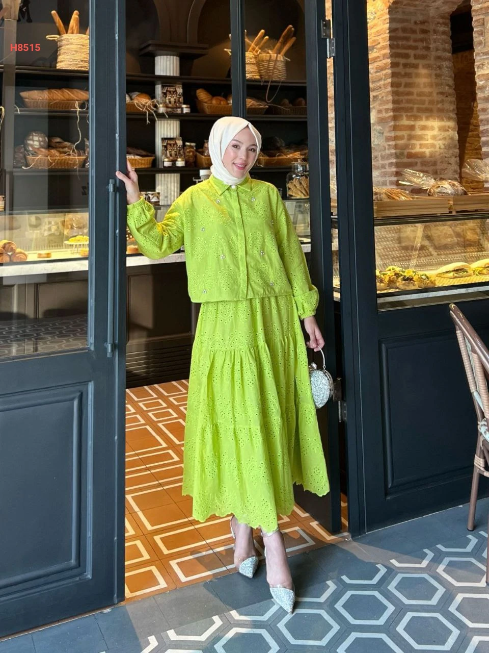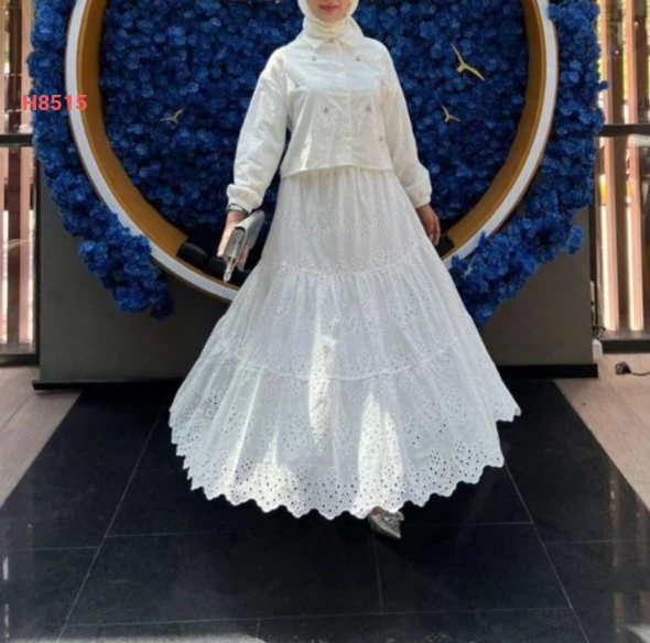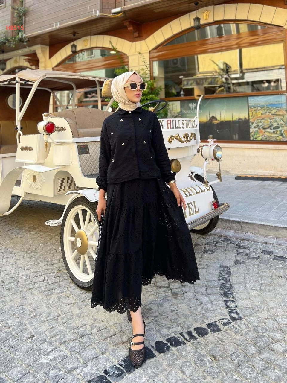 طقم قميص بأزرار وتنورة طبقات واسعة بتصميم الدانتيل المفرغ بفصوص لامعة