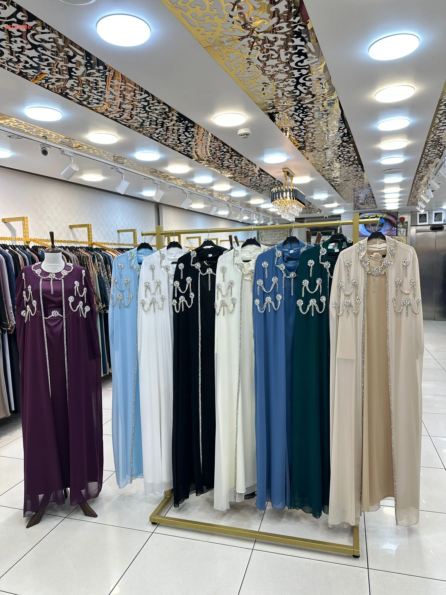 قفطان مع عباية بتطريز فضي ، مزين بالكريستال مع سلاسل