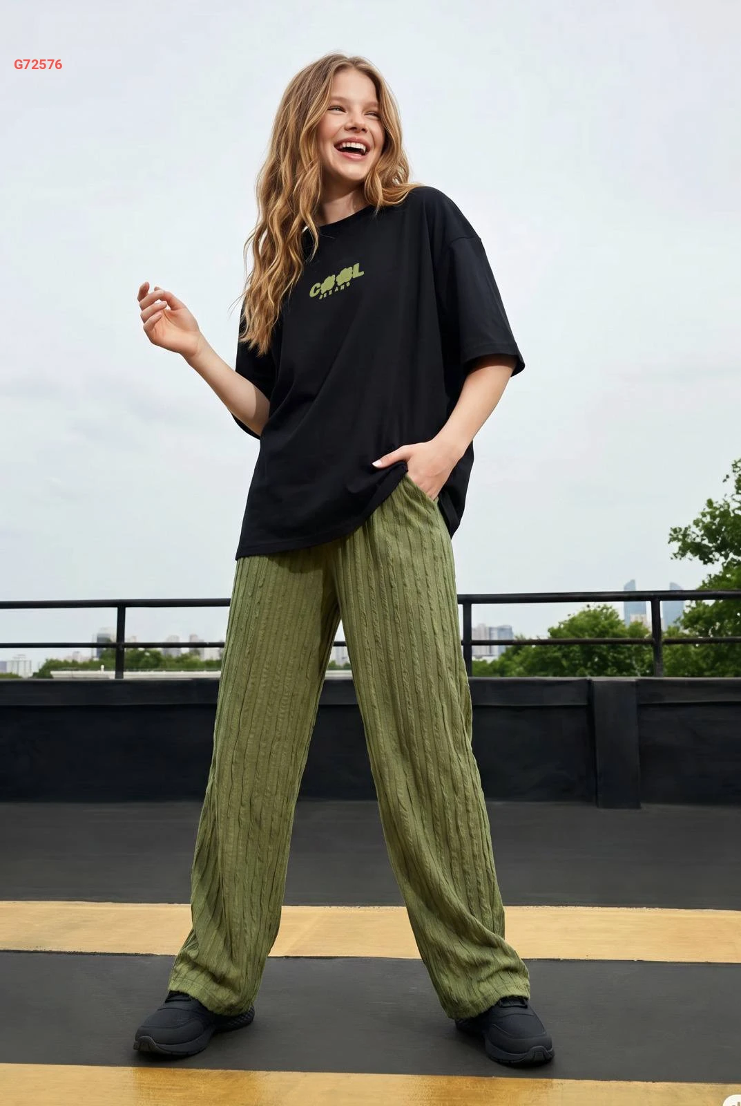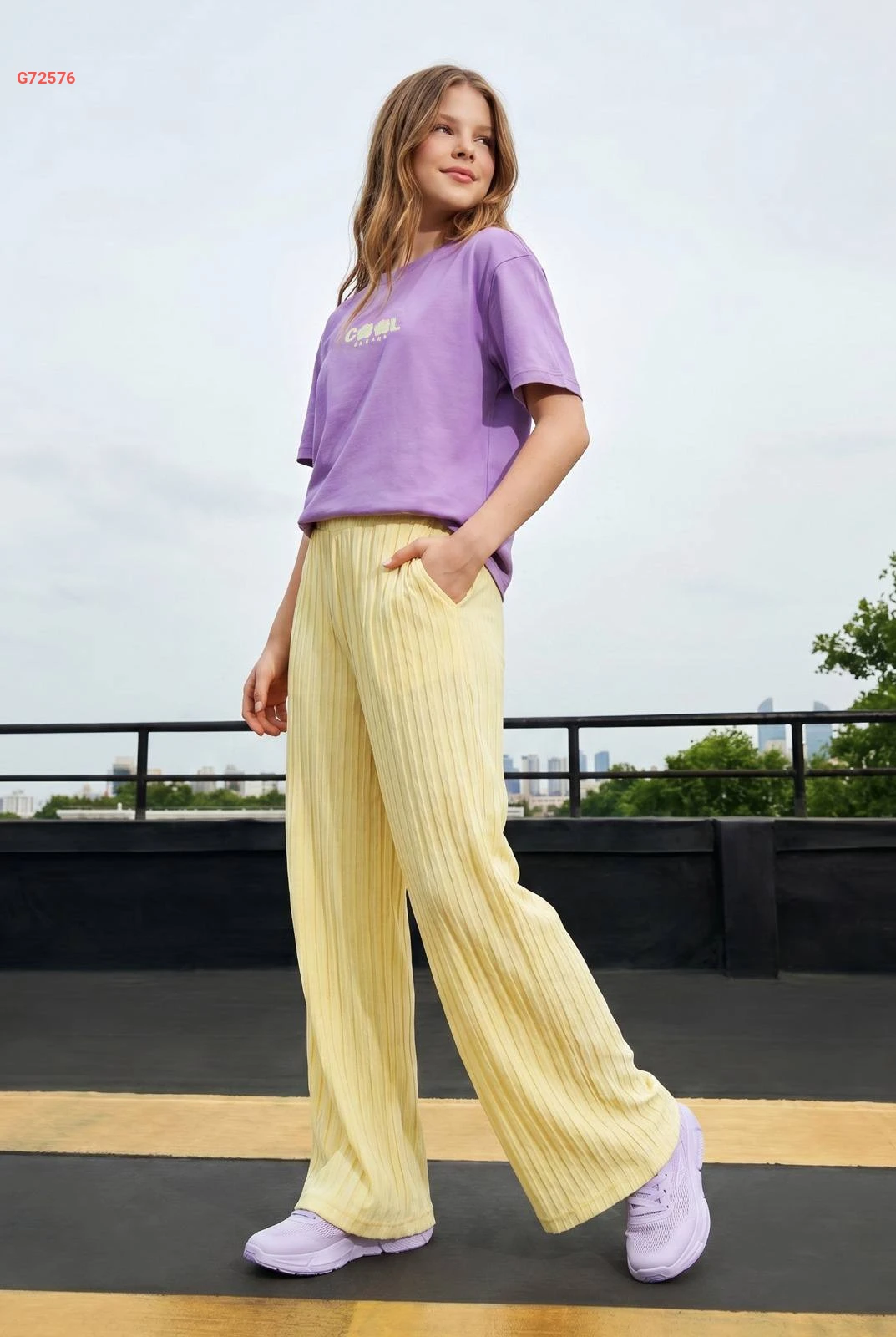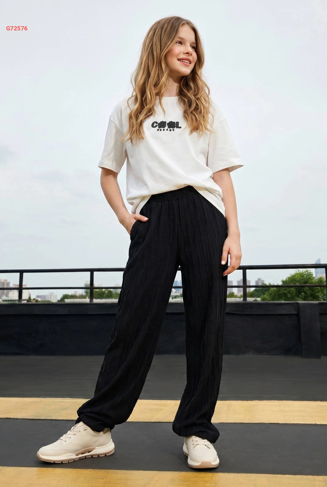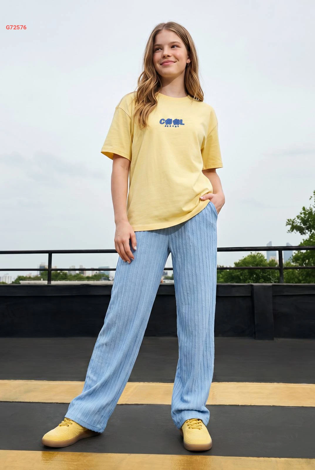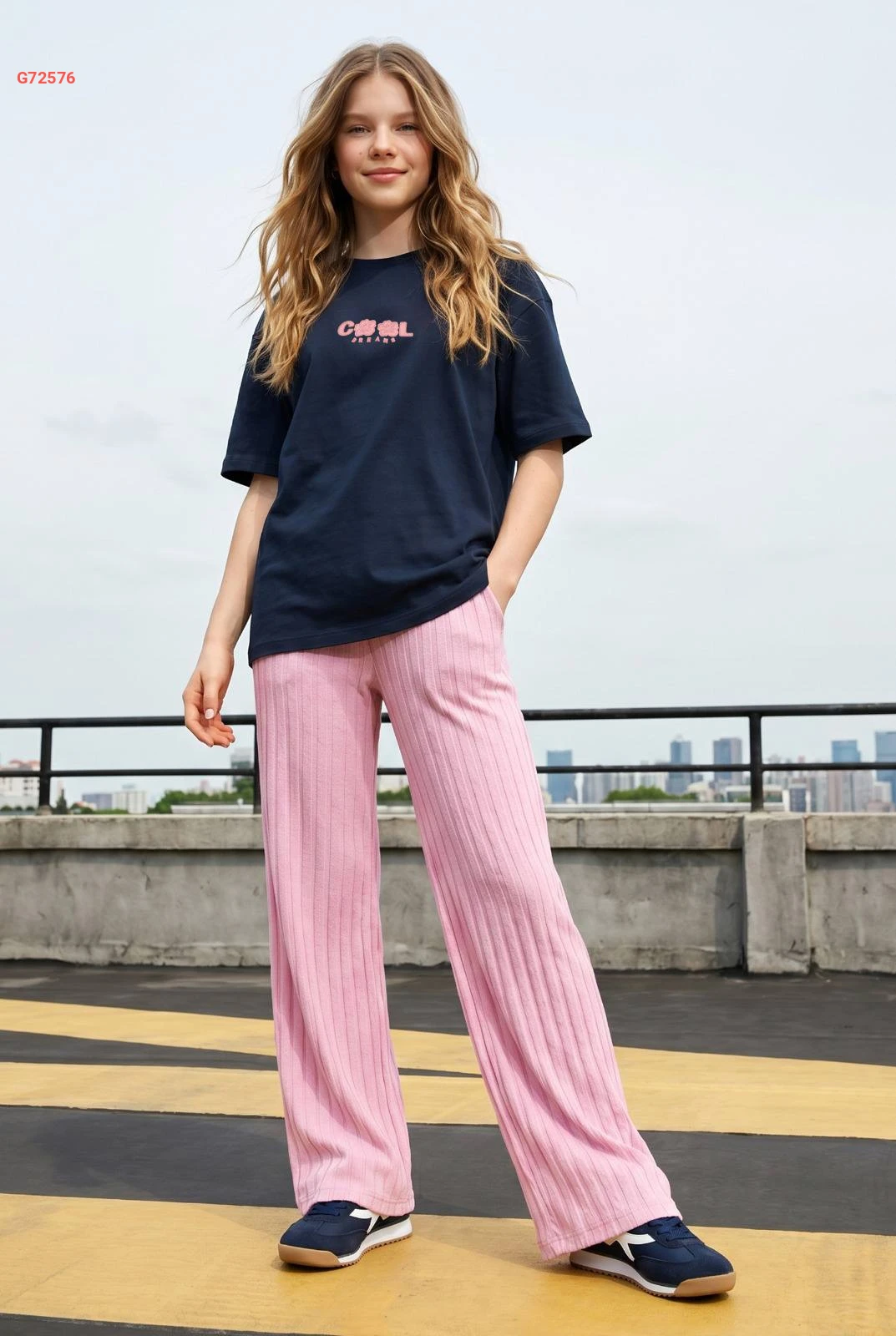 طقم بناتي كاجوال يتكون من تيشرت قطني مريح وبنطال واسع بكسرات ناعمة