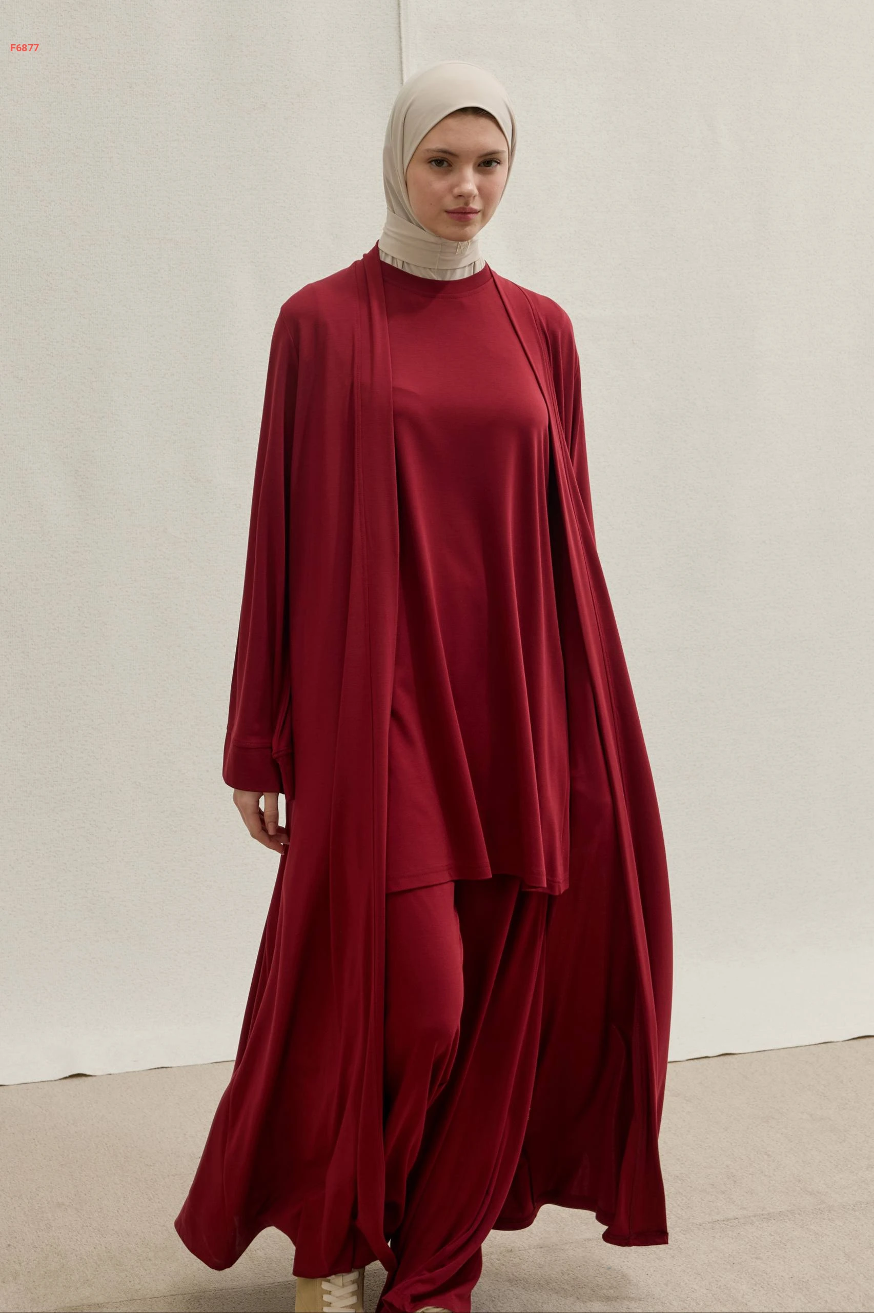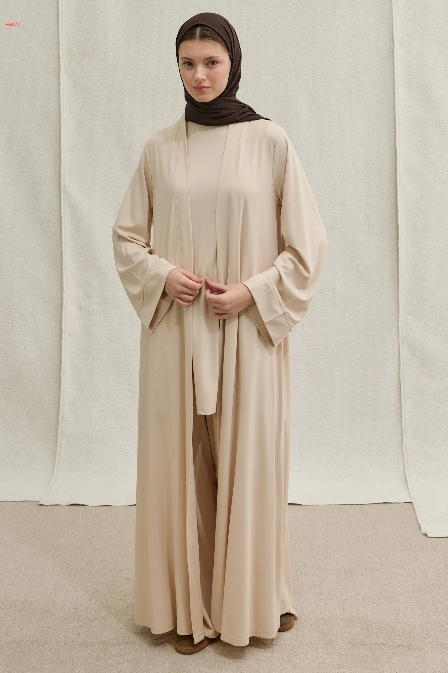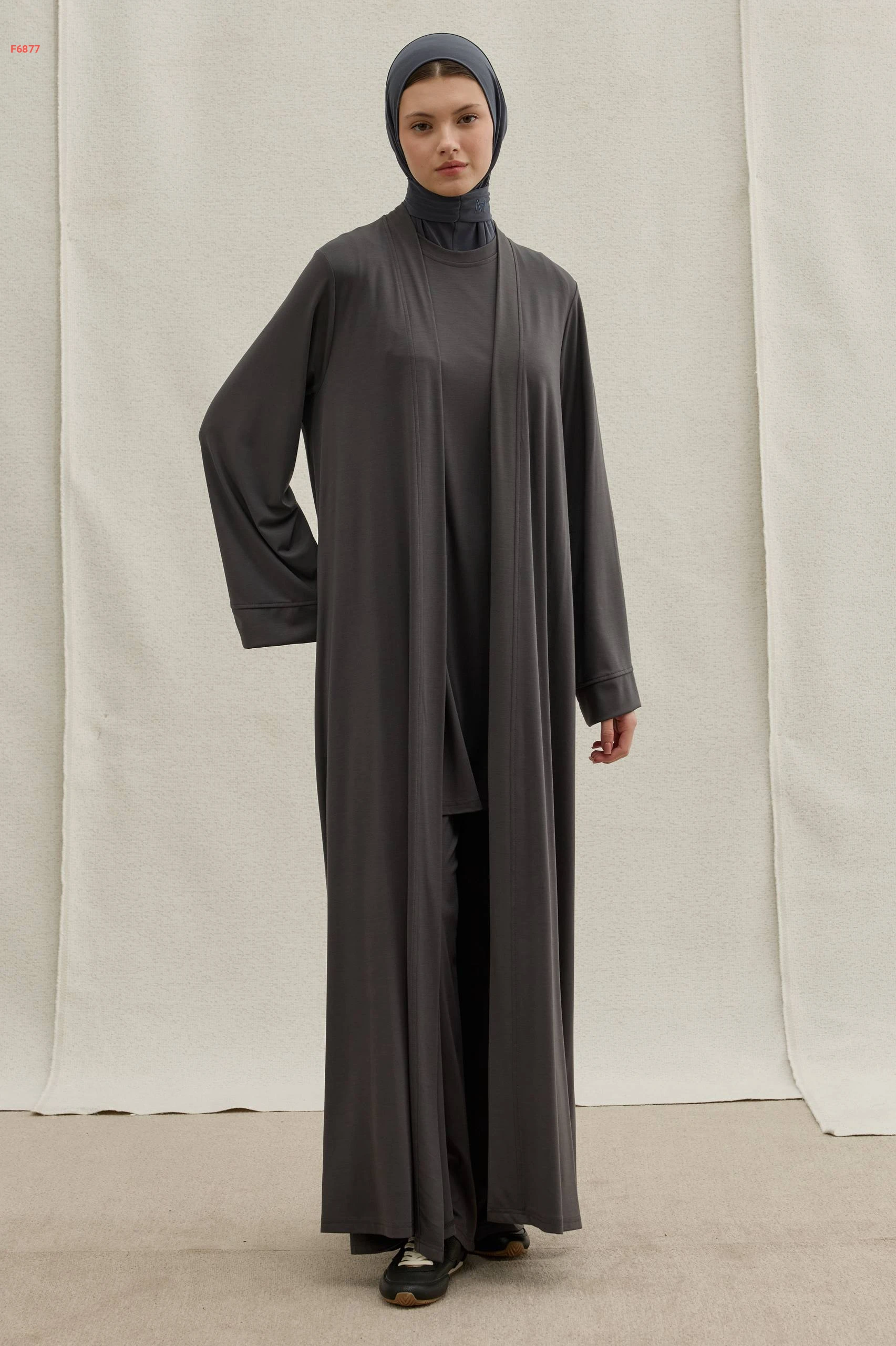 طقم ثلاثي مريح وعملي مكون من عباءة مفتوحة، تيشيرت، وبنطال واسع بقماش مطاطي ناعم وتصميم يجمع بين البساطة والاحتشام.