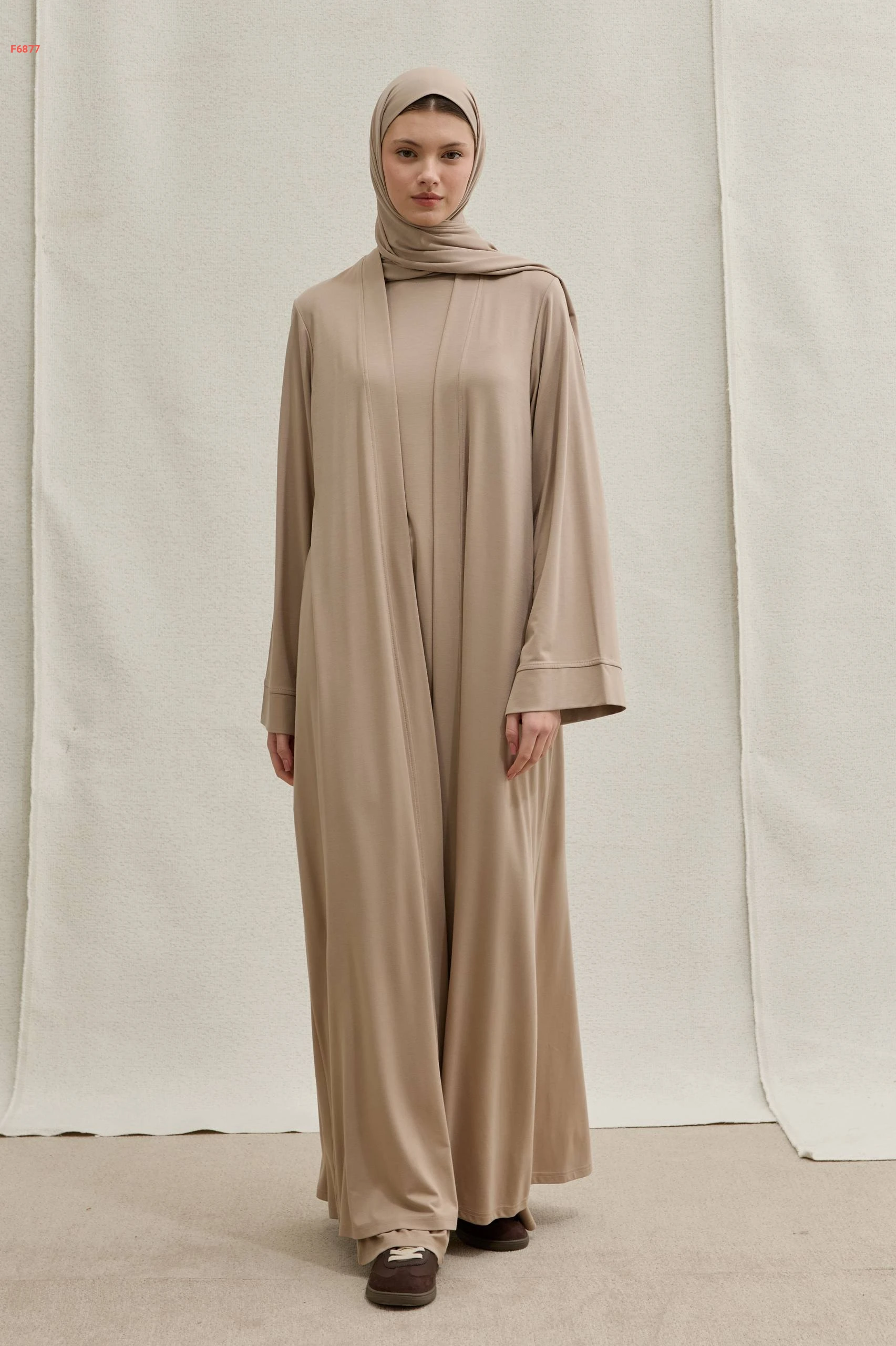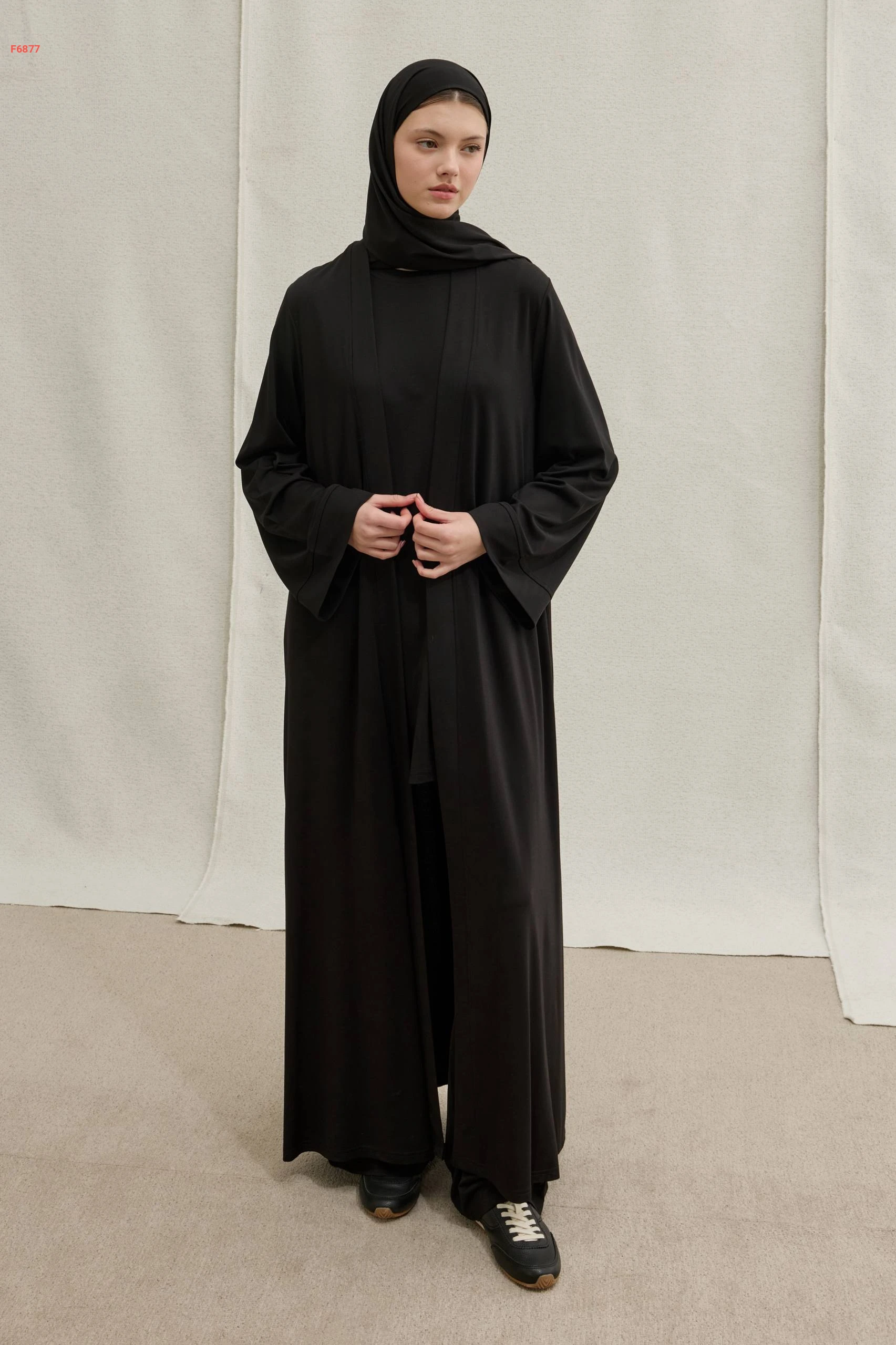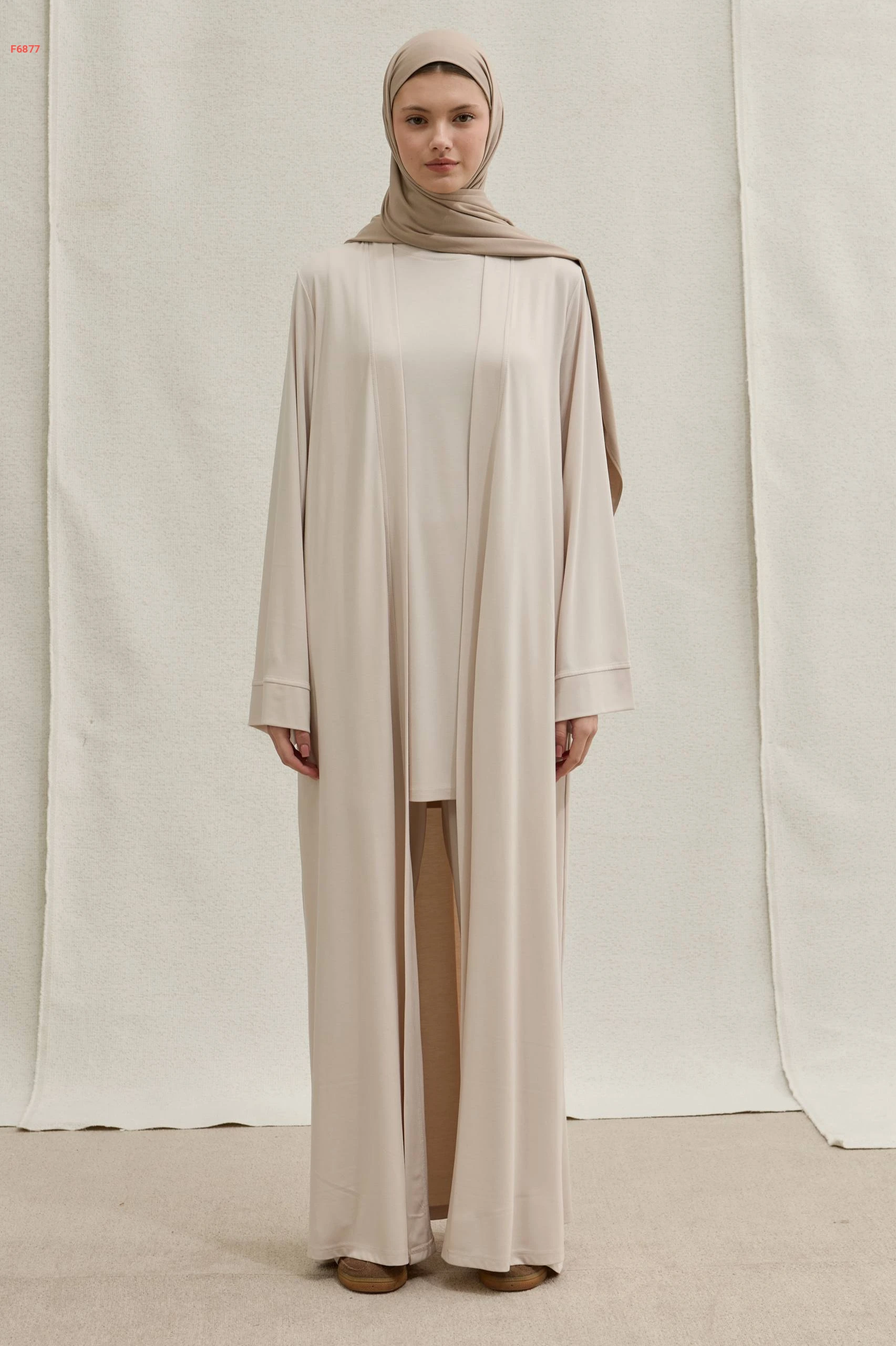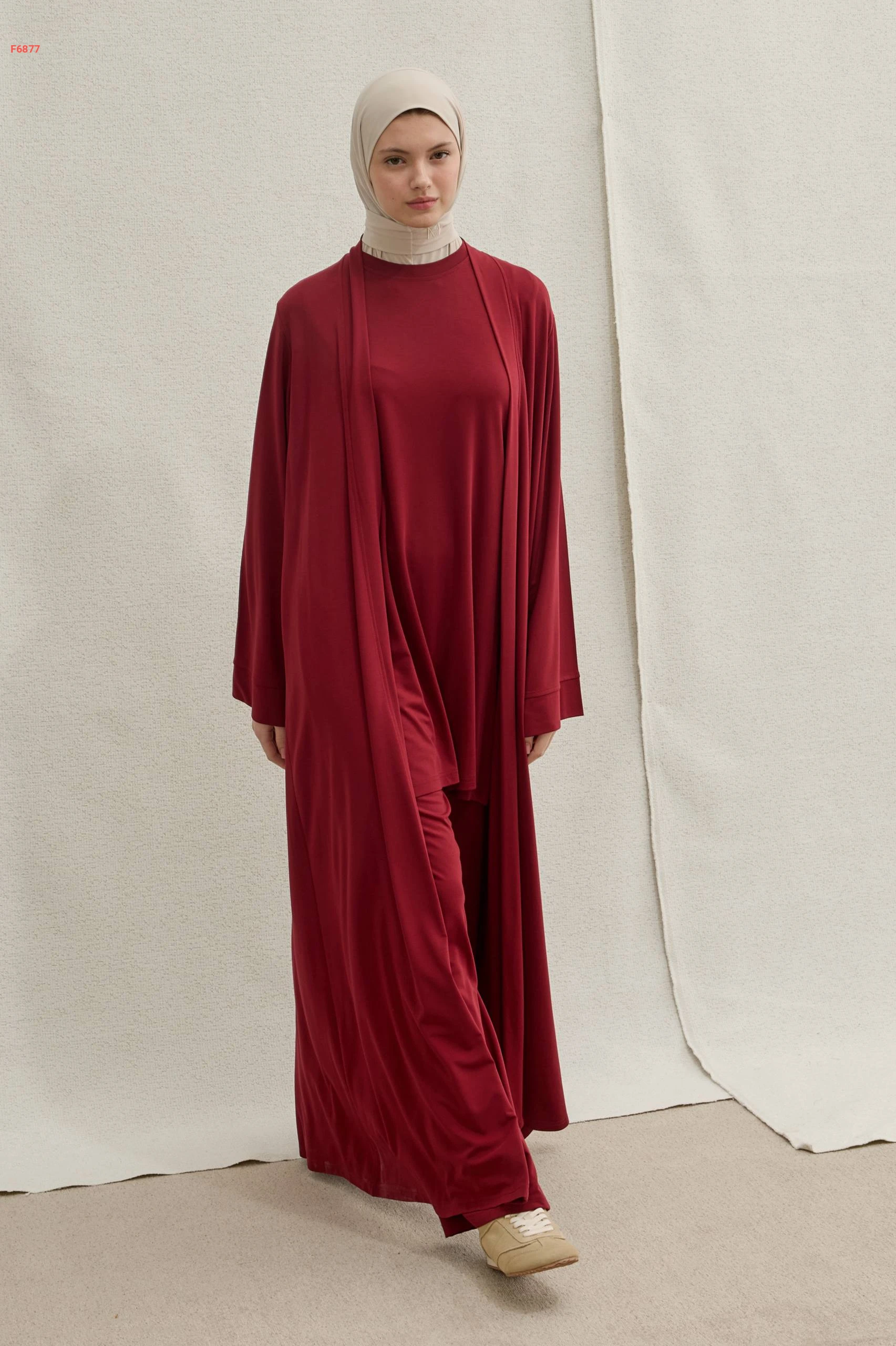 طقم ثلاثي مريح وعملي مكون من عباءة مفتوحة، تيشيرت، وبنطال واسع بقماش مطاطي ناعم وتصميم يجمع بين البساطة والاحتشام.
