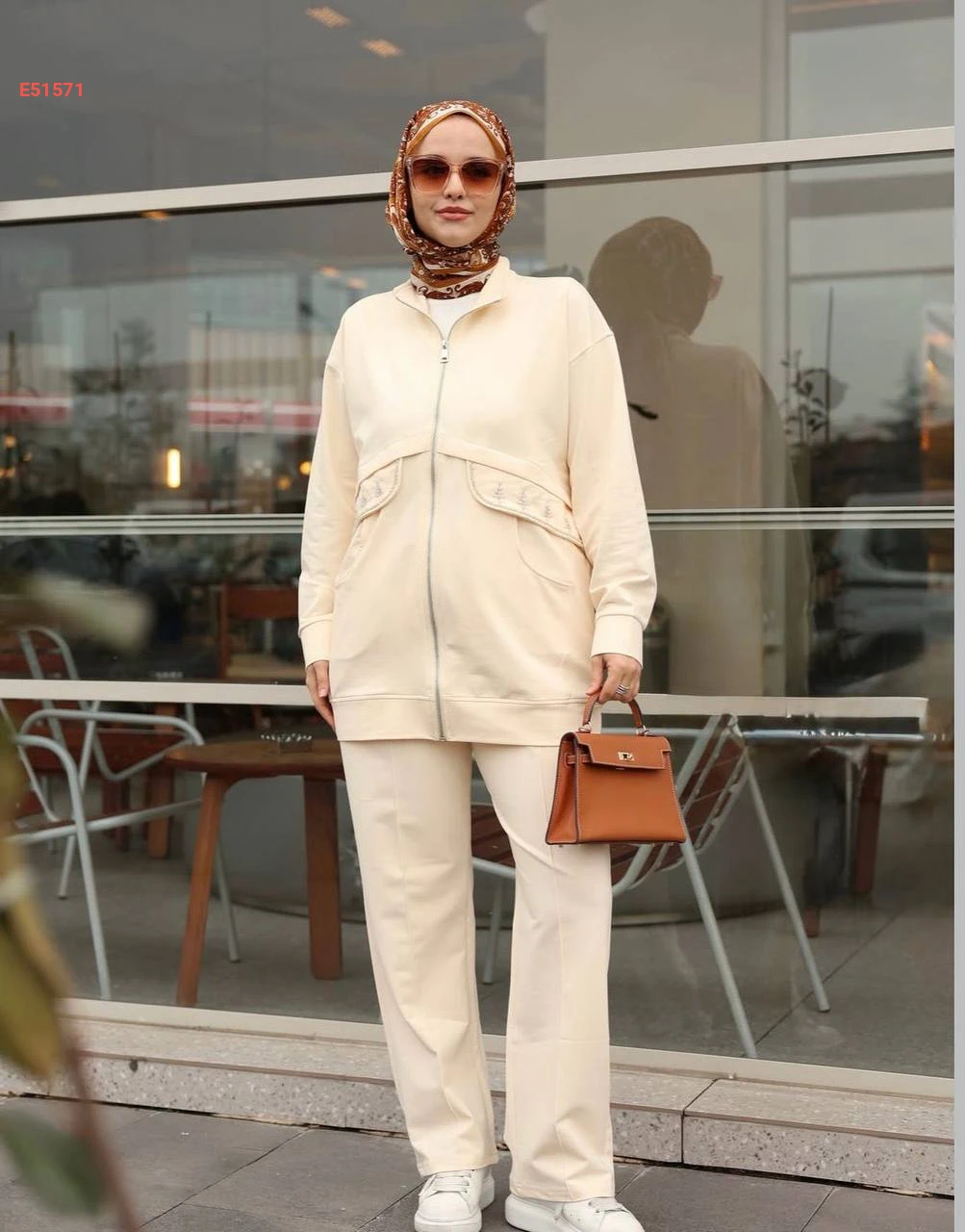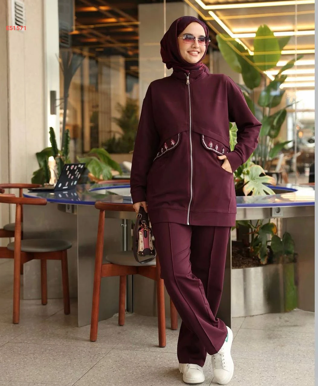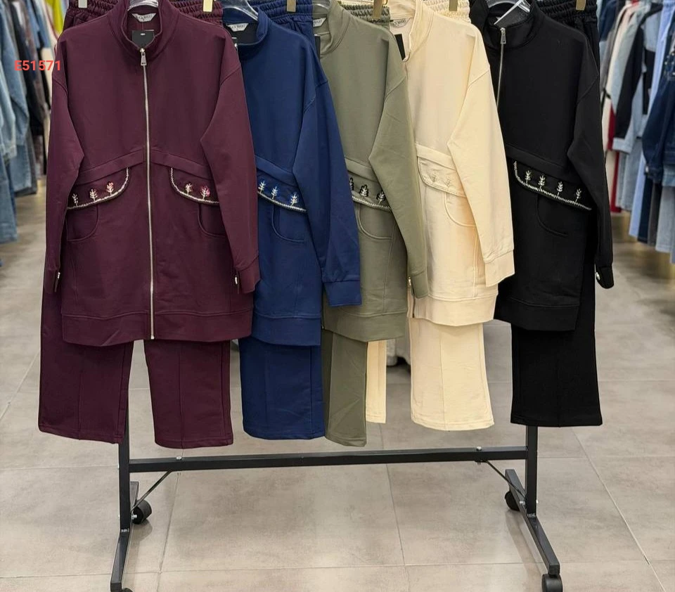 طقم رياضي كاجوال مريح من القطن، يتألف من سترة بسحاب كامل وياقة مرتفعة مع جيوب جانبية مطرزة وبنطال متناسق بأسلوب عصري.
