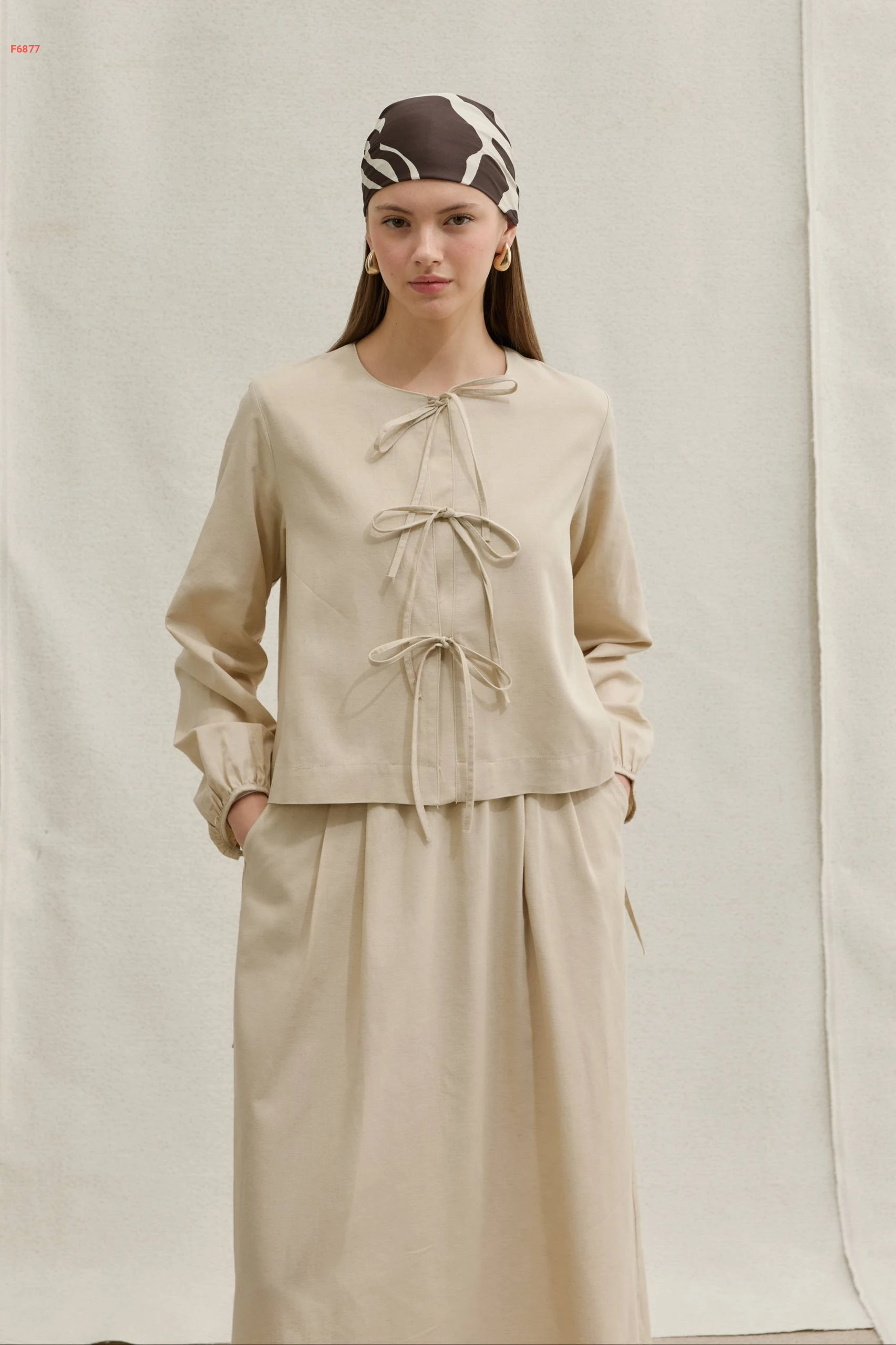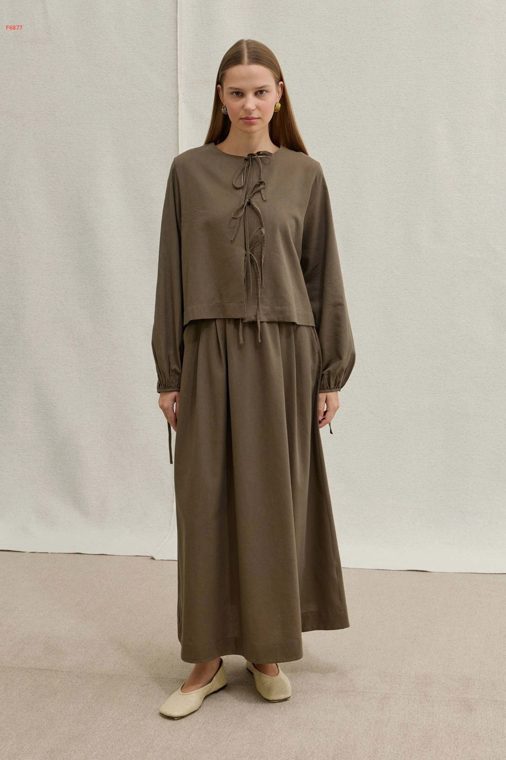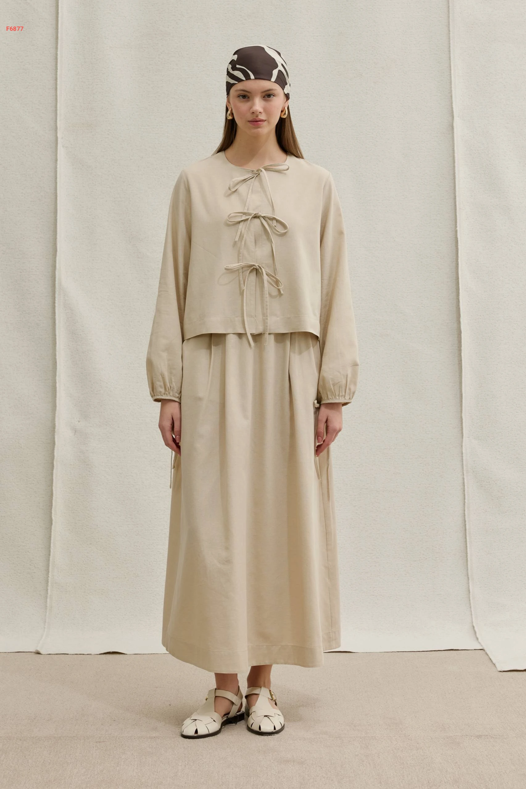 طقم مريح يتكون من بلوزة قصيرة مزينة بأربطة أمامية ناعمة مع تنورة طويلة منسدلة،