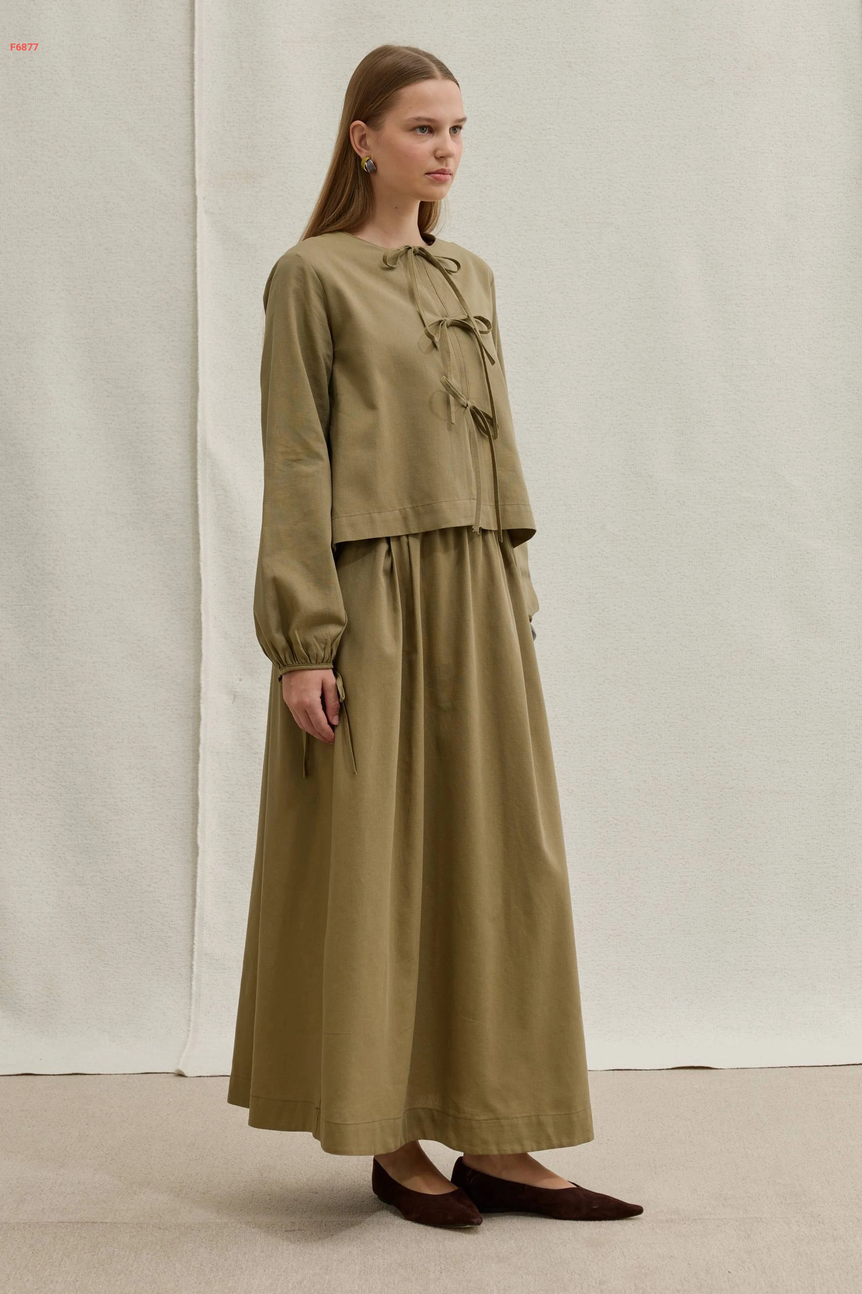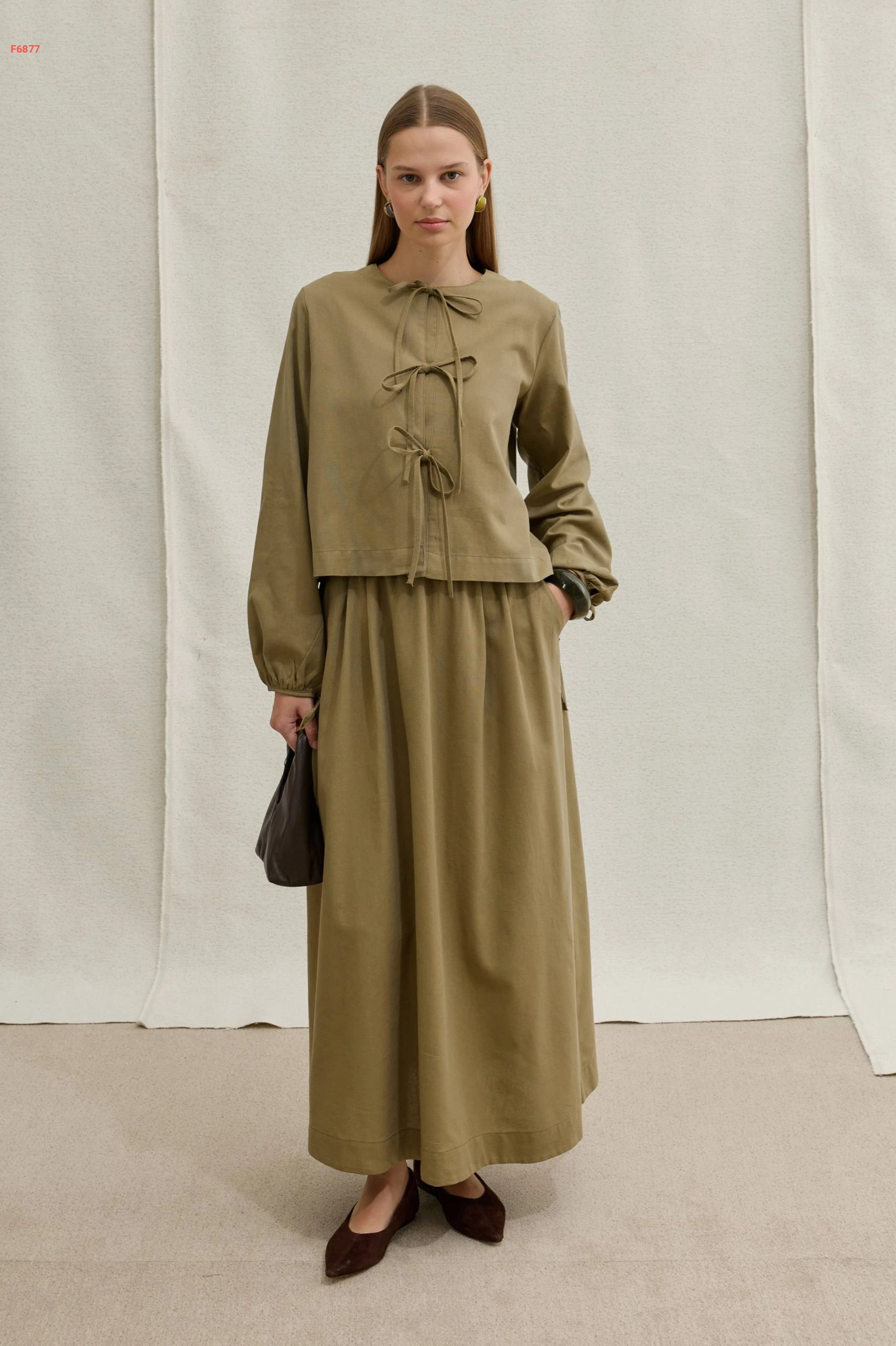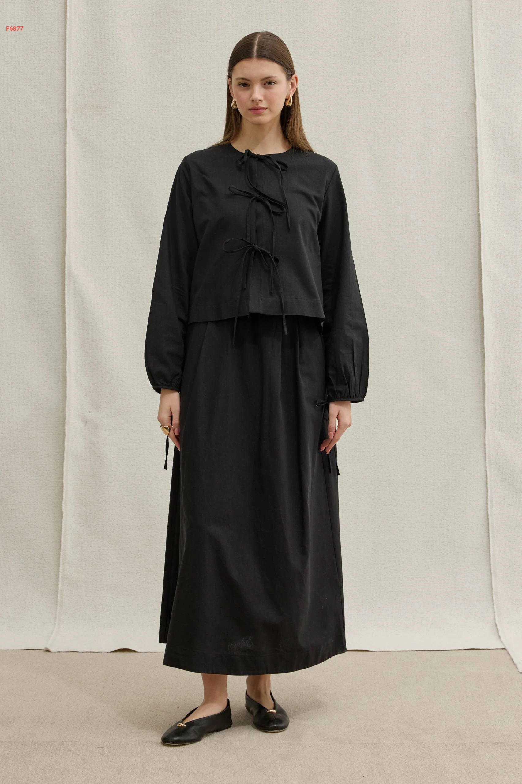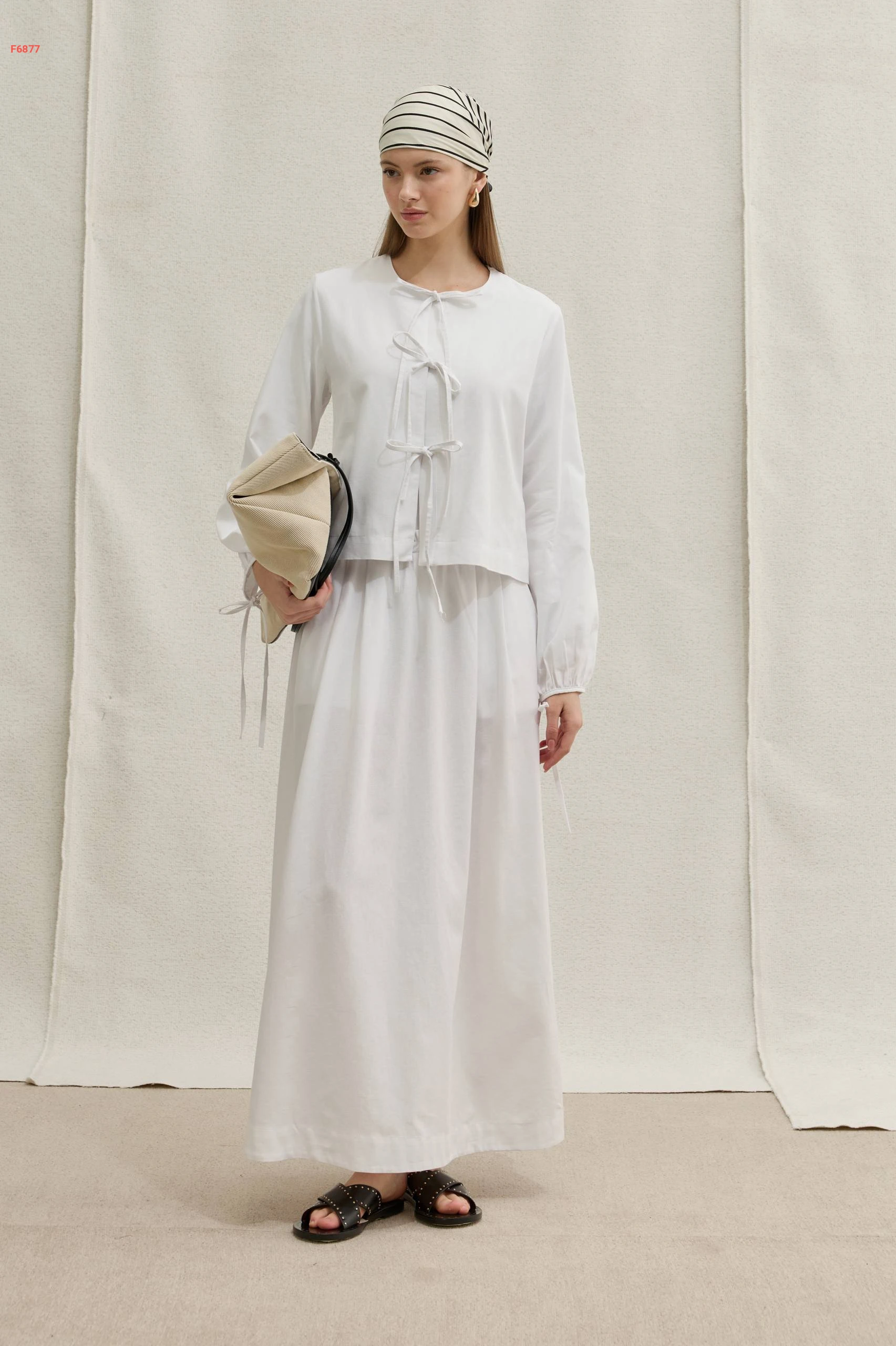 طقم مريح يتكون من بلوزة قصيرة مزينة بأربطة أمامية ناعمة مع تنورة طويلة منسدلة،