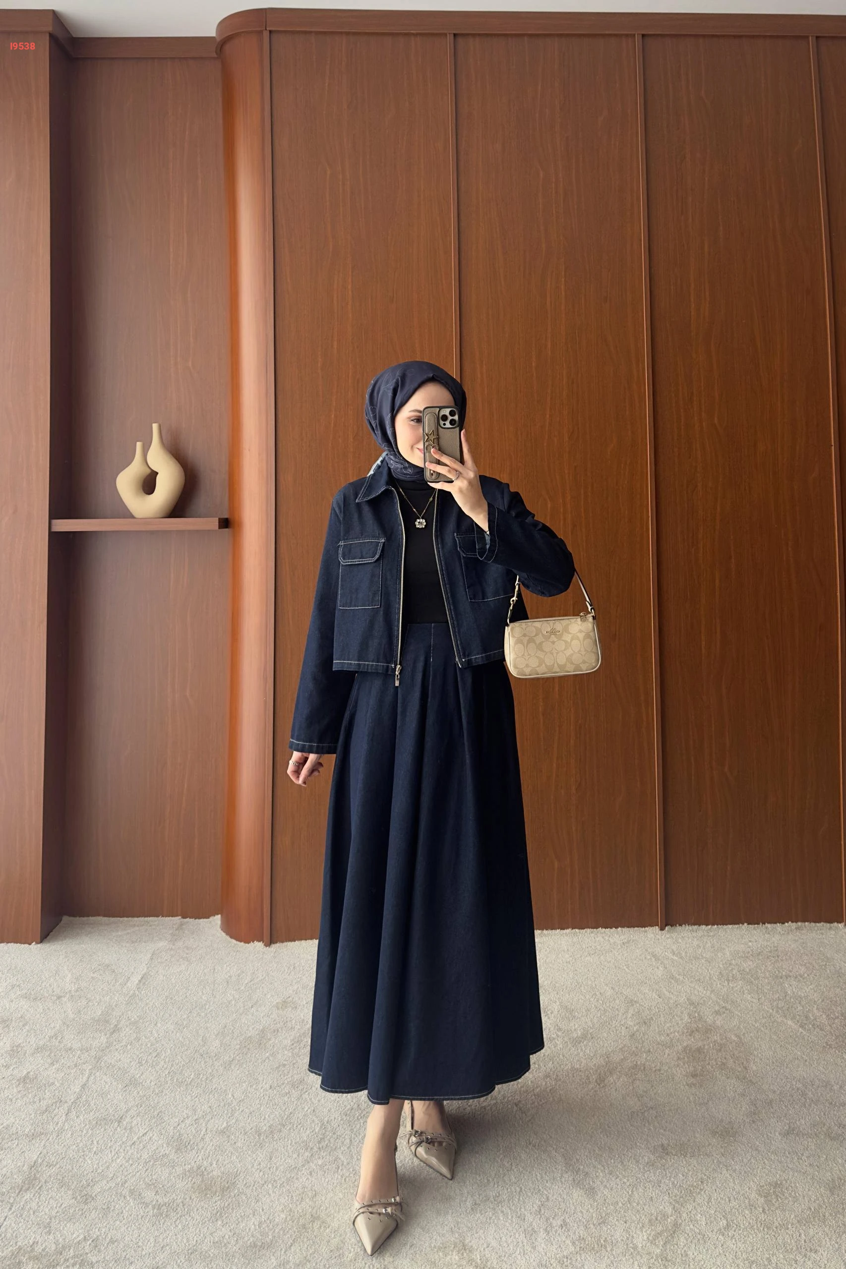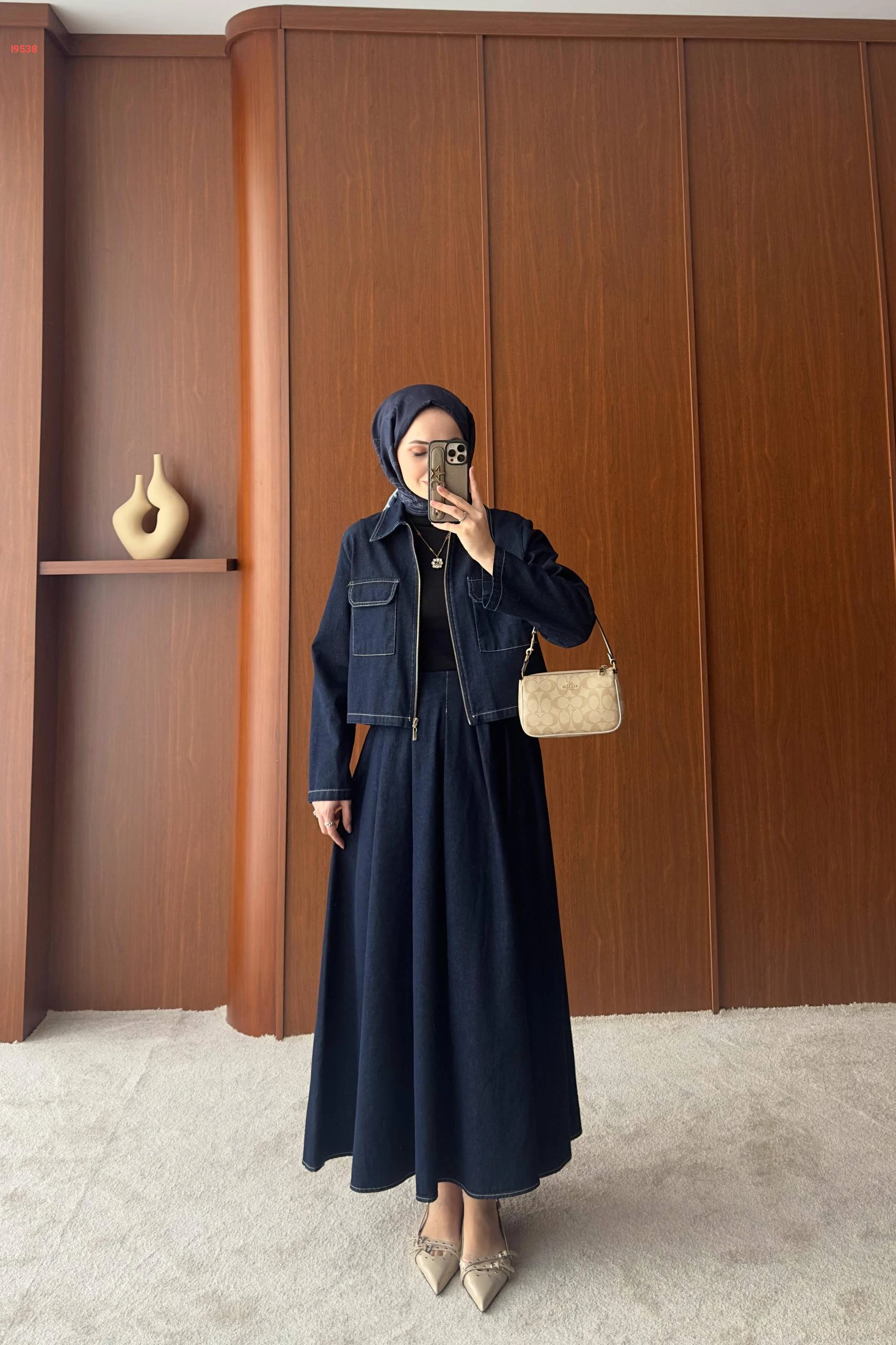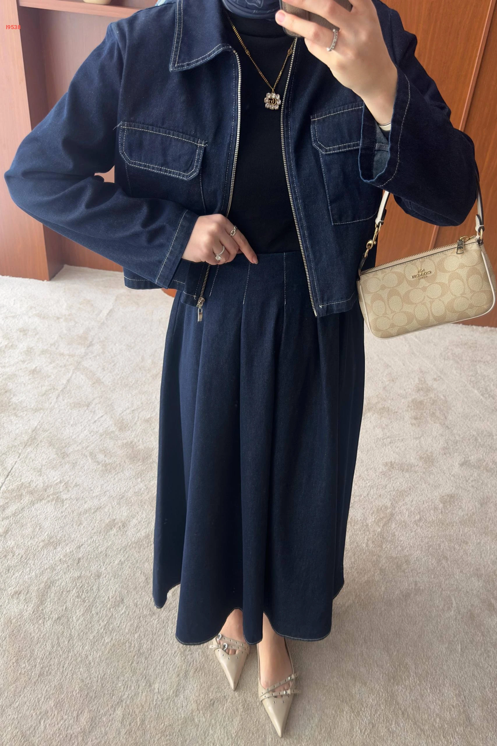 طقم جيز داكن جاكيت قصير بسحاب وتنورة "كلوش" طويلة،