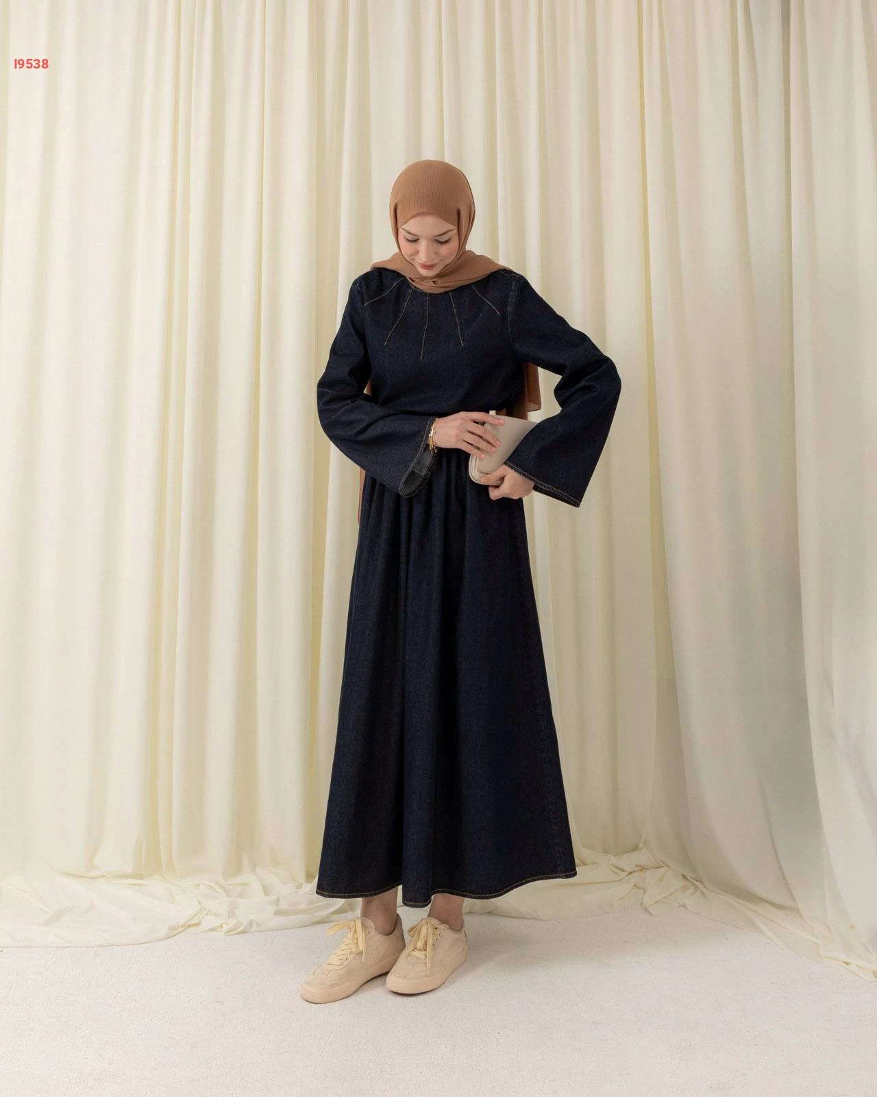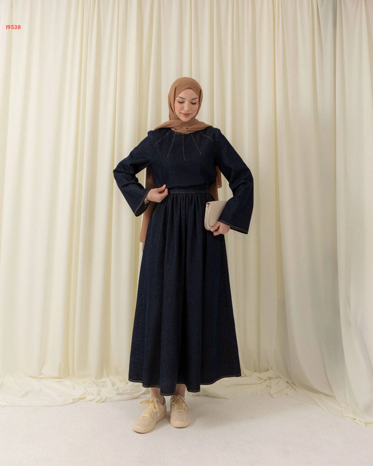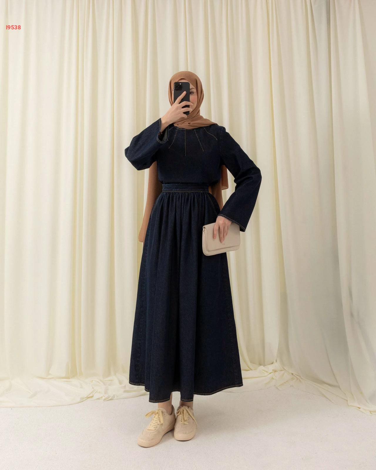 طقم جينز داكن يتألف من بلوزة بتفاصيل تطريز شعاعية وأكمام واسعة مع تنورة طويلة بكسرات ناعمة