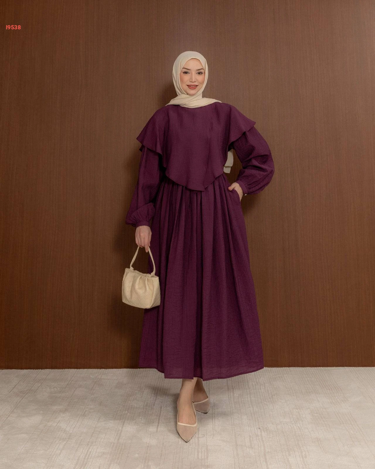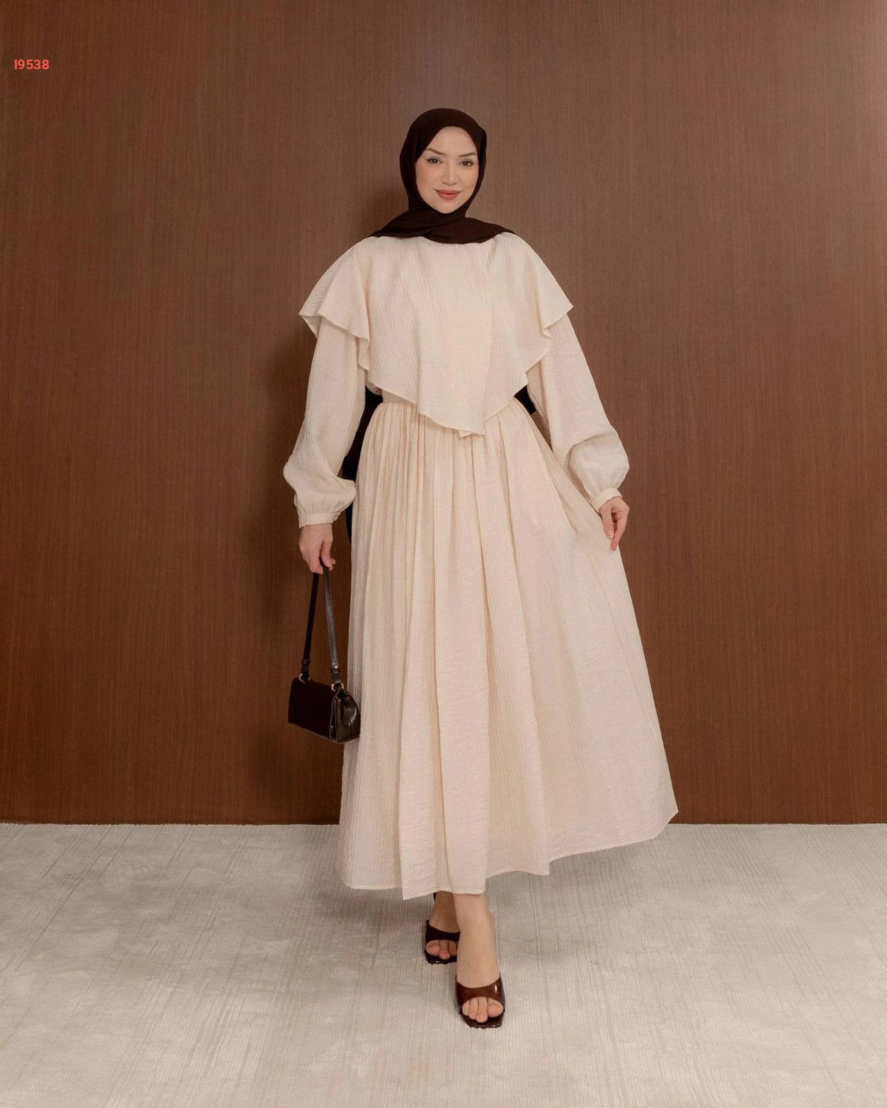 فستان من قماش الكريب المكسر، يتميز بكشكشة عريضة على الصدر وأكمام طويلة مزمومة