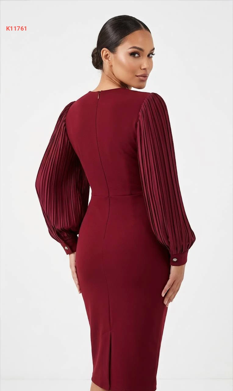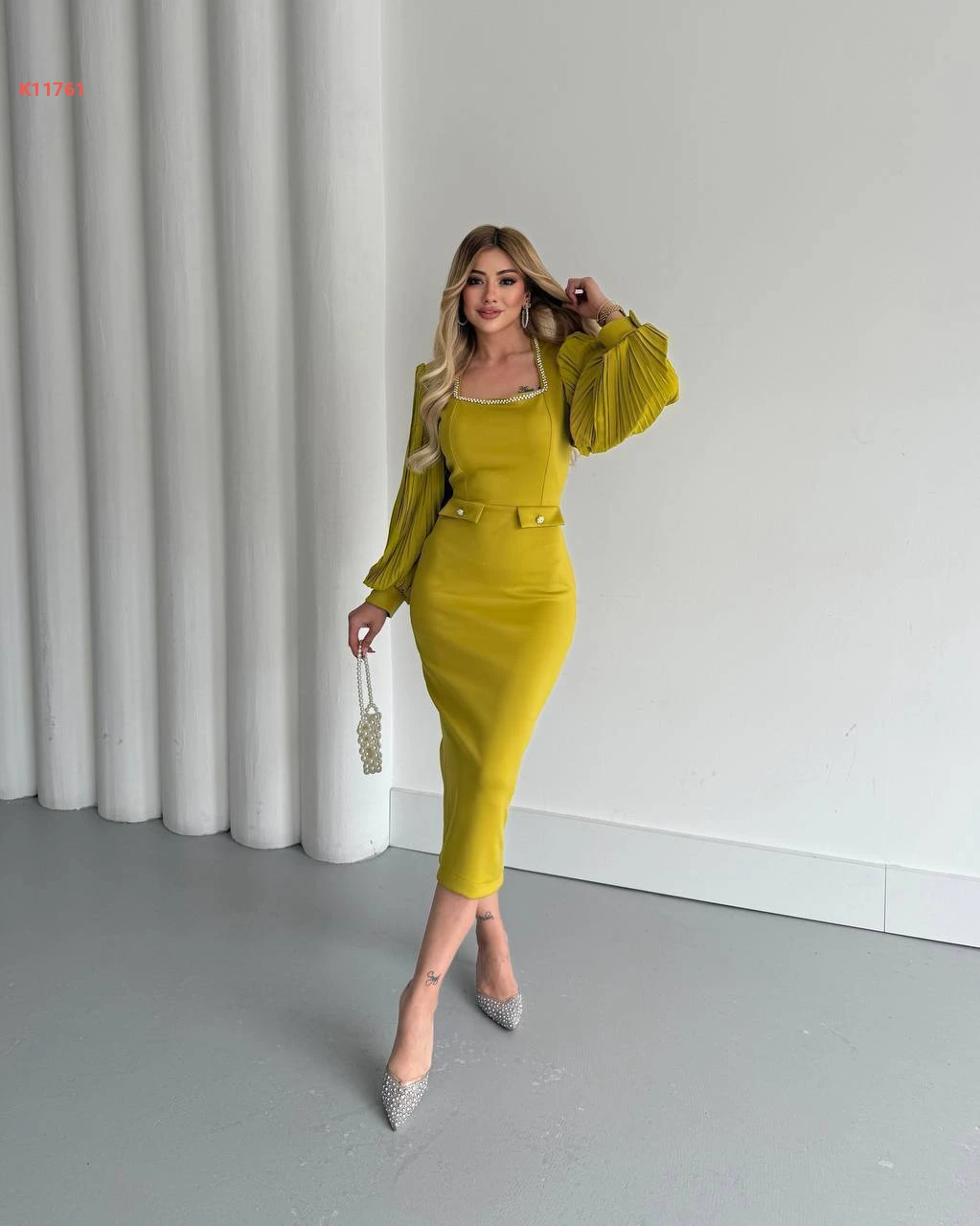 فستان بأكمام بليسيه وياقة مطرز أحجار