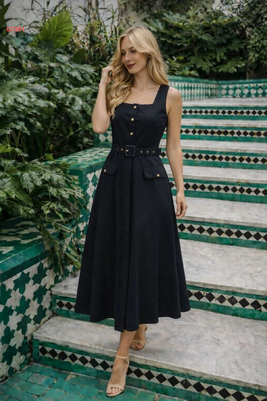 فستان كلوش حفر بأزرار وحزام
