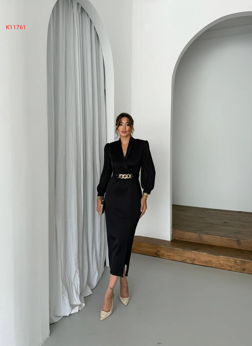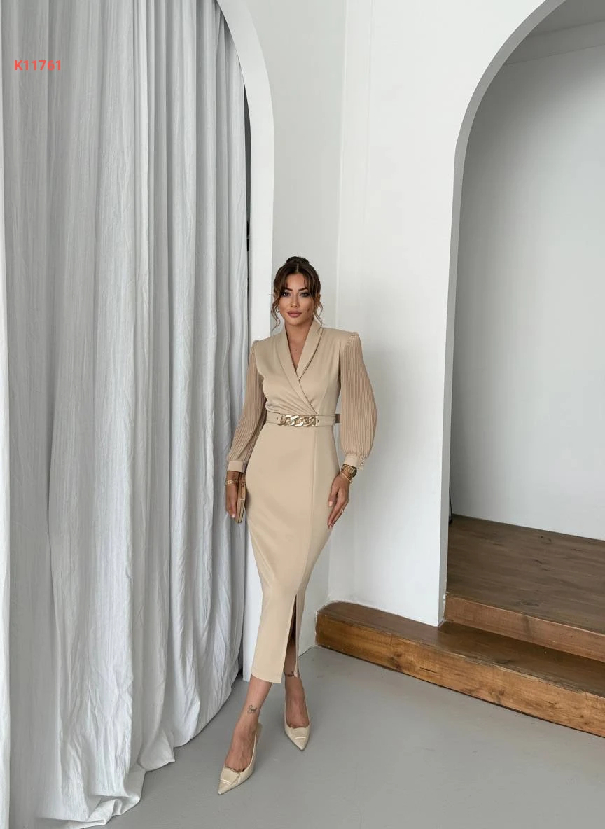فستان رسمي بأكمام بليسيه وحزام باكسسوار