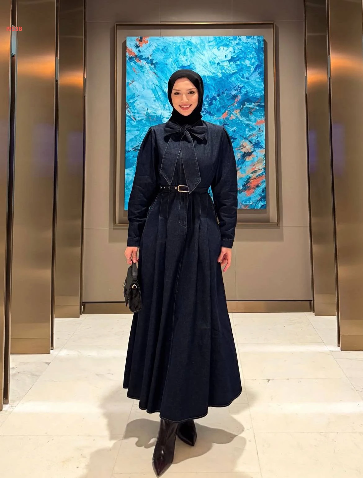 فستان جينز طويل بقصة كلوش واسعة، وياقة مربوطة على شكل "فيونكة" وحزام خصر