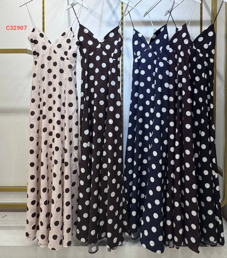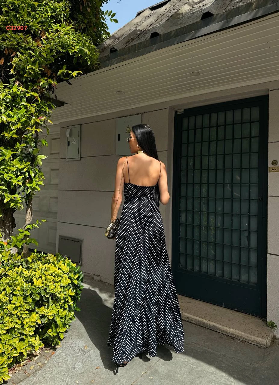 فستان طويل منقط بحمالات رفيعة