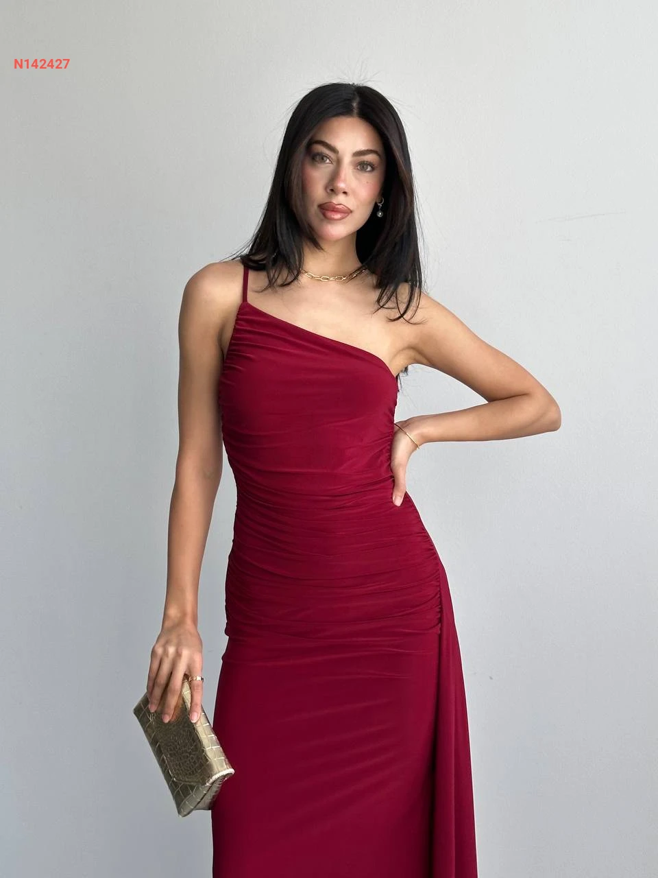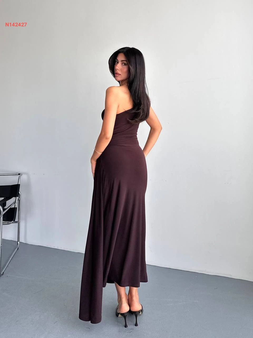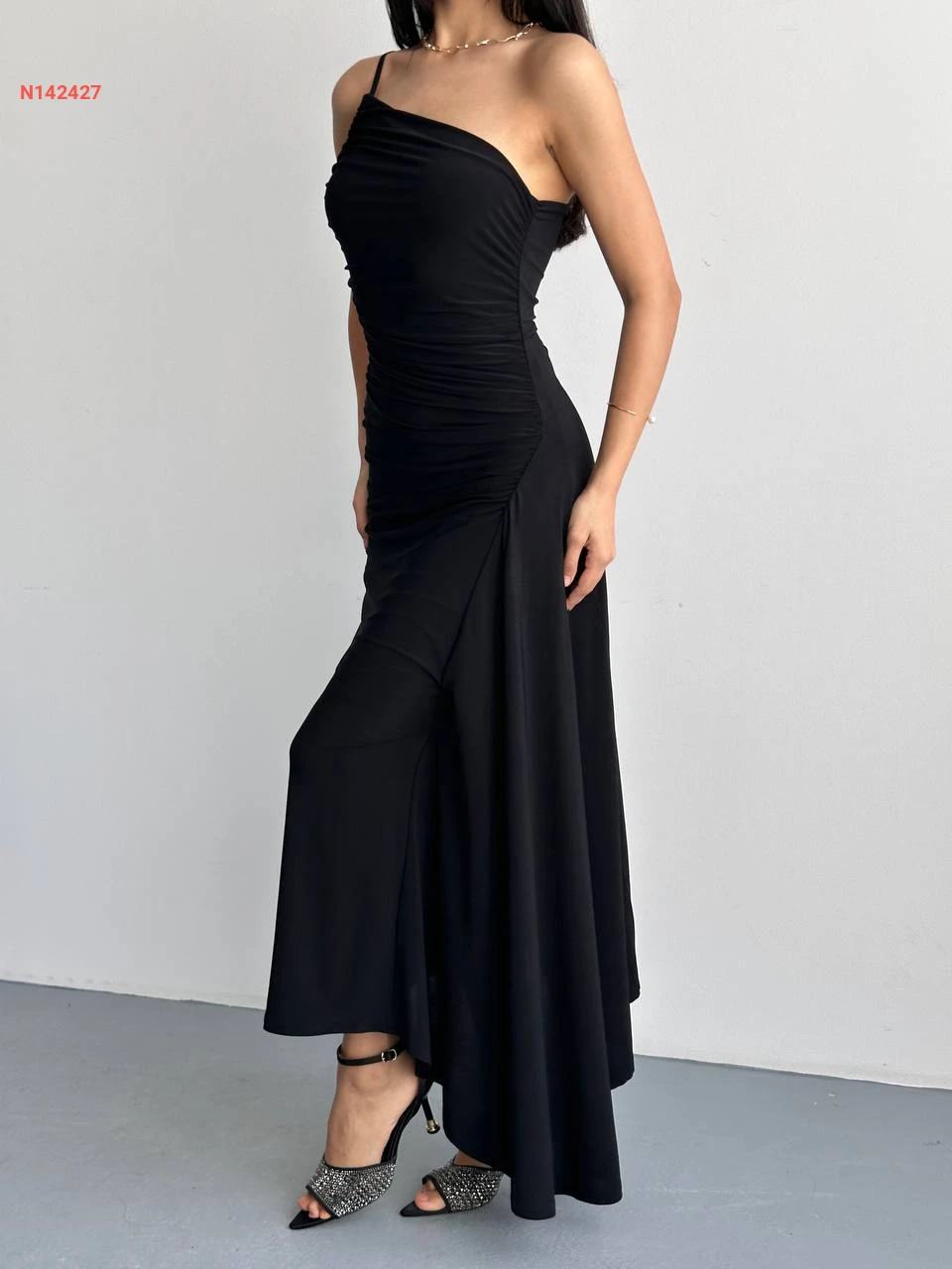 فستان طويل مجمع بحمالات رفيعة