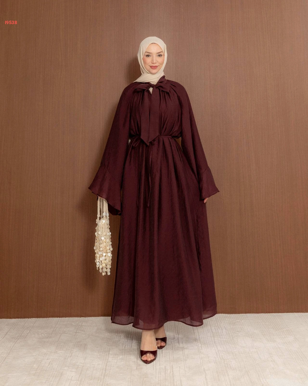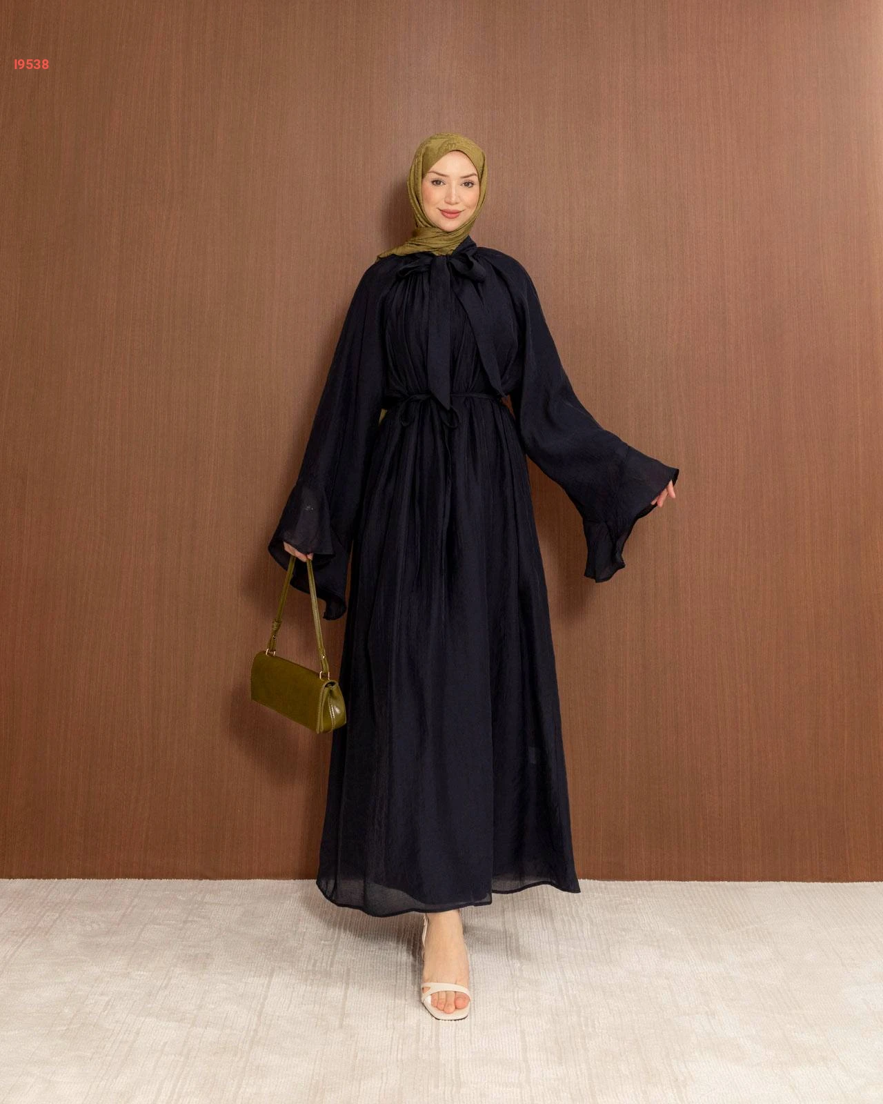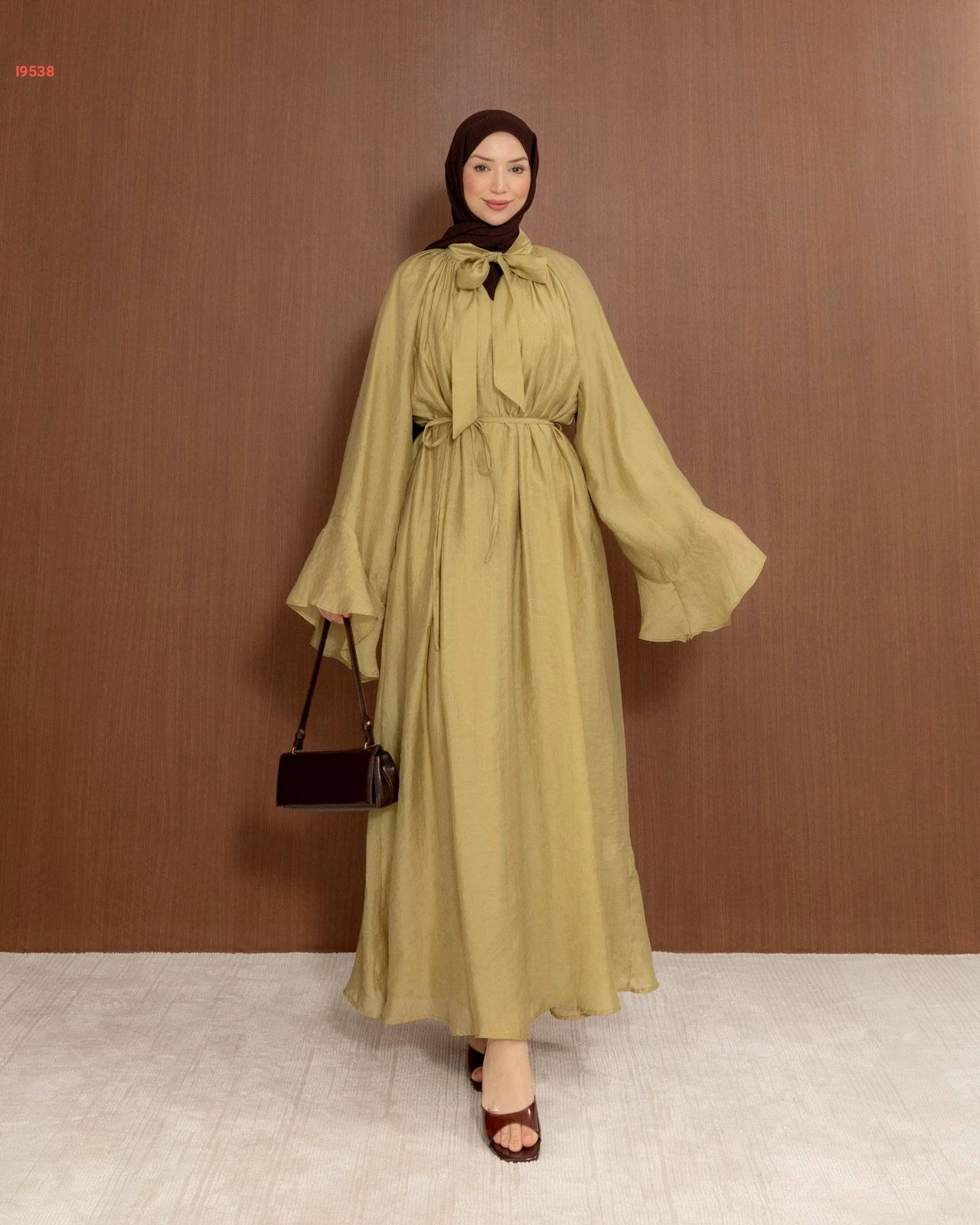 فستان طويل من قماش الشيفون اللامع يتميز بأكمام واسعة واسعة وياقة منسدلة أنيقة.