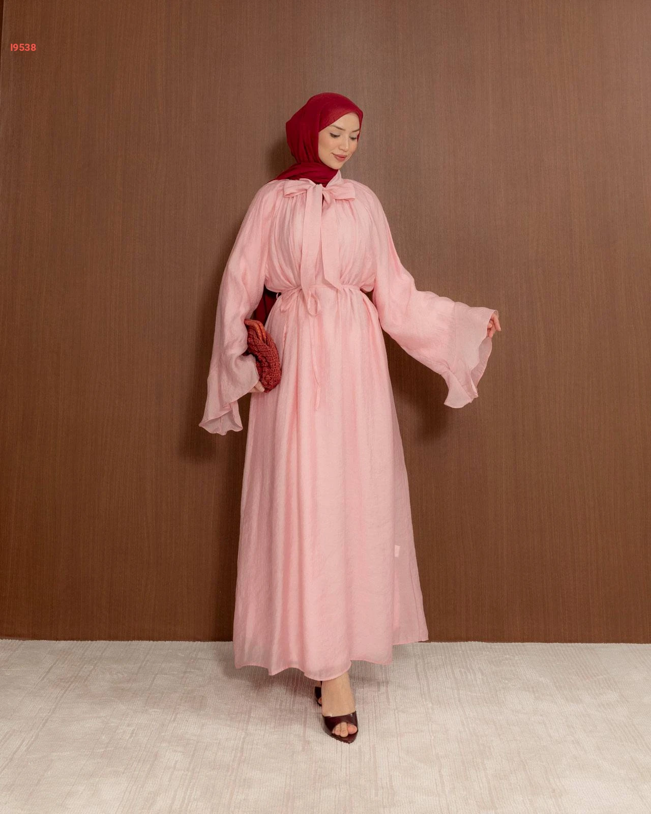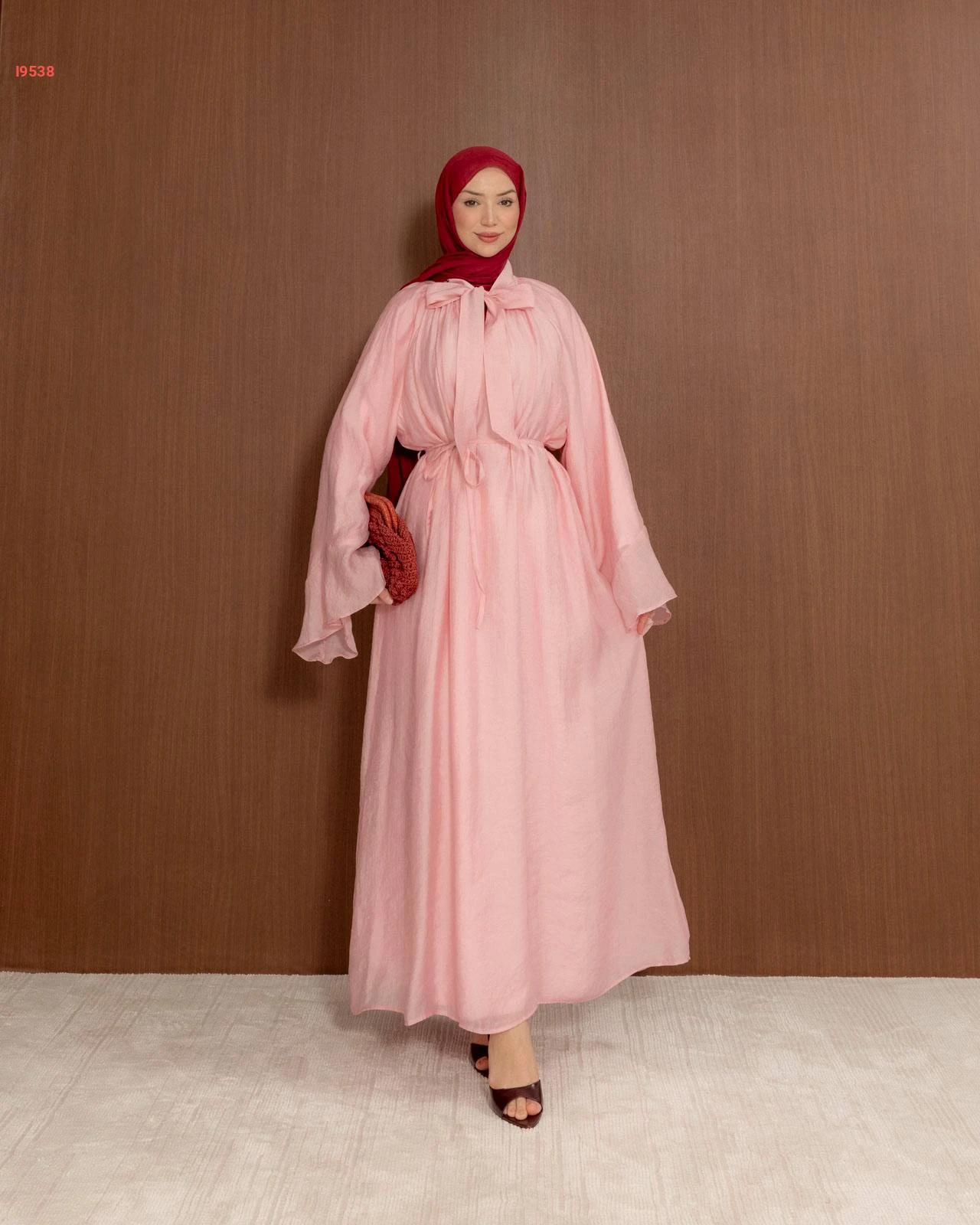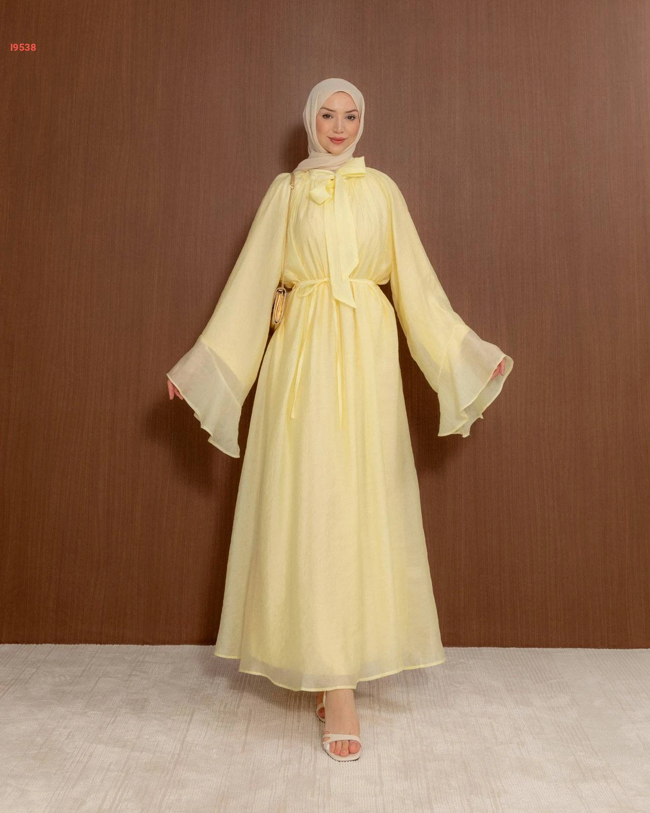 فستان طويل من قماش الشيفون اللامع يتميز بأكمام واسعة واسعة وياقة منسدلة أنيقة.