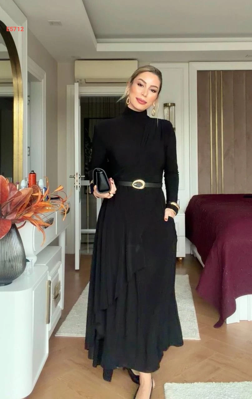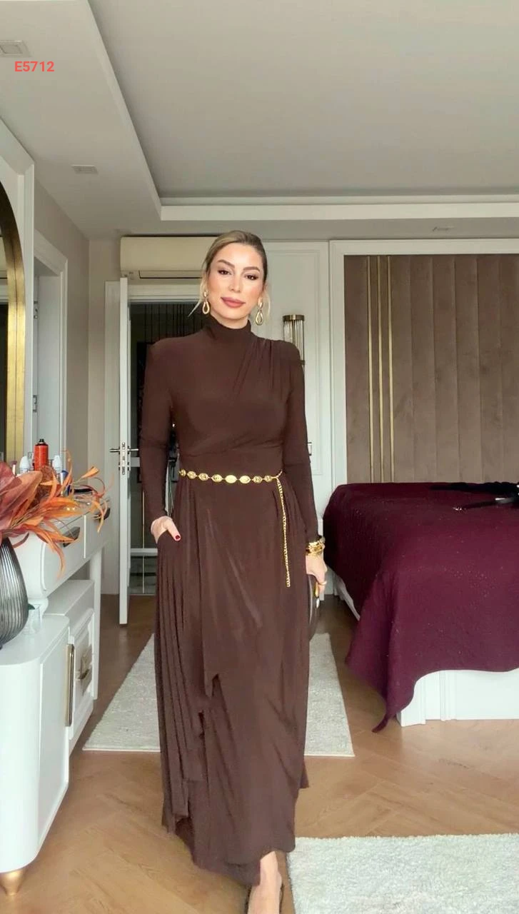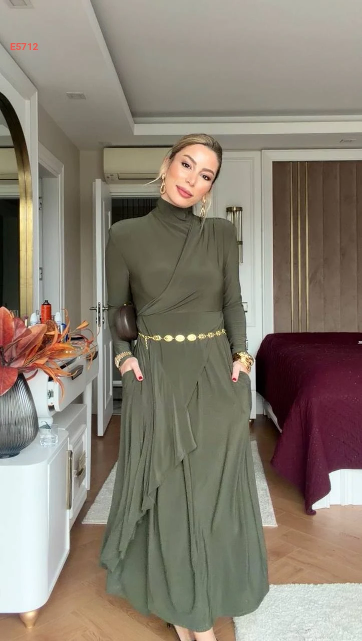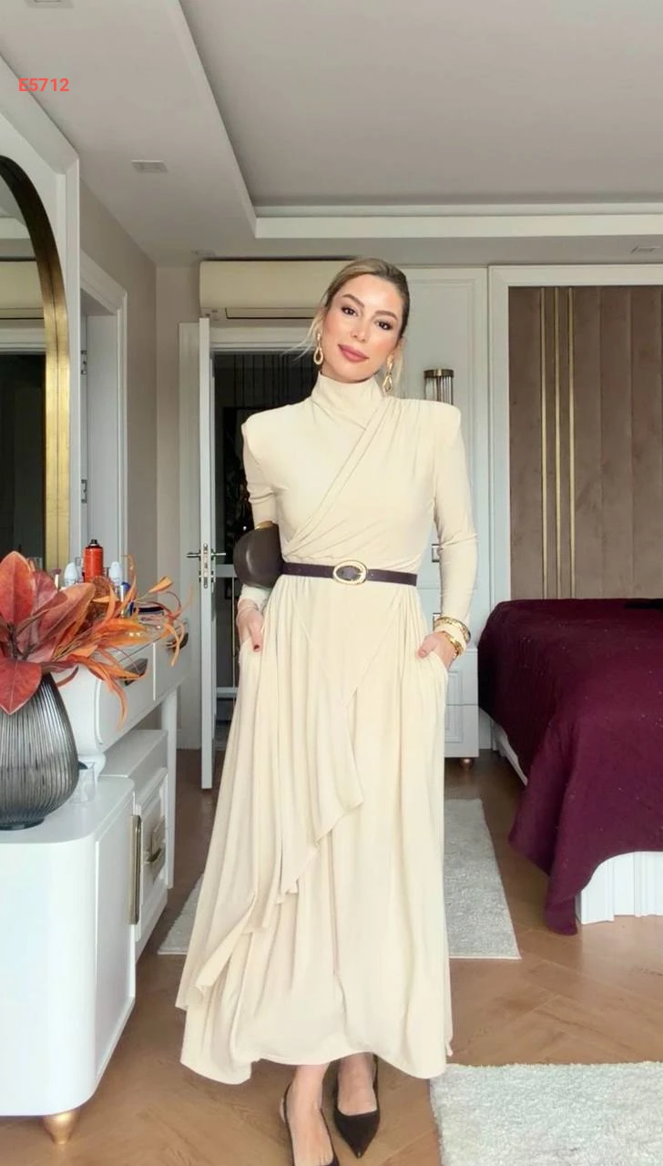فستان طويل بياقة عالية وجيوب