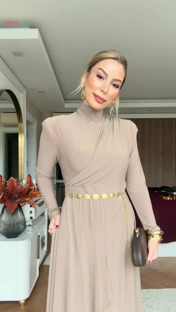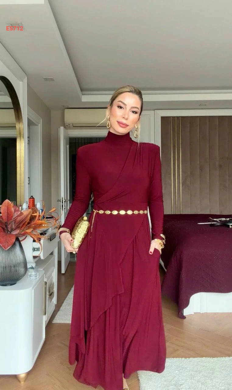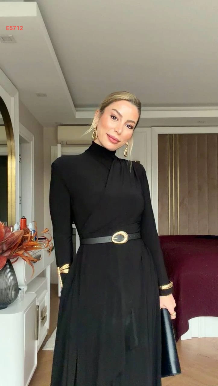 فستان طويل بياقة عالية وجيوب