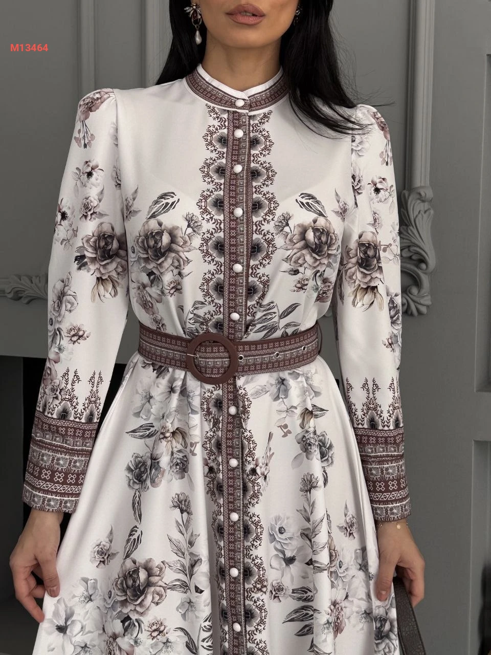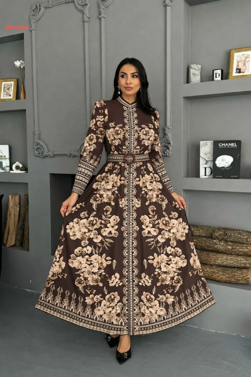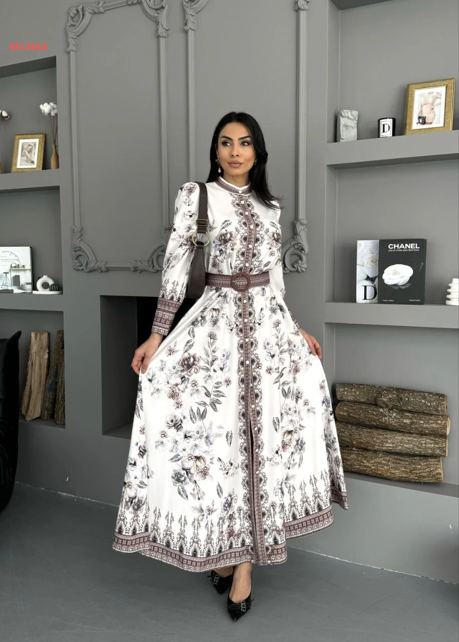 فستان طويل منقوش بأزرار وحزام