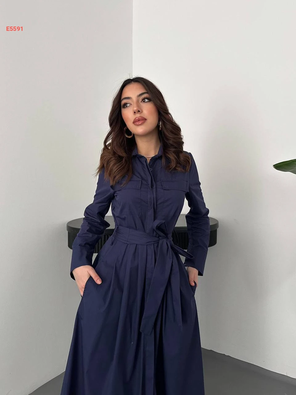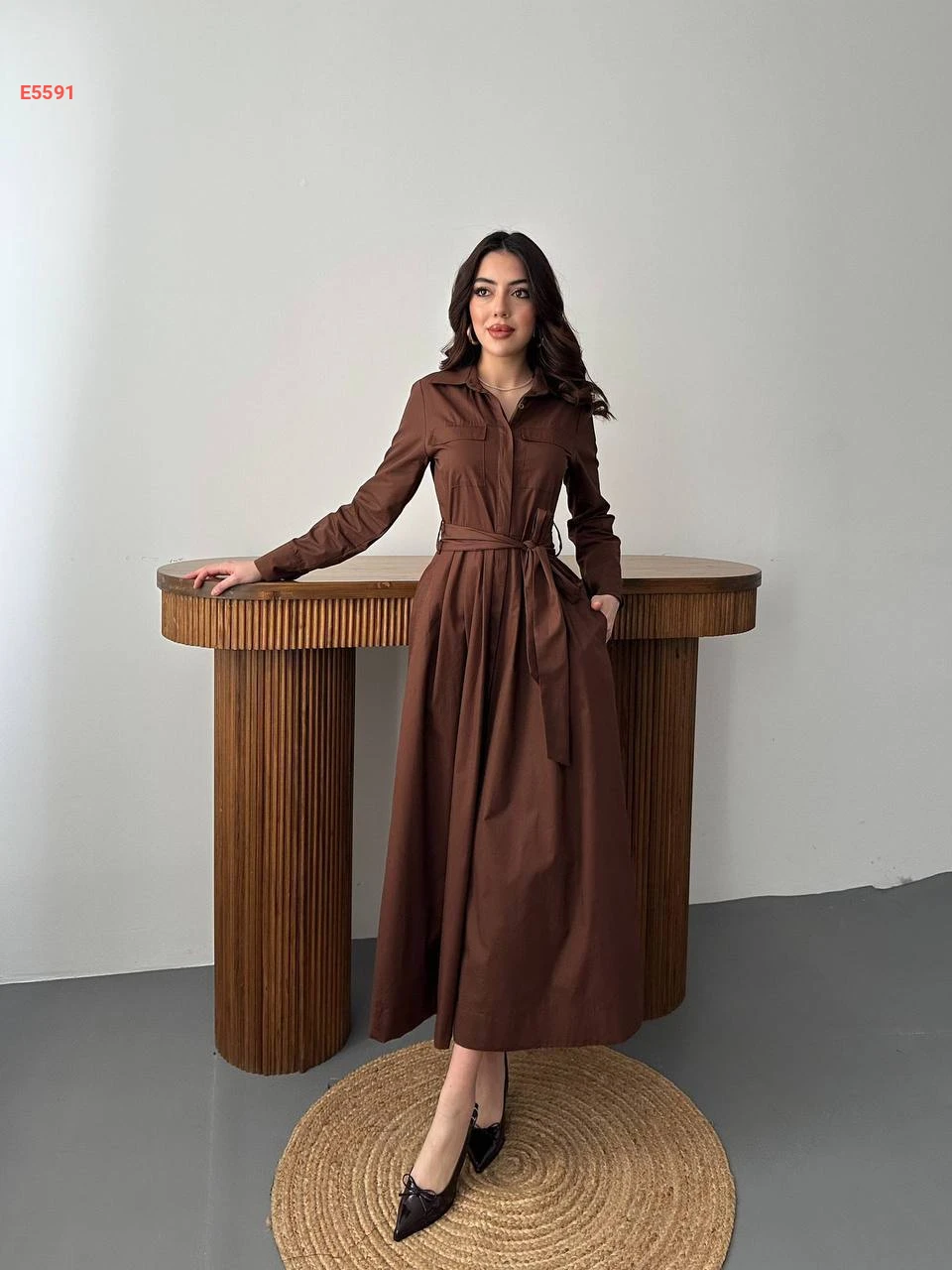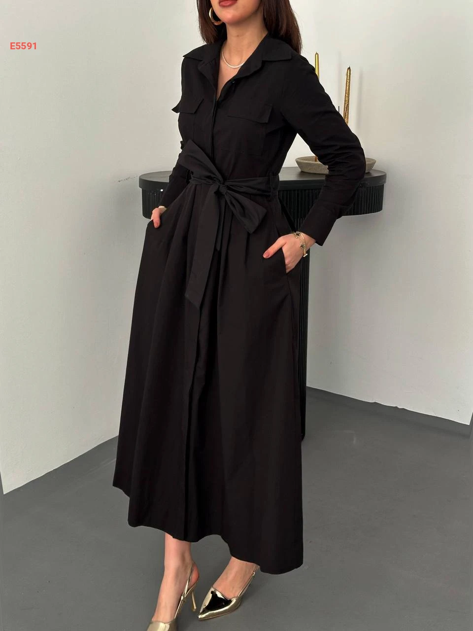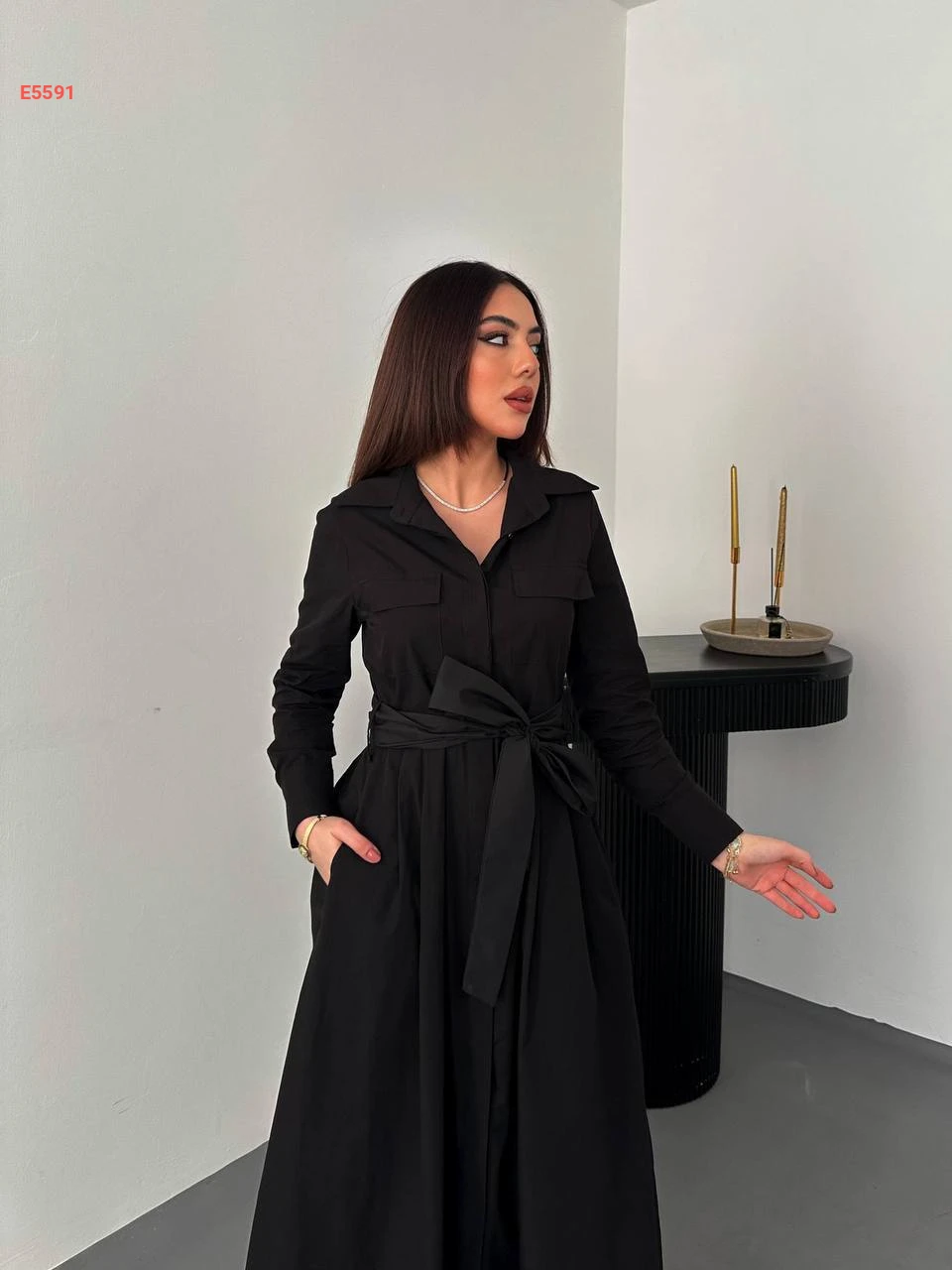 فستان طويل بأزرار وزنار