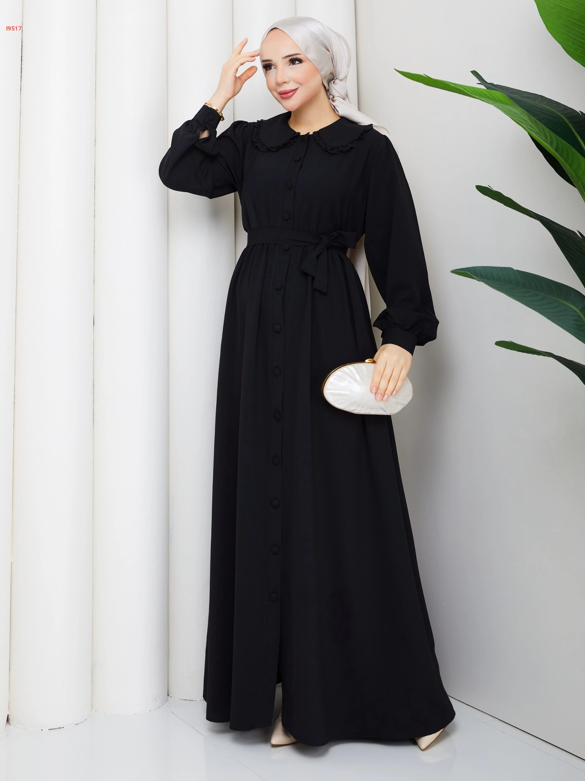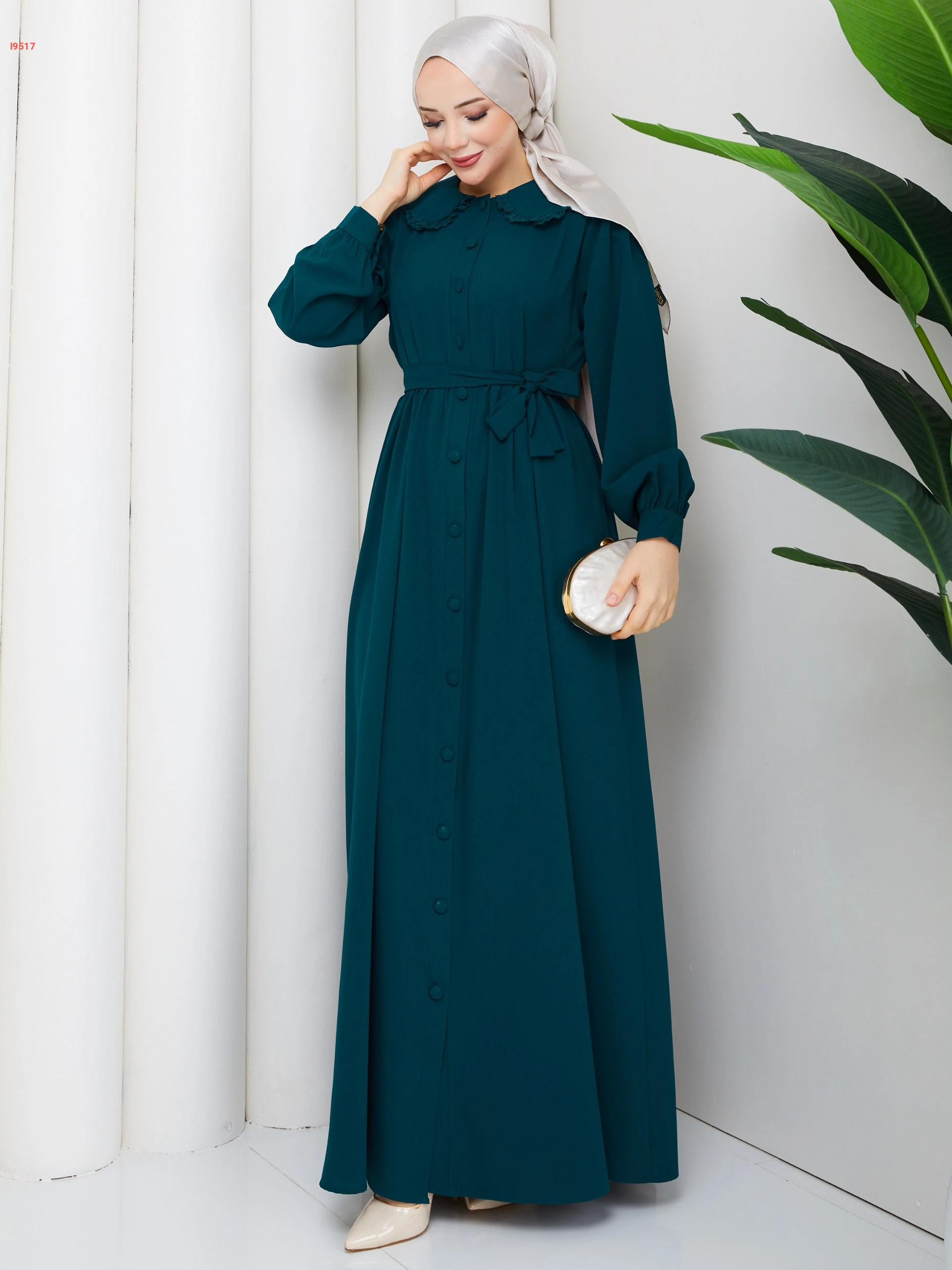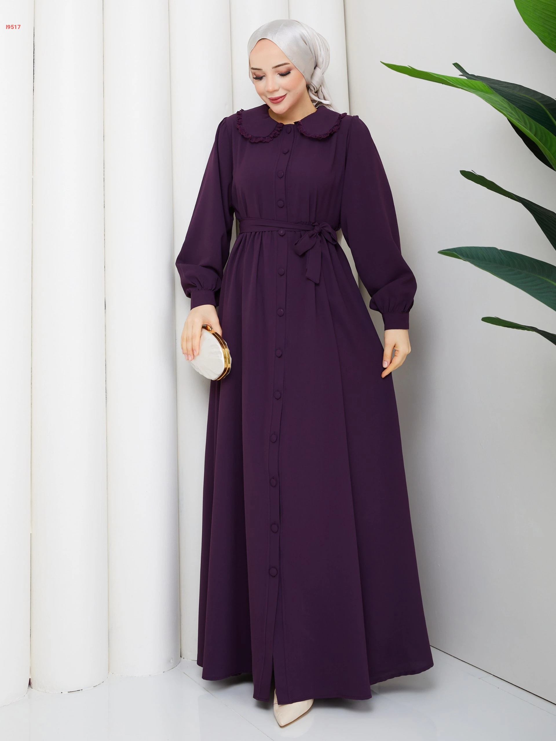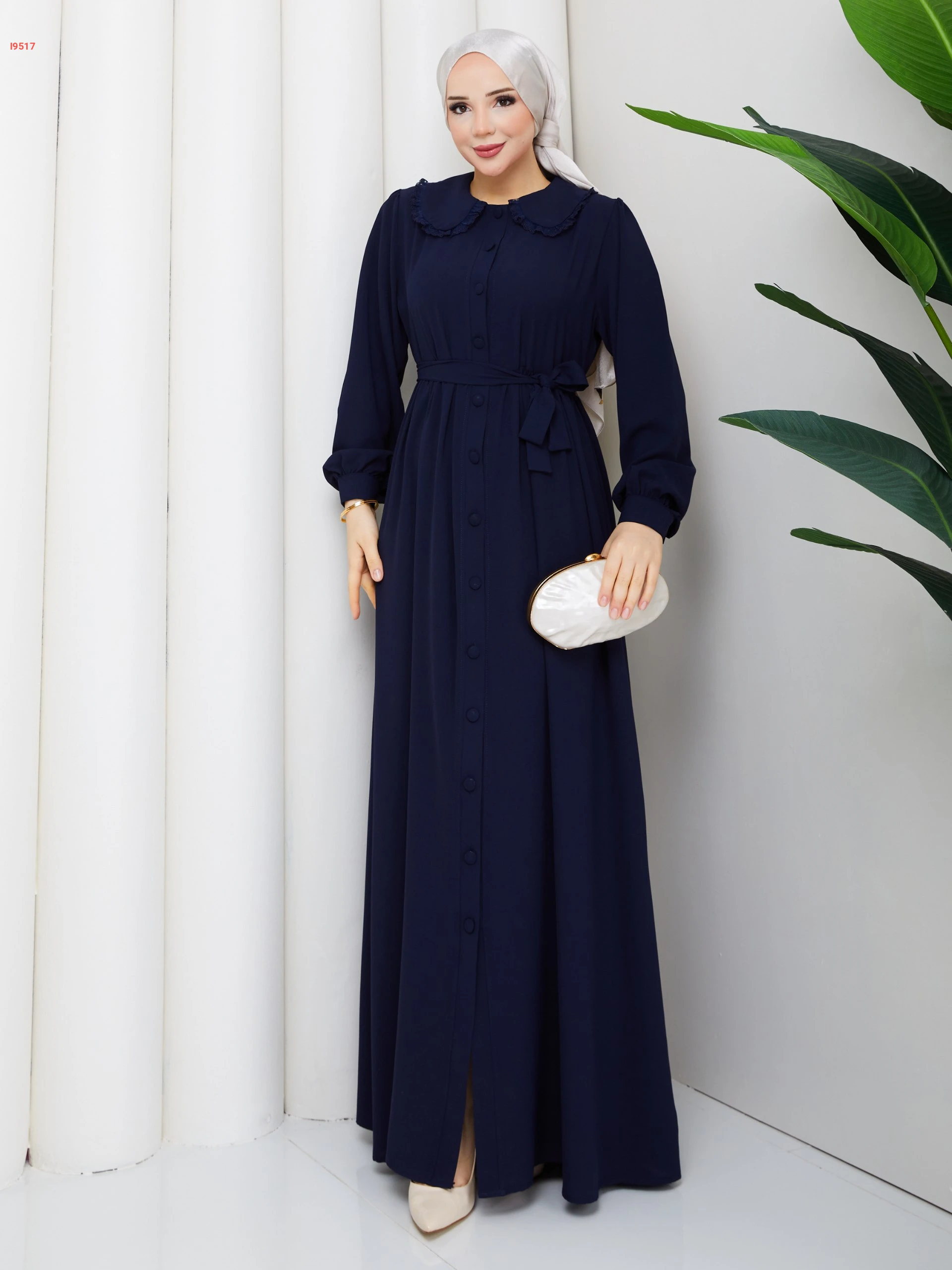 فستان طويل بأزرار وزنار