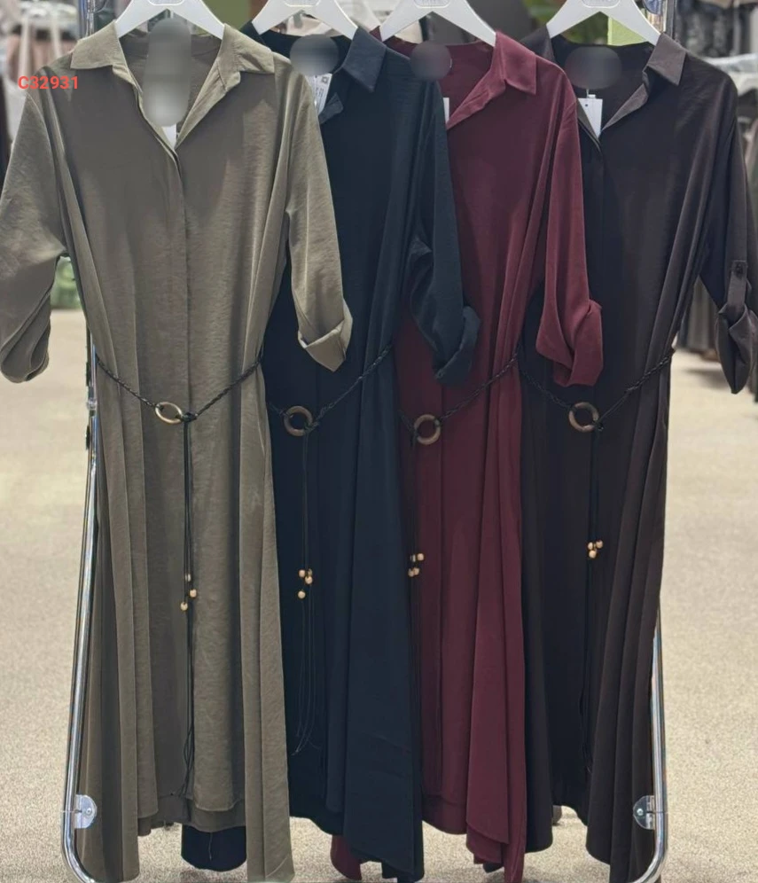 فستان طويل بأزرار وزنار