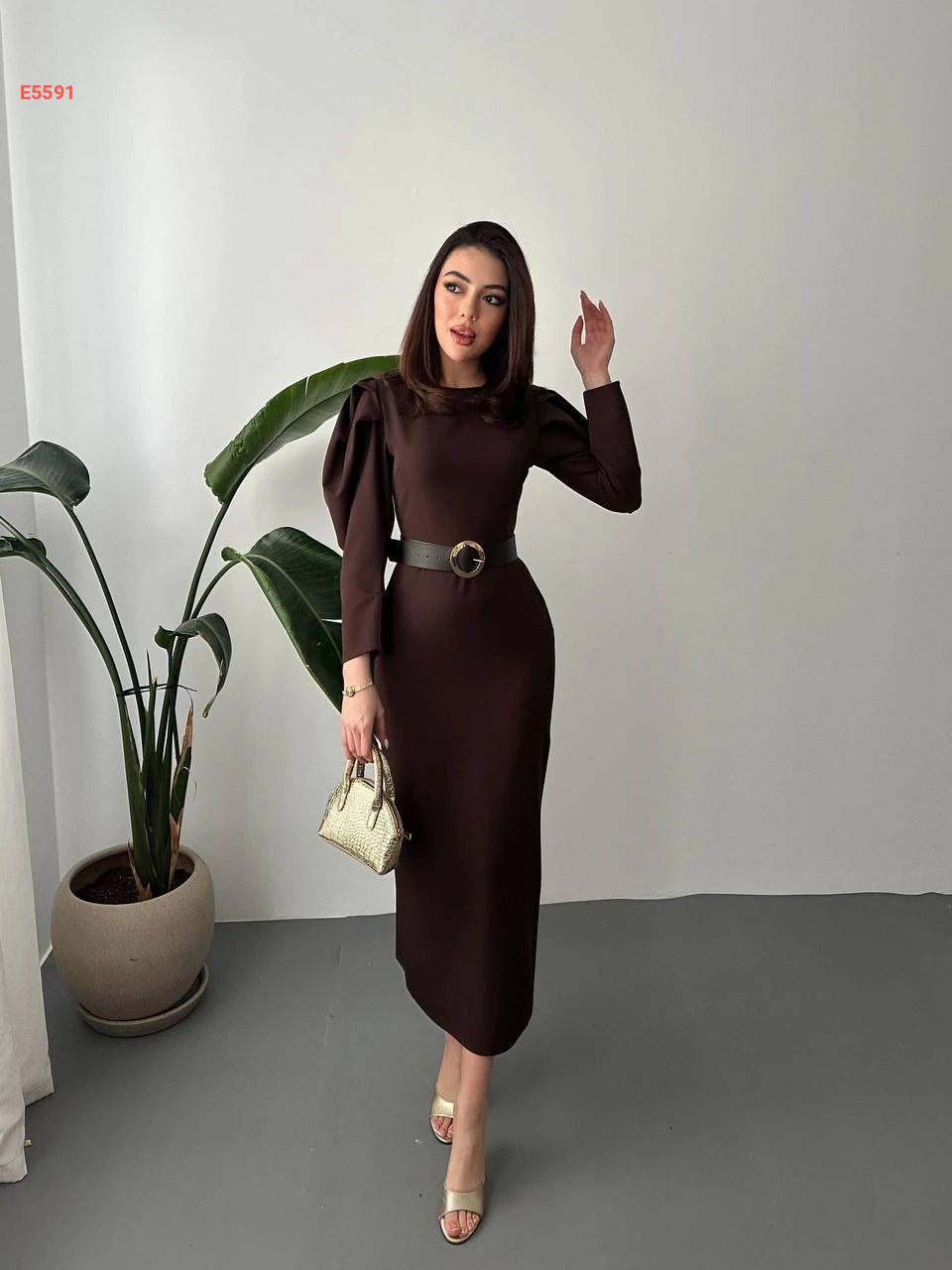 فستان طويل بأكمام مجمعة وحزام