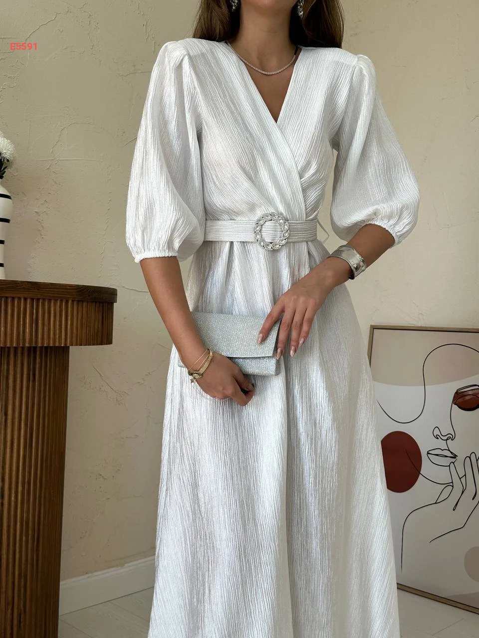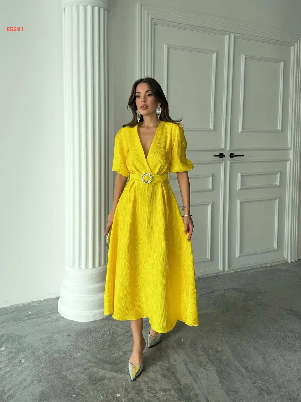 فستان طويل بأكمام قصيرة وحزام
