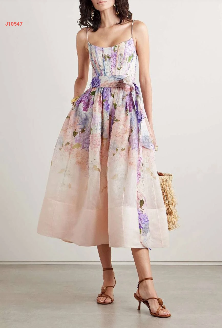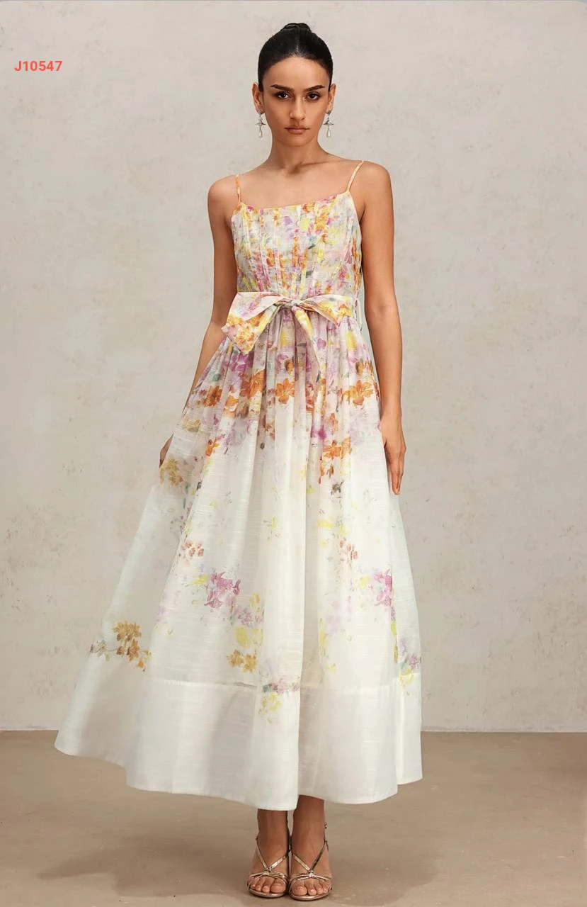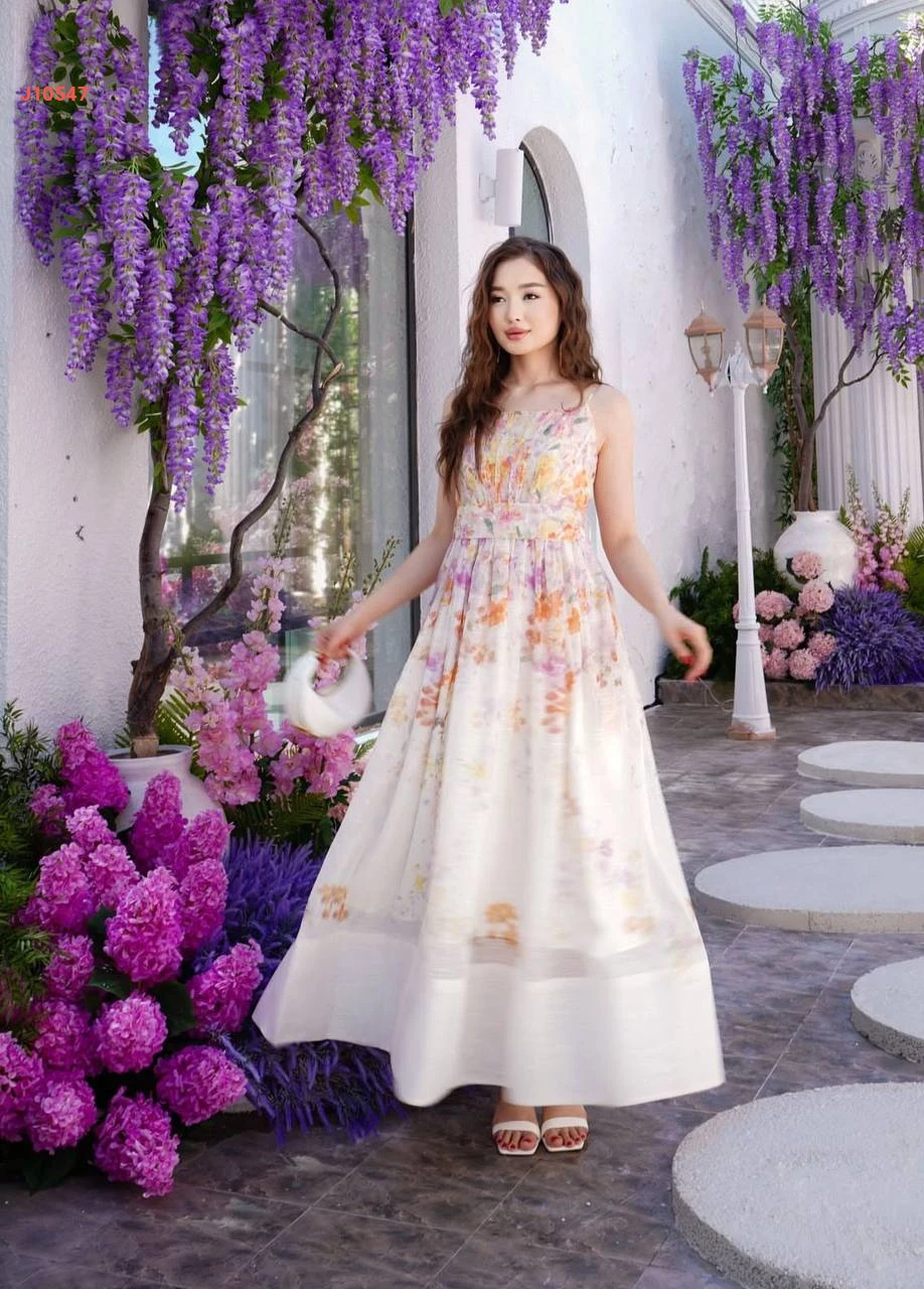 فستان طويل منقوش بحمالات رفيعة